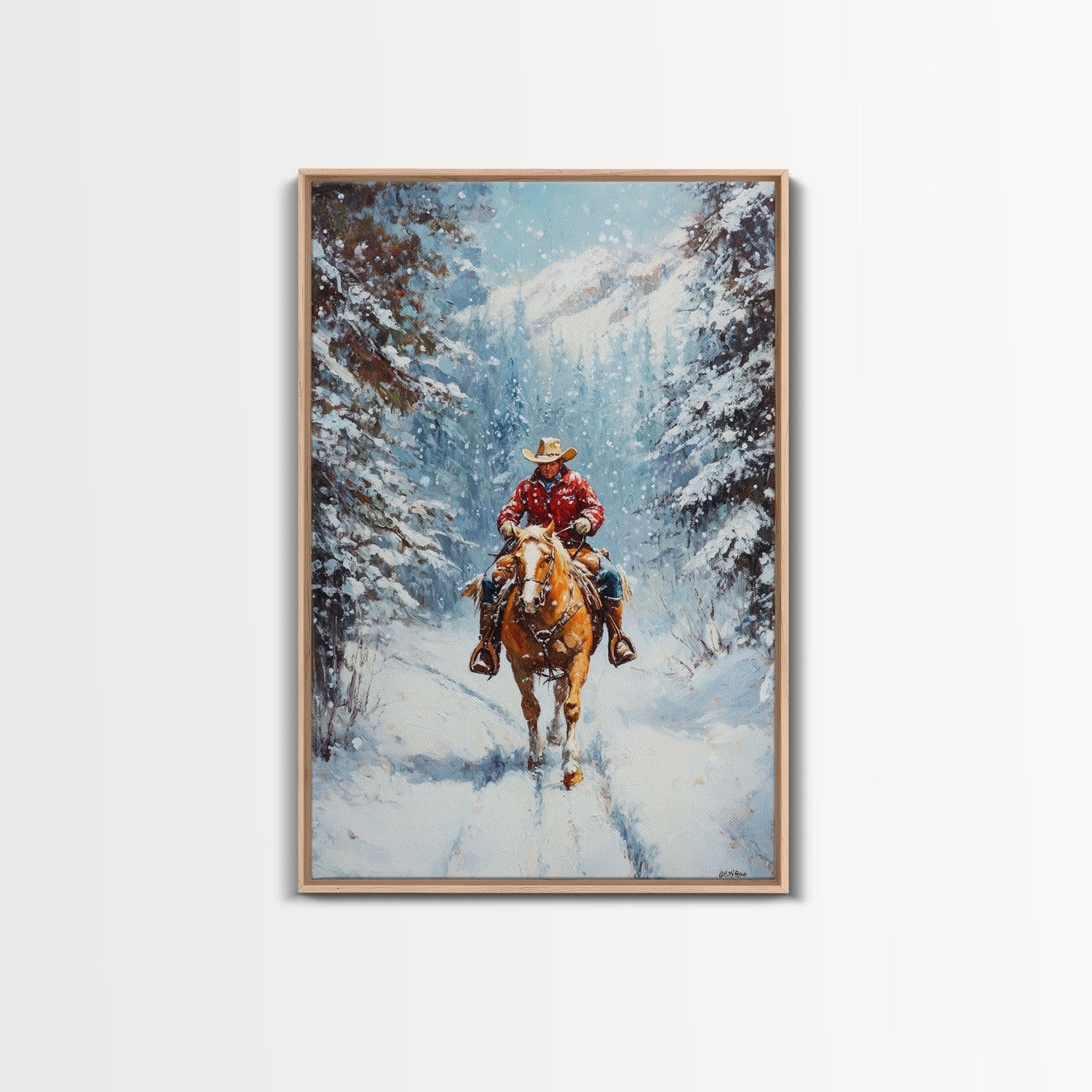 Cowboy Walking Through Snowy Winter Forest Canvas Print, Western Christmas Art Gift, Holiday Wall Decor, Rustic Art, Framed Canvas Print