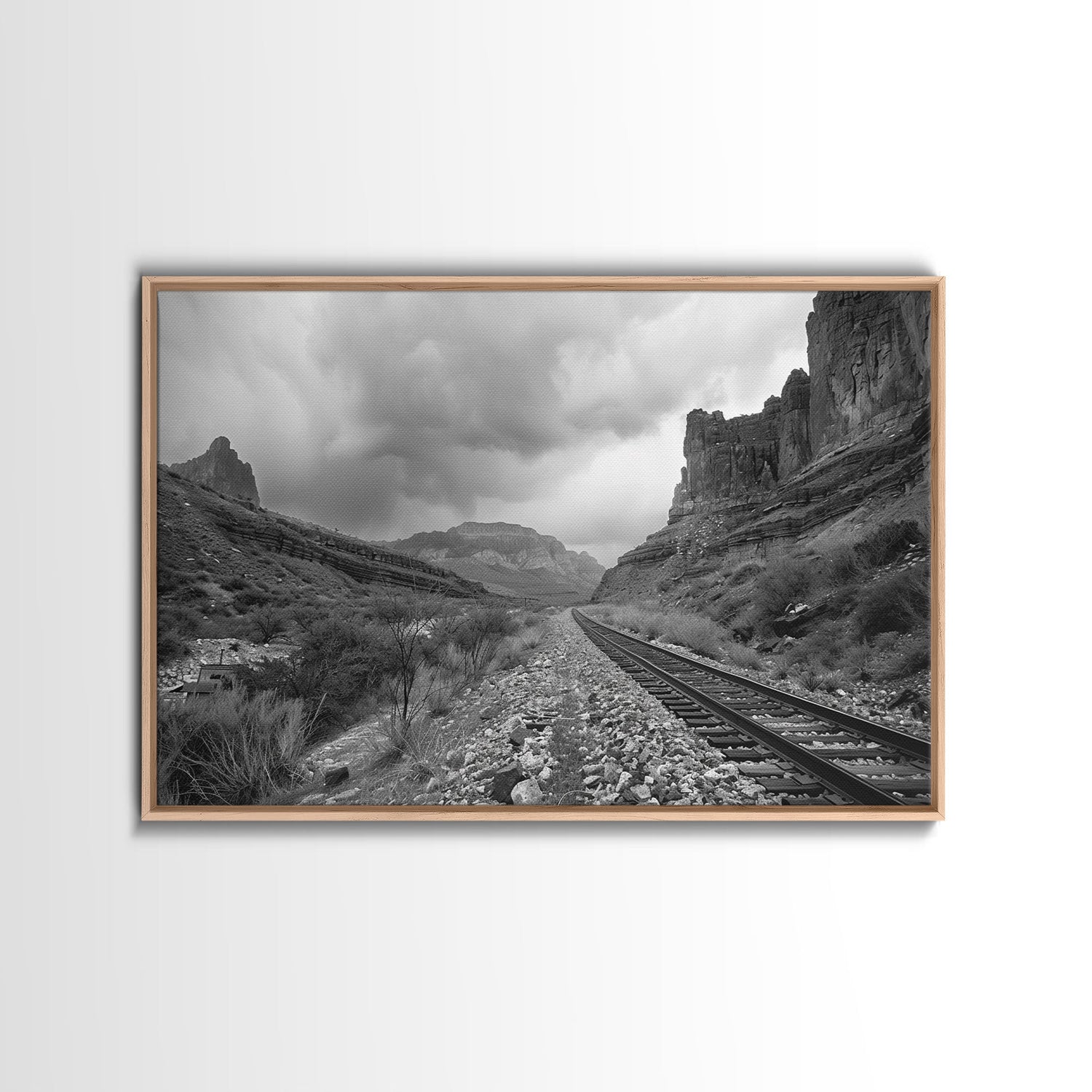The Train Tracks, Framed Canvas Print, Black and White Western Photography, Wild West Art, Metal Art, Metal Print, Rustic Country Wall Art