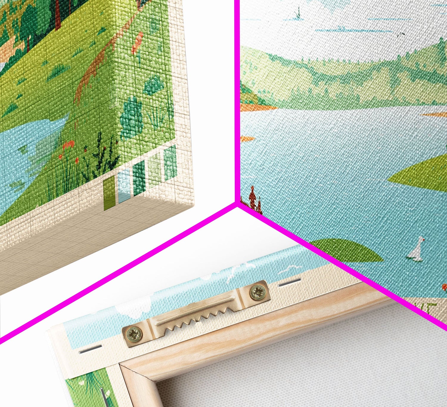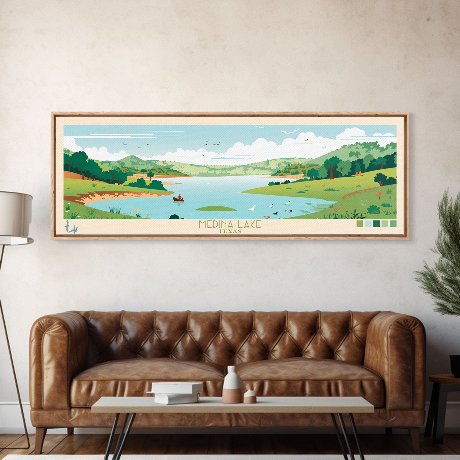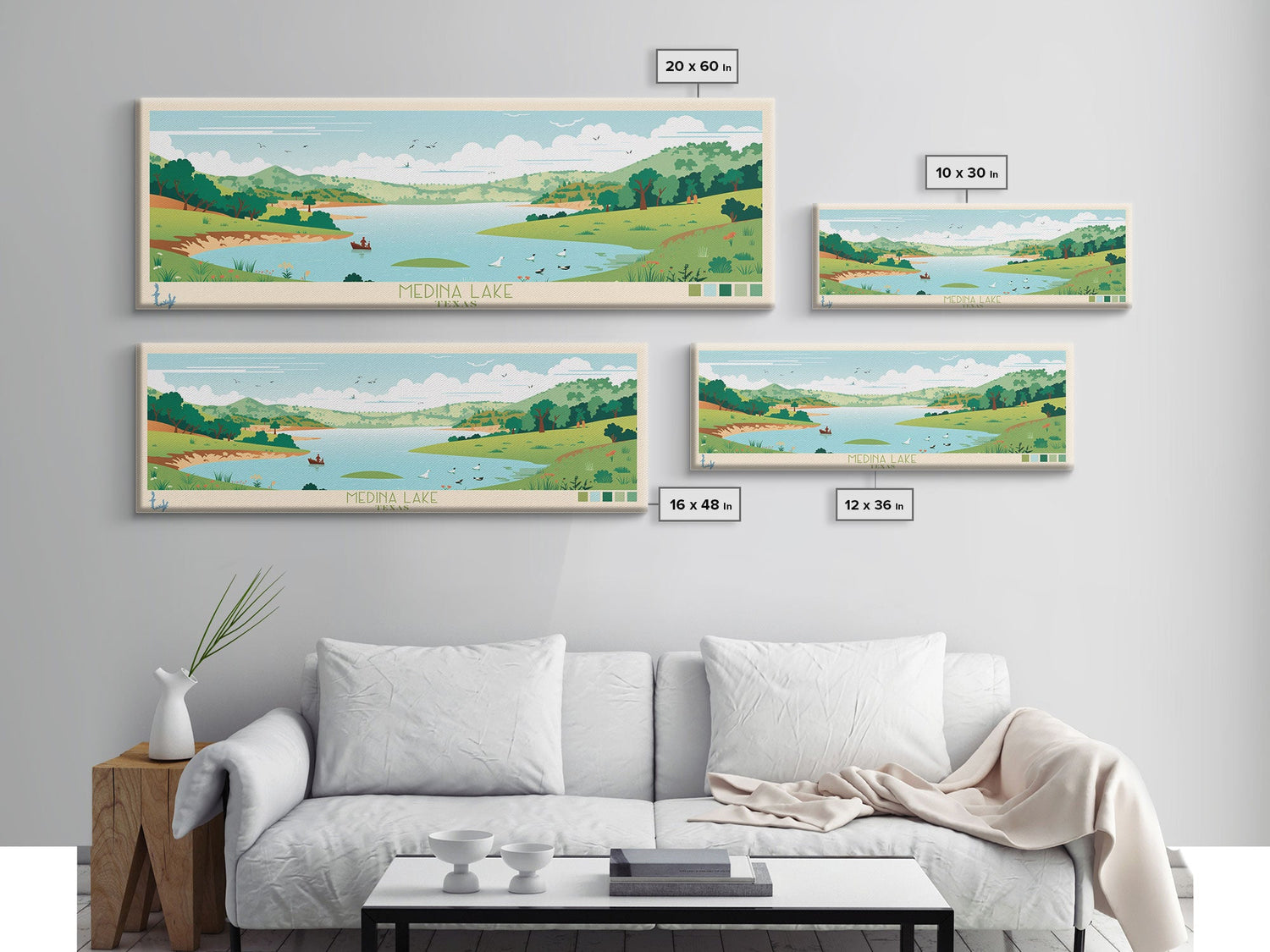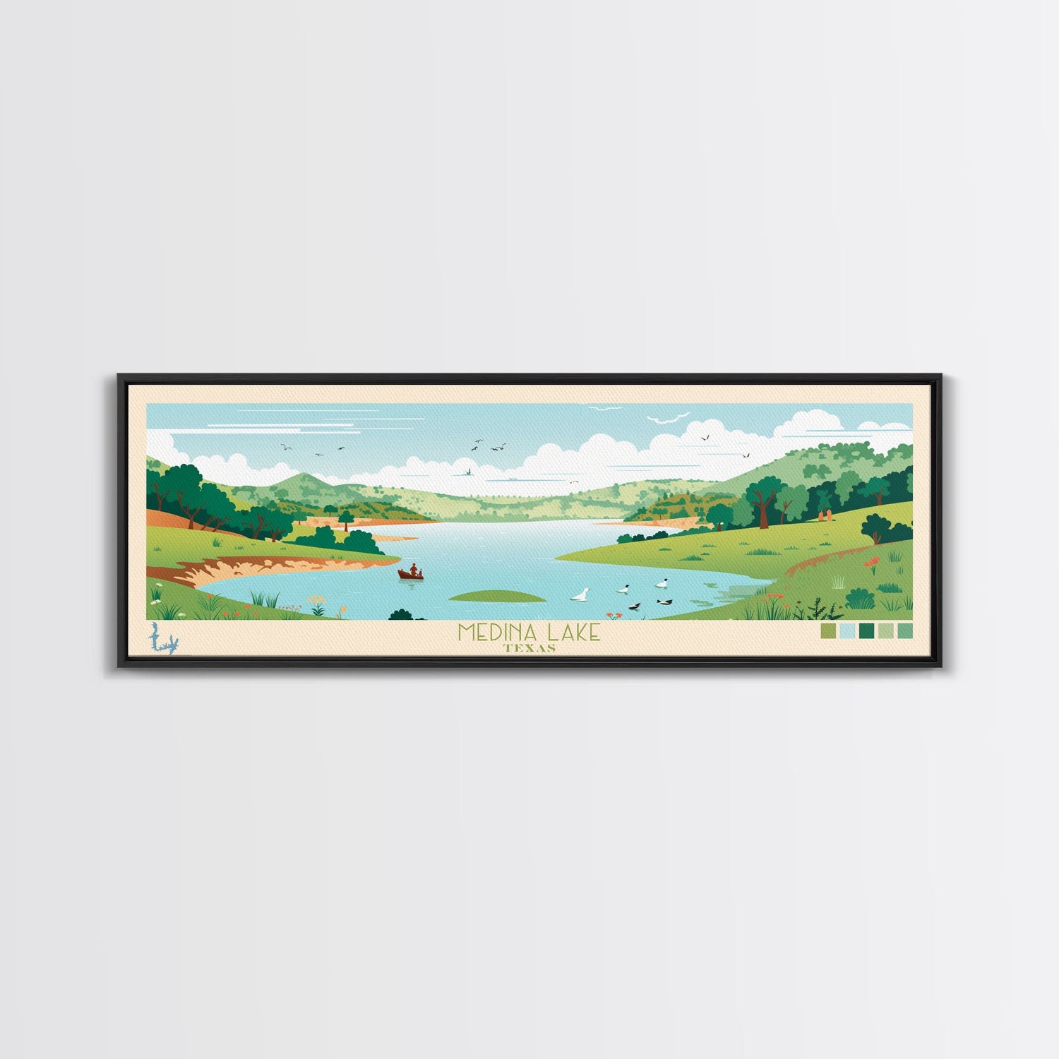 Medina Lake, Texas Panoramic Wall Art Framed Canvas Print, Midcentury Modern, Pop Art, Home Decor, Travel Poster, Bedroom Art