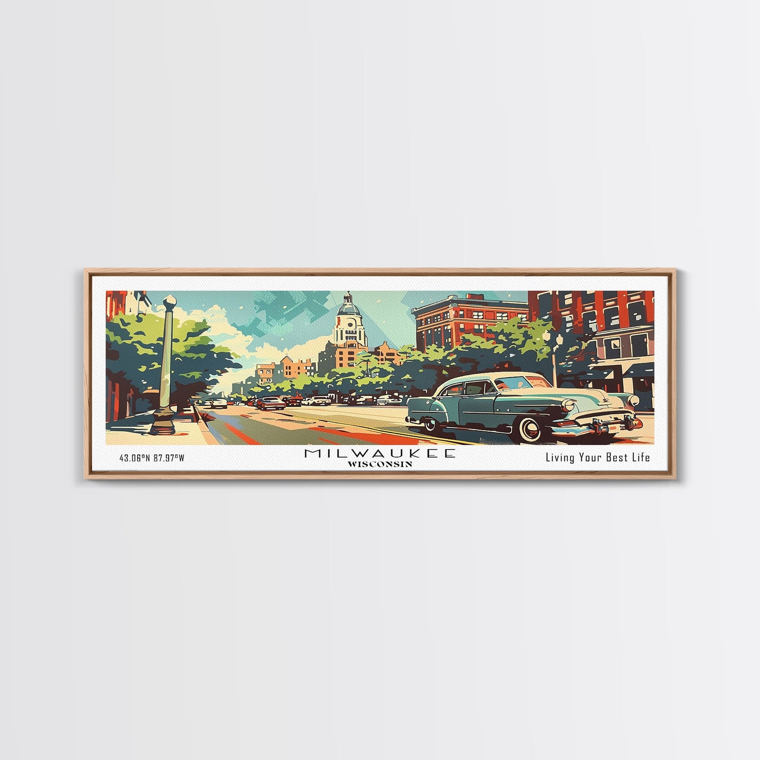 Milwaukee Wisconsin Panoramic Wall Art, Mid Century Modern Framed Canvas Print, Retro Pop Art Travel Poster, Living Room and Office Decor
