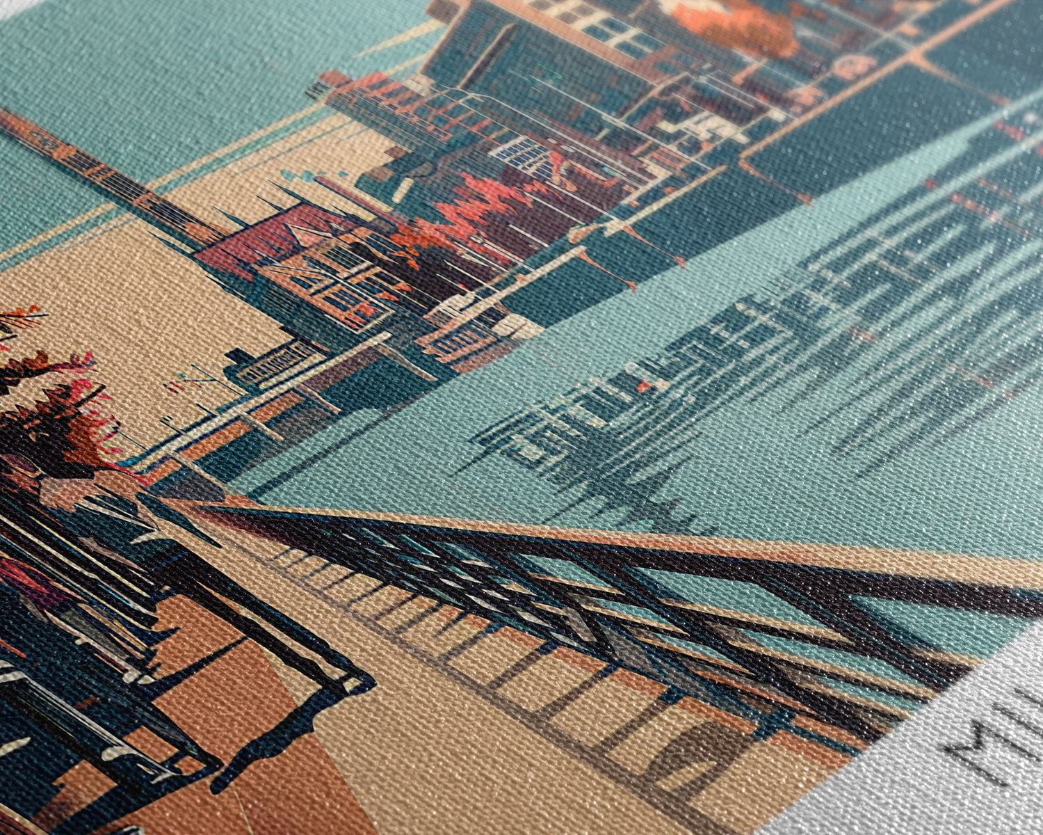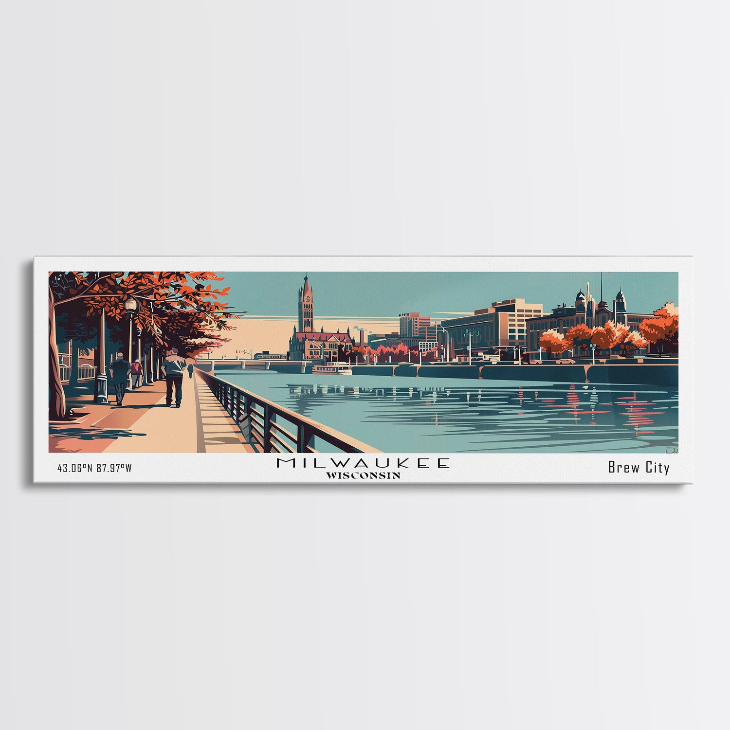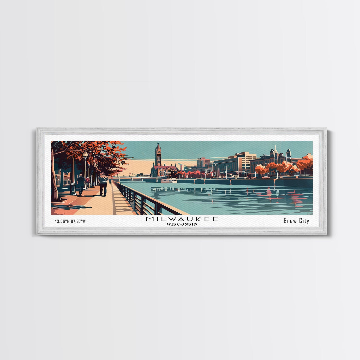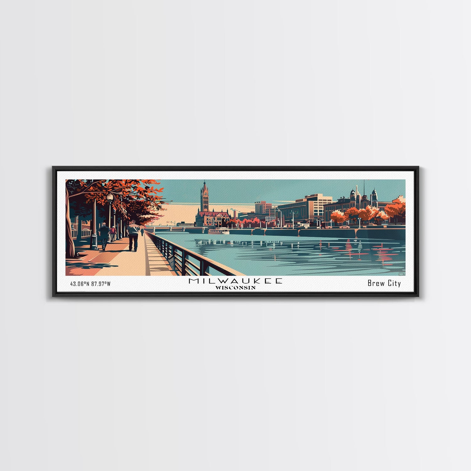 Milwaukee Wisconsin Panoramic Wall Art, Mid Century Modern Framed Canvas Print, Retro Pop Art Travel Poster, Office Decor, Living Room Art