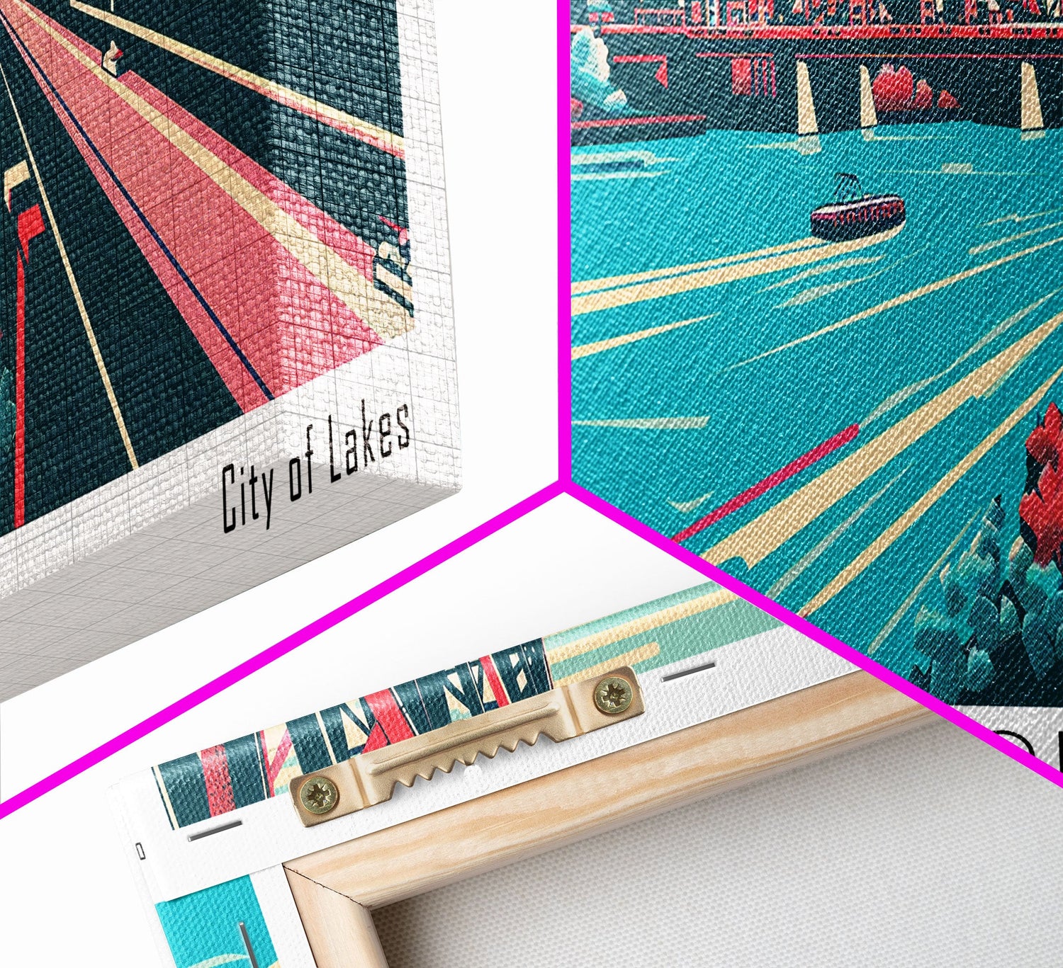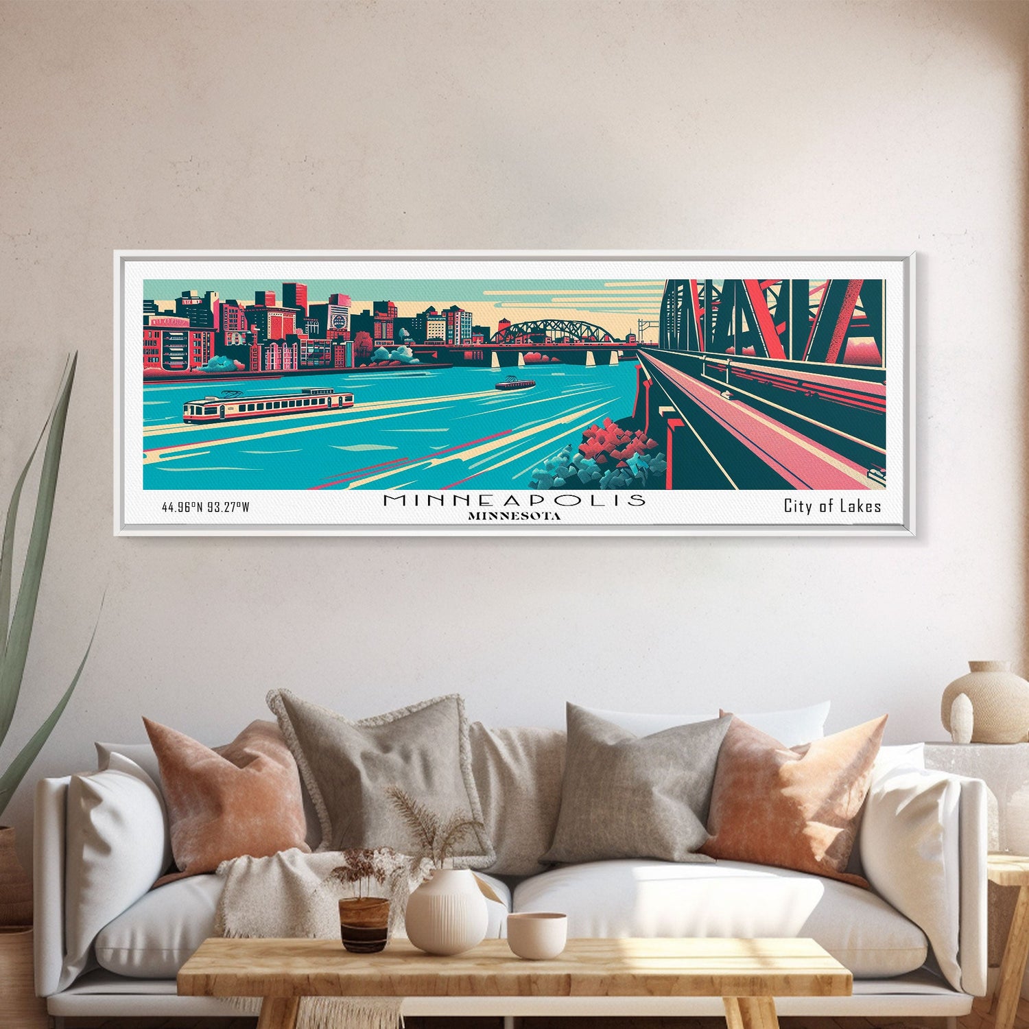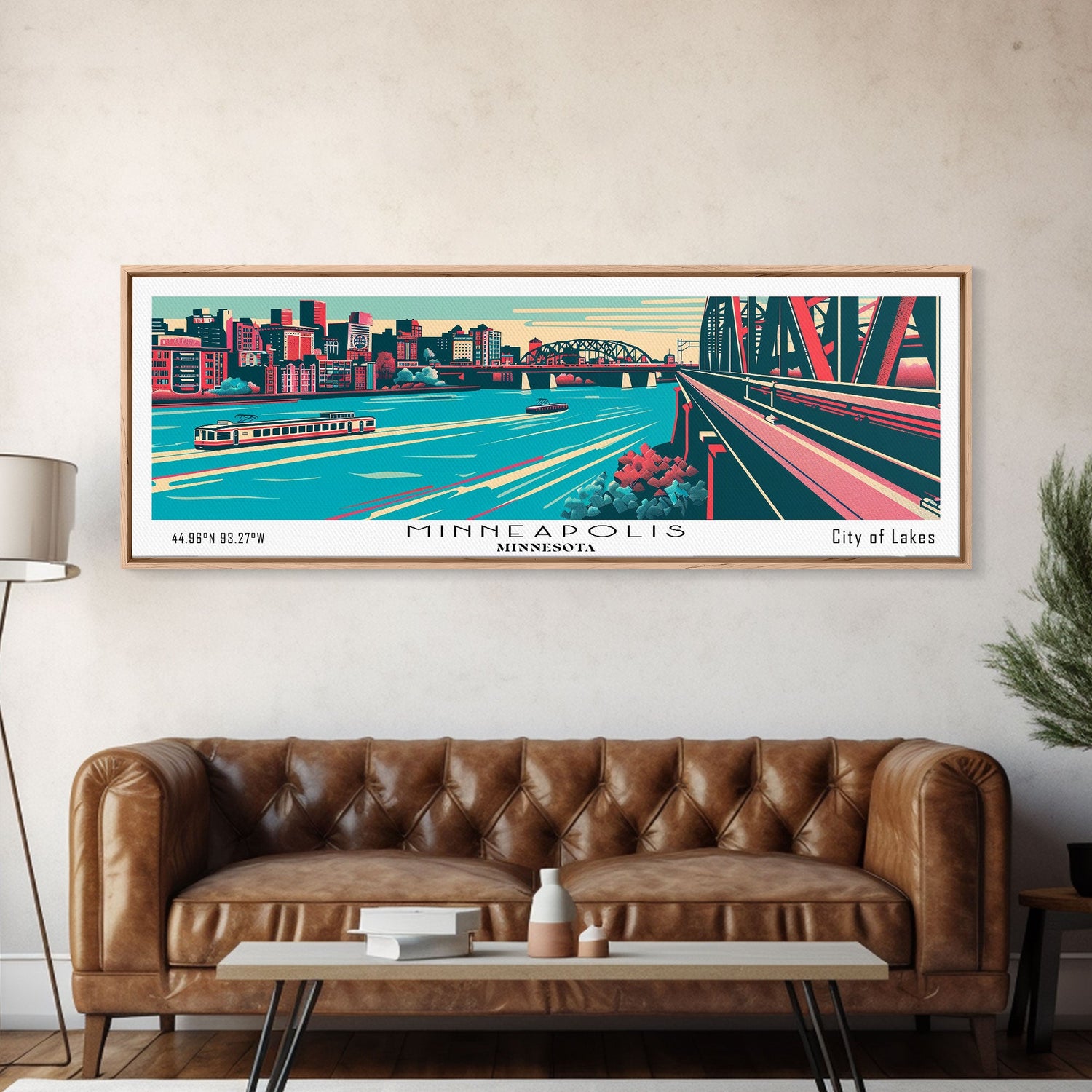 Minneapolis Minnesota Panoramic Wall Art Framed Canvas Print, Travel Poster, Mid Century Modern Art, Pop Art Style, Home Decor, Office Art