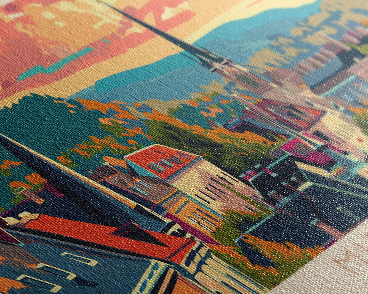 Most of our canvases are made in the USA, with the exception of canvases ordered with the light oak unstained frames, and any large canvases (24x48, 30x60, 16x48 and 20x60) ordered WITH a frame. These are temporarily made in and shipped from Europe, while we try to find a more consistent supplier in the USA.