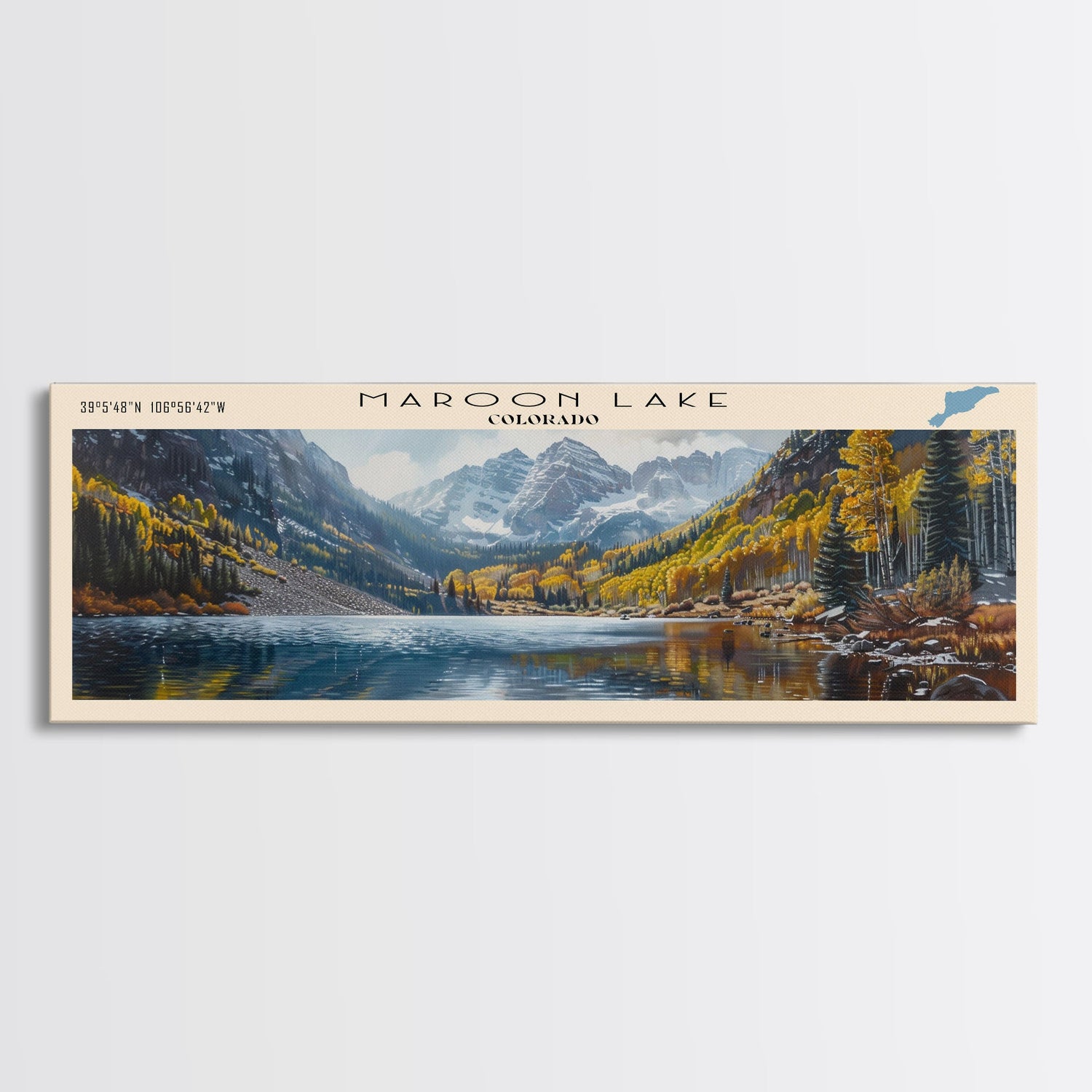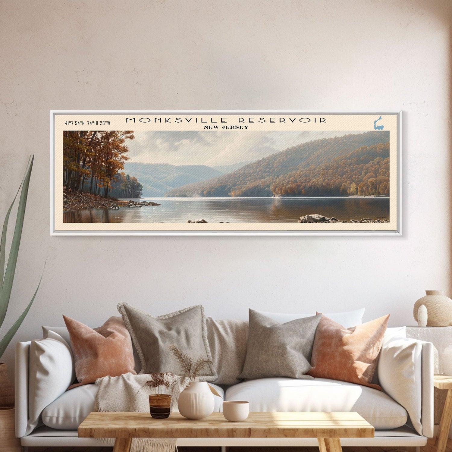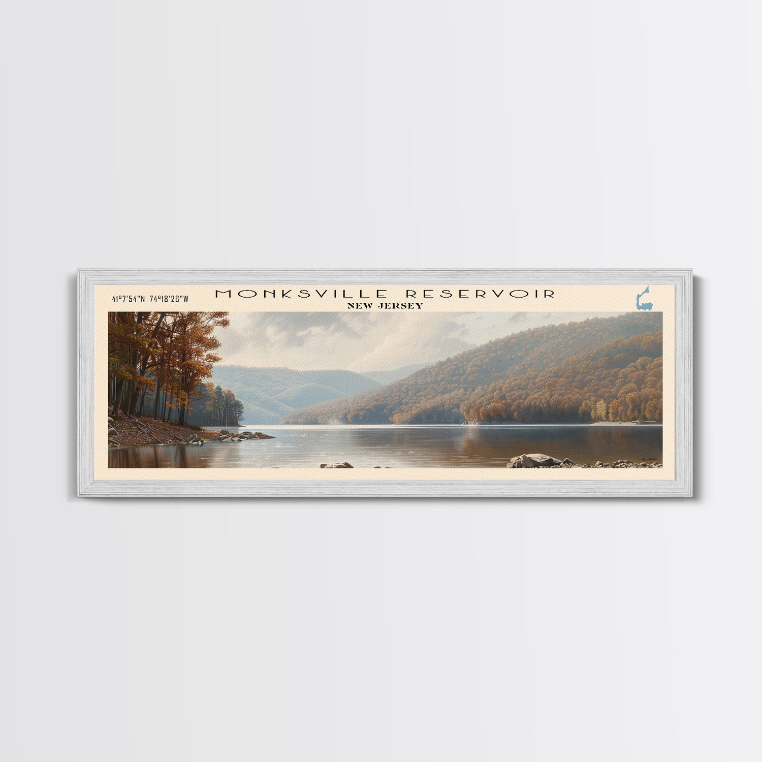 Monksville Reservoir New Jersey Framed Canvas Print, Lake House Decor, Panoramic Wall Art, Travel Poster, Landscape Painting, Bedroom Decor