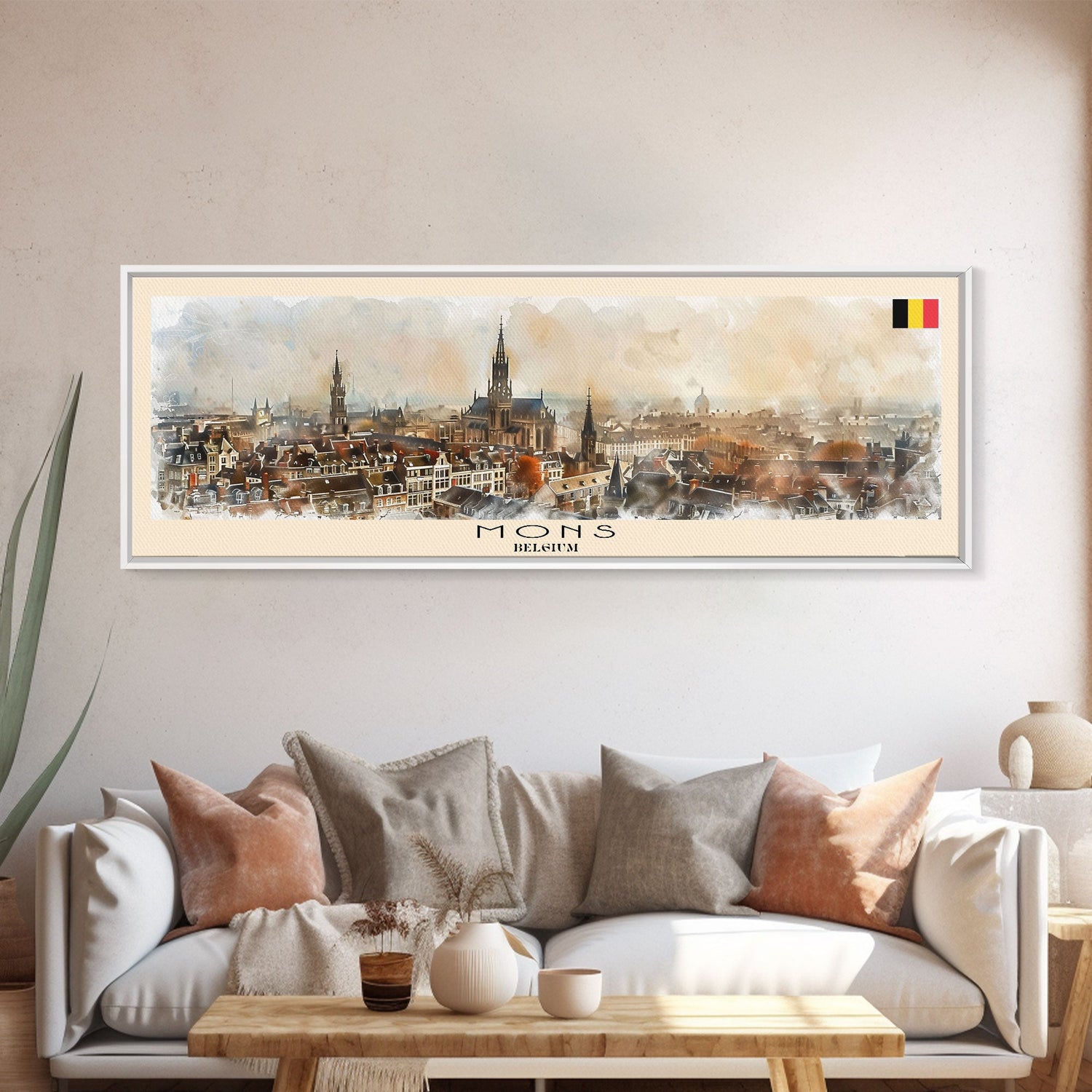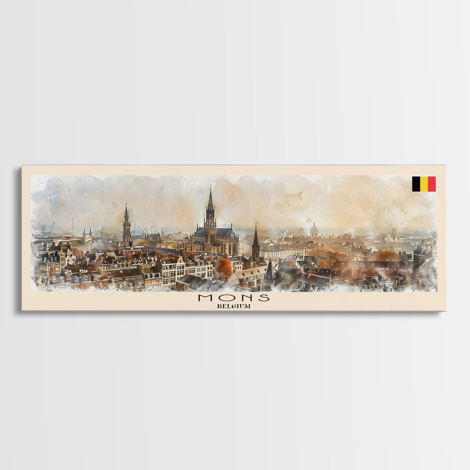 Mons Belgium Panoramic Travel Poster, Framed Canvas Print or Metal Wall Art, Travel Art, Home Decor, Panoramic Painting, Midcentury Art