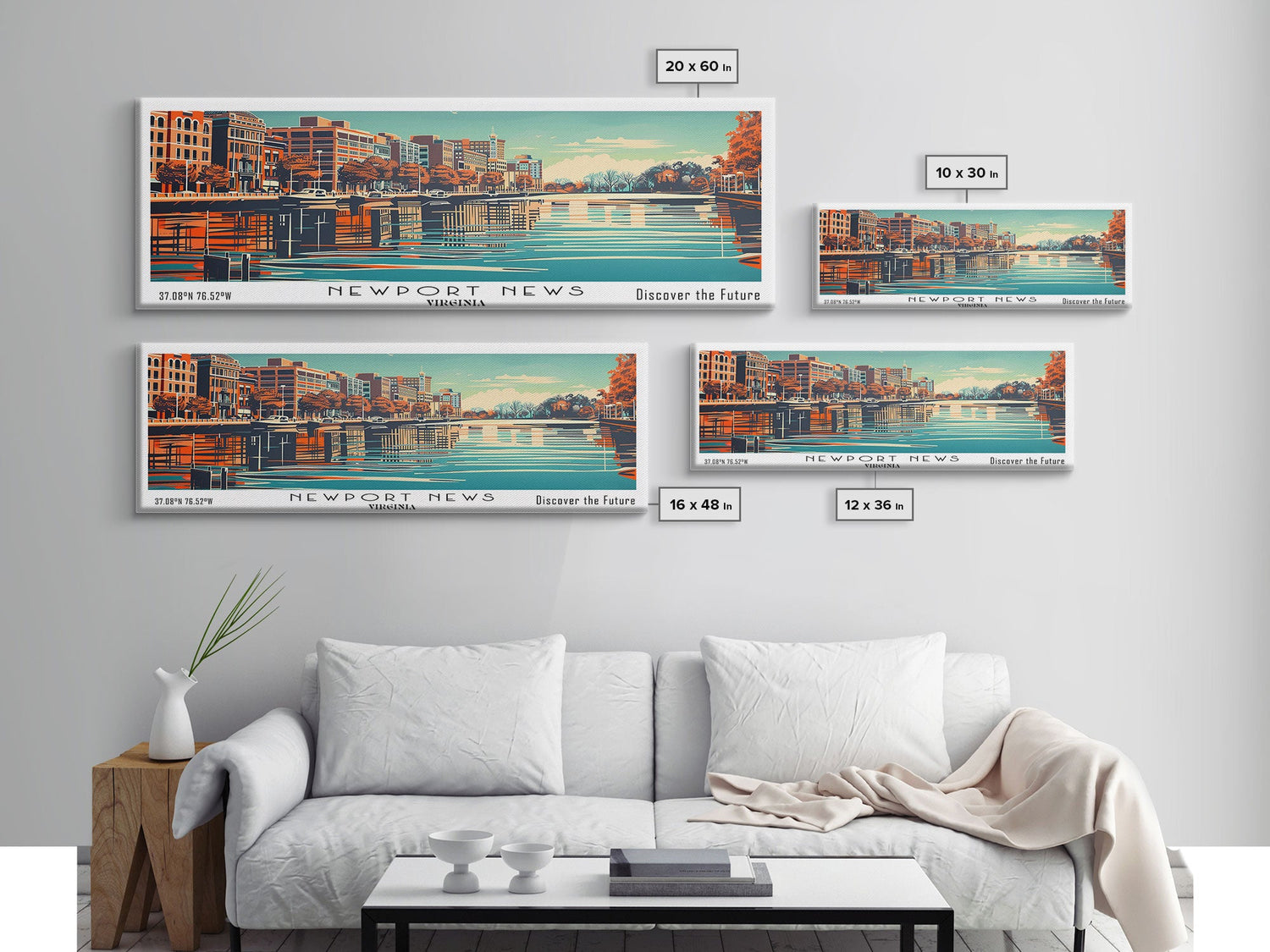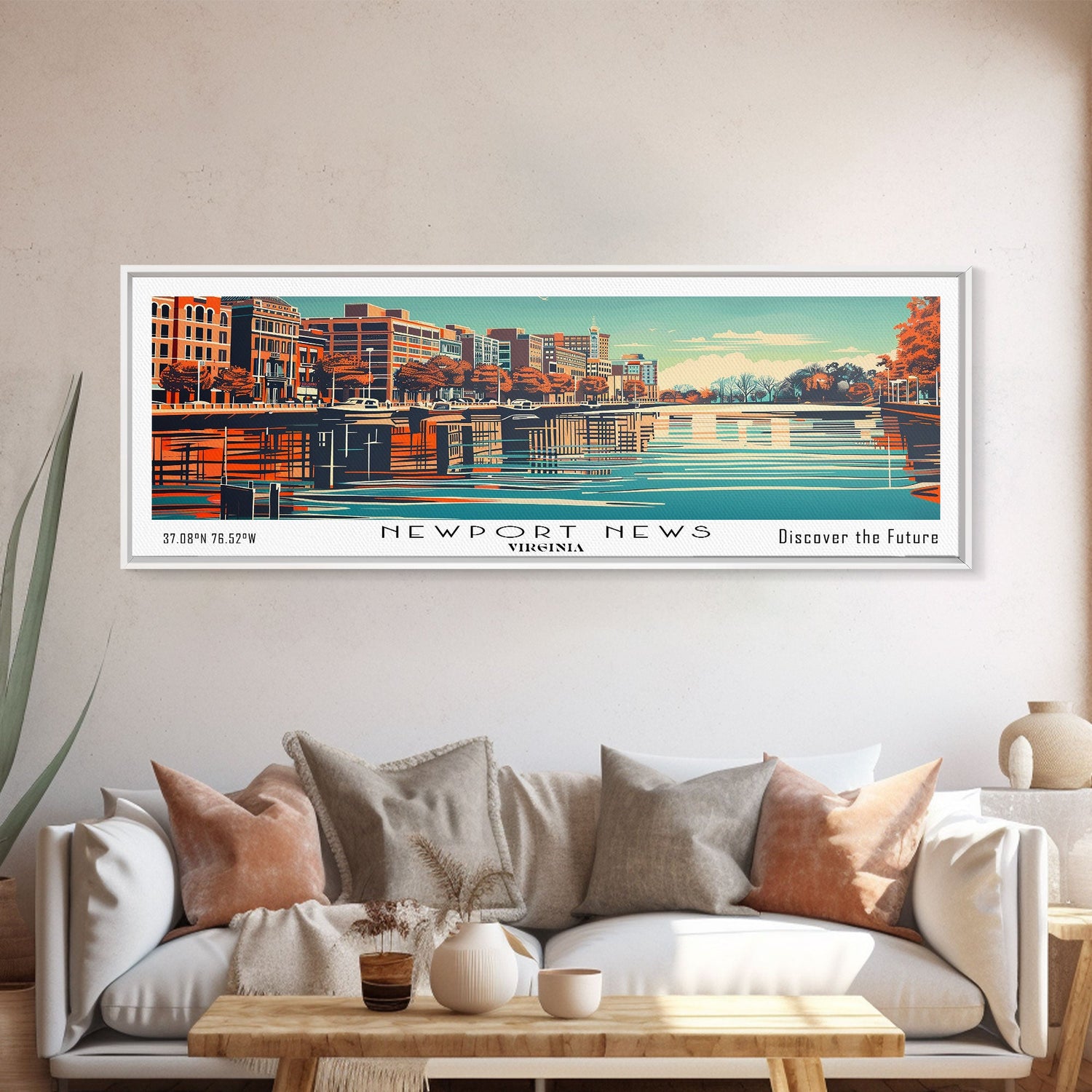 Newport News Virginia Panoramic Wall Art, Mid Century Modern Framed Canvas Print, Retro Pop Art Travel Poster, Office Decor, Cityscape Art