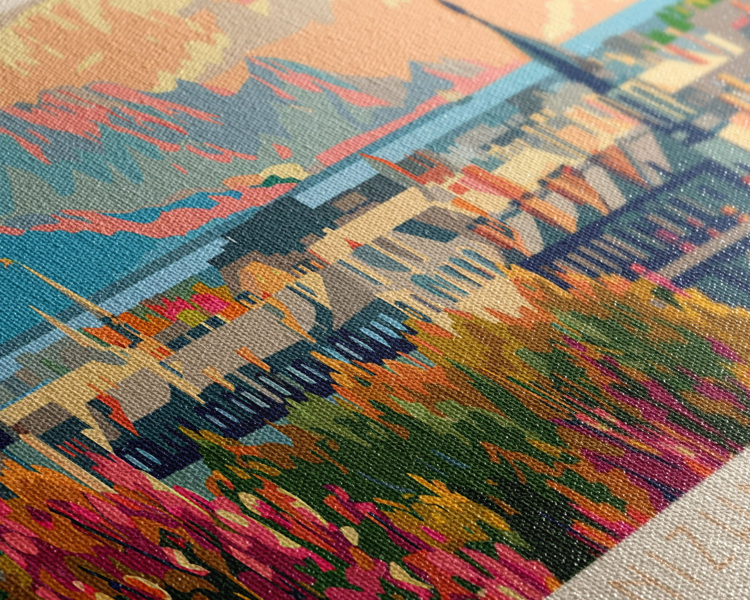 Most of our canvases are made in the USA, with the exception of canvases ordered with the light oak unstained frames, and any large canvases (24x48, 30x60, 16x48 and 20x60) ordered WITH a frame. These are temporarily made in and shipped from Europe, while we try to find a more consistent supplier in the USA.