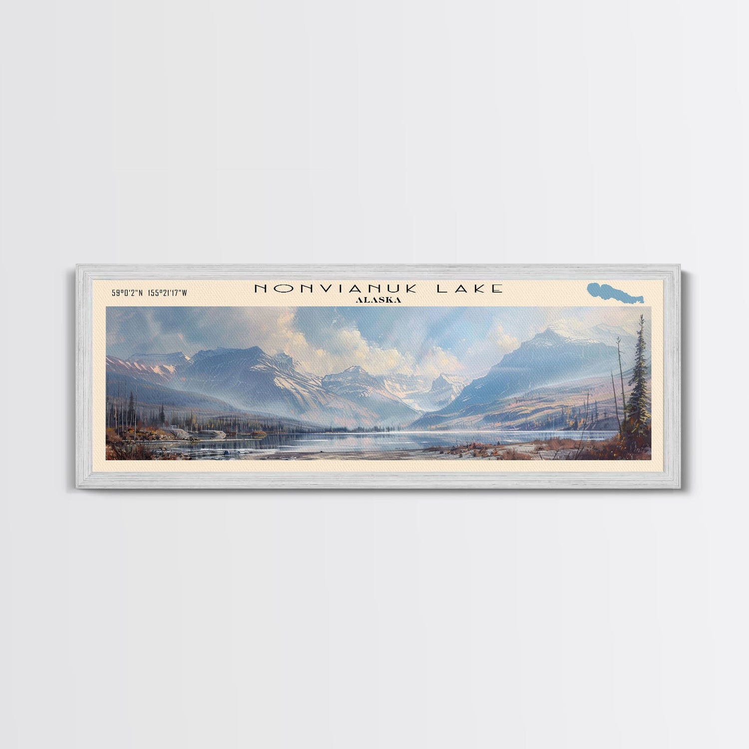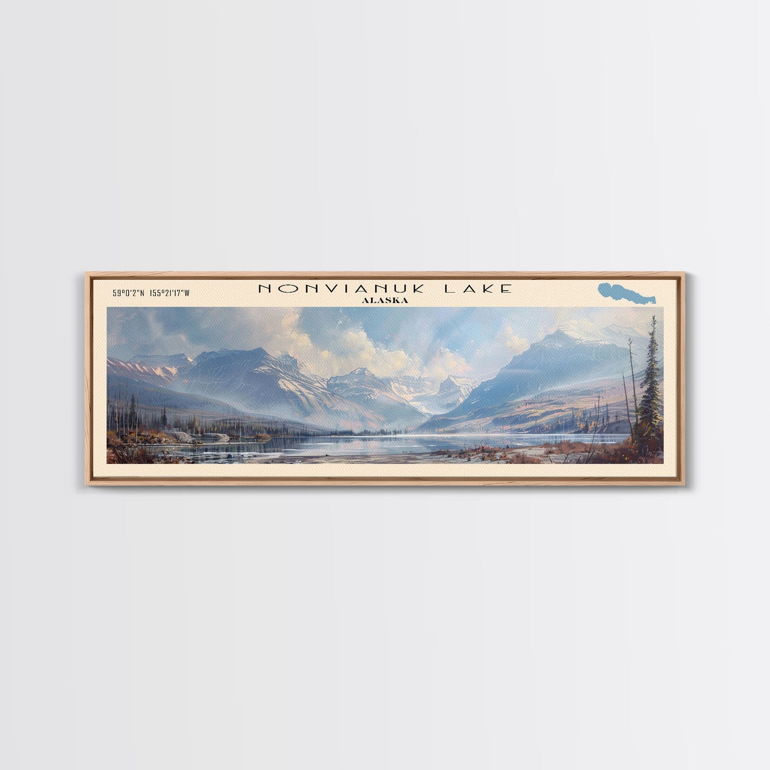Nonvianuk Lake Framed Canvas Print, Lake House Decor, Panoramic Wall Art, Travel Poster, Scenic Landscape Painting, Contemporary Art