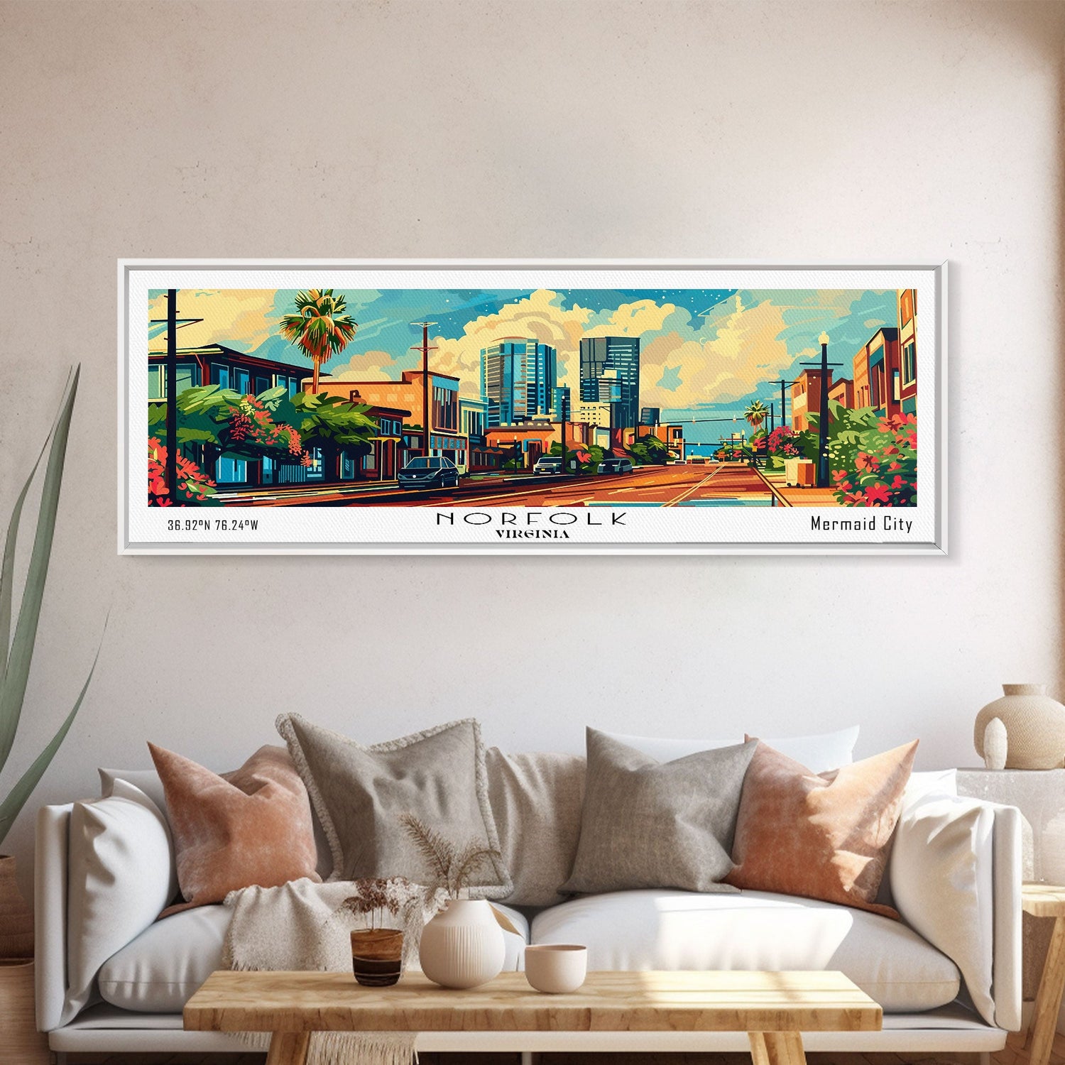 Norfolk Virginia Panoramic Framed Canvas Print, Retro Style Wall Art, Mid Century Modern Home Decor, Pop Art Travel Poster