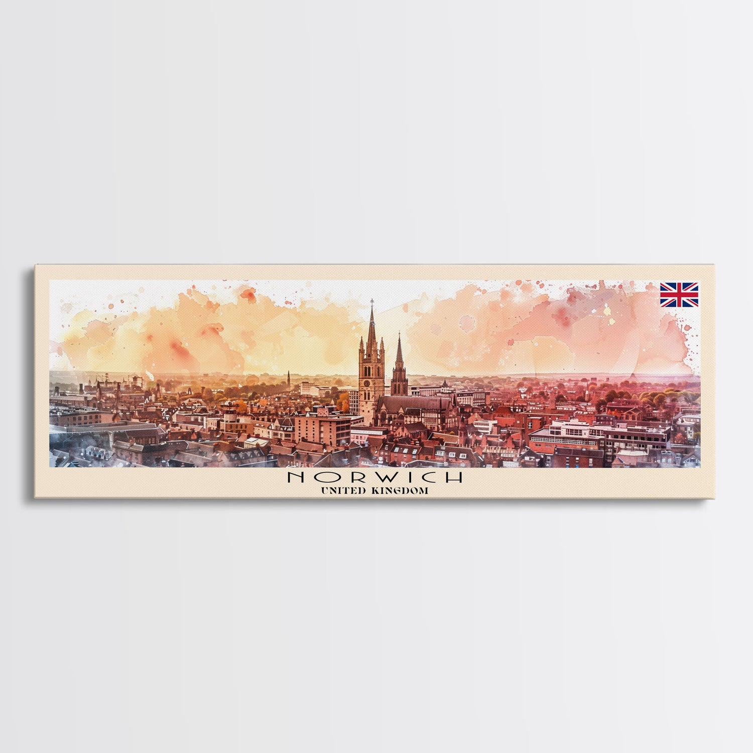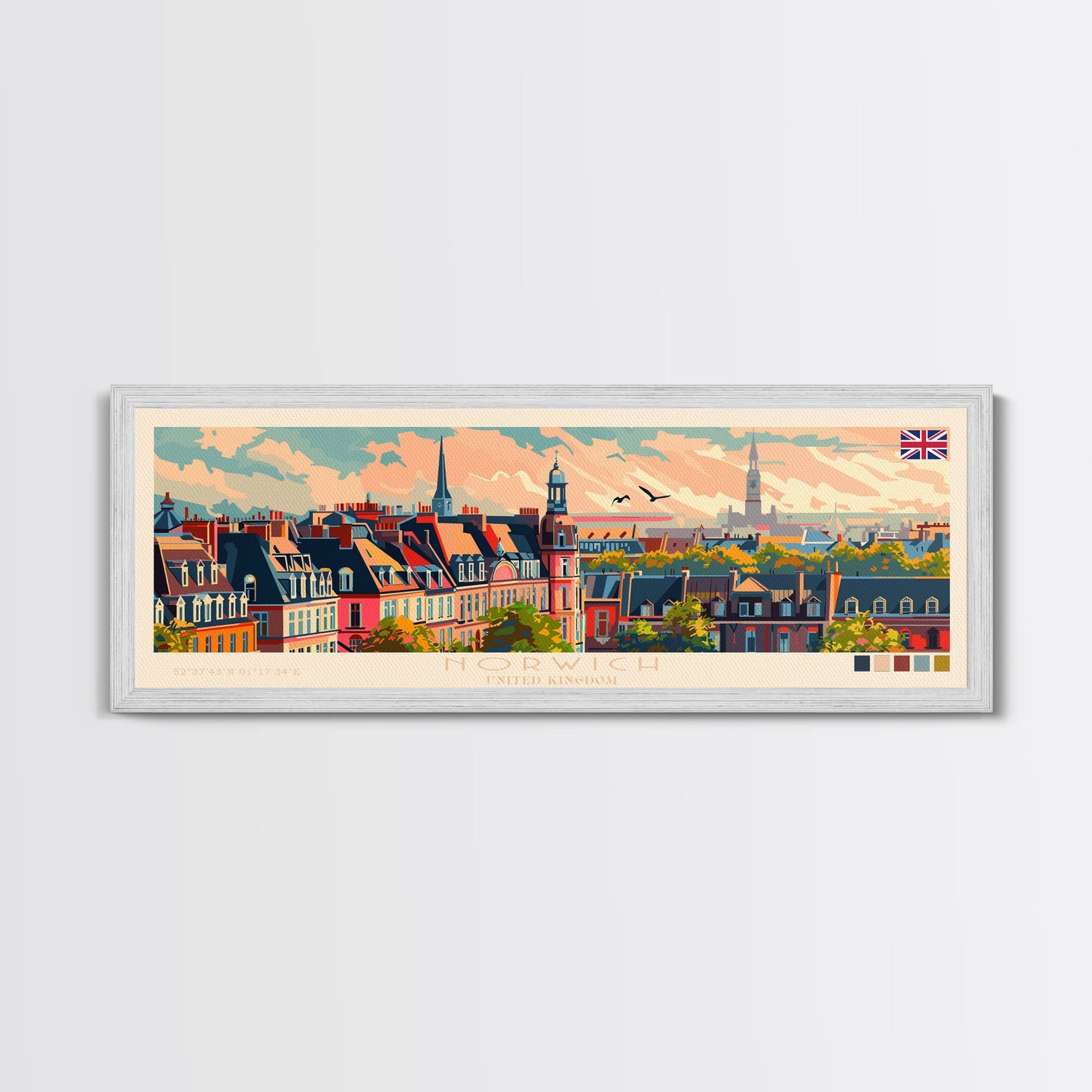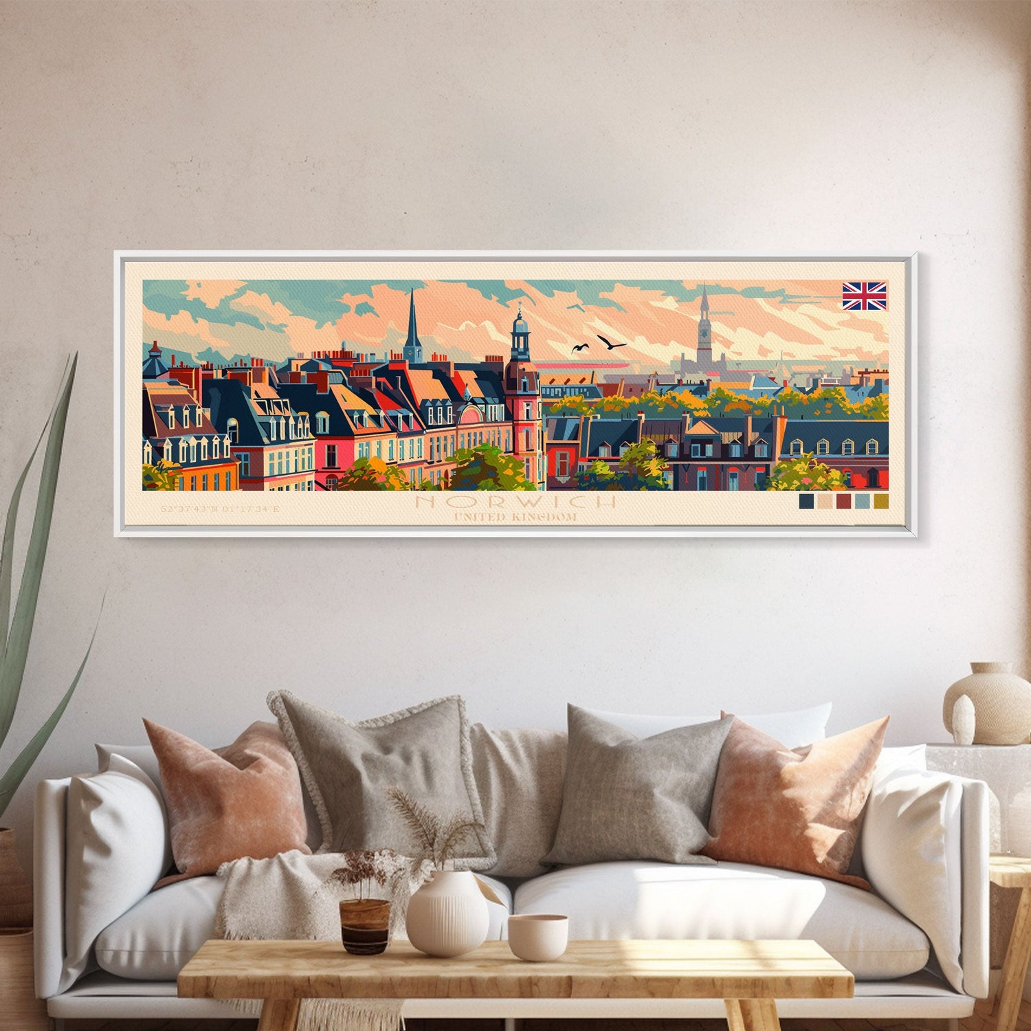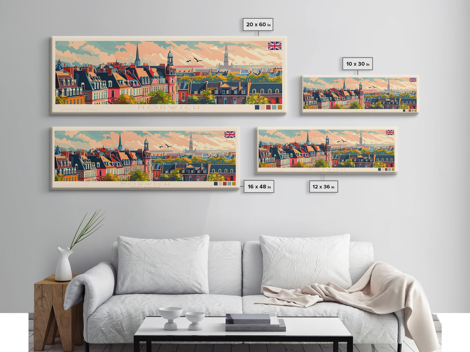 Norwich United Kingdom Panoramic Travel Poster, Framed Canvas Print or Metal Wall Art, Travel Art, Home Decor, Panoramic Painting, Midcentury Art