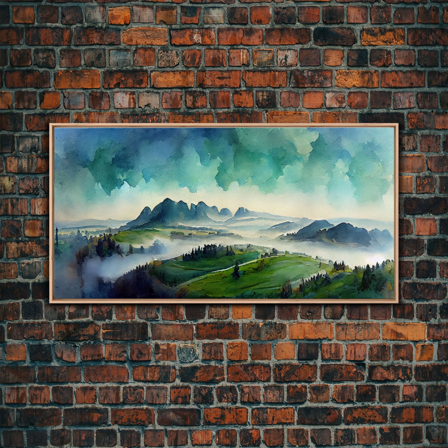Panoramic Blue Green Mountain Valley Watercolor Canvas Art Print, Misty Rolling Hills Landscape, Extra Large Panorama Print