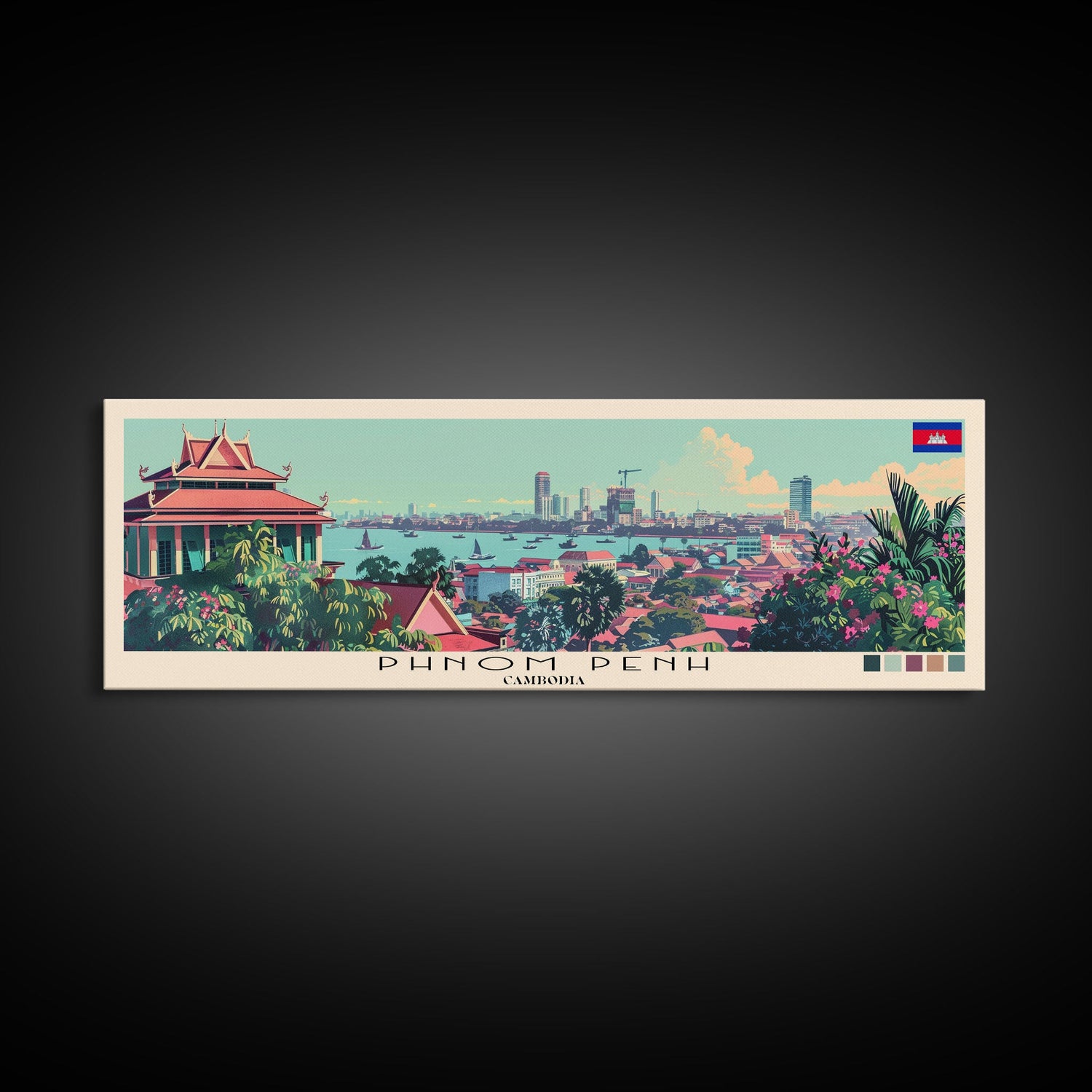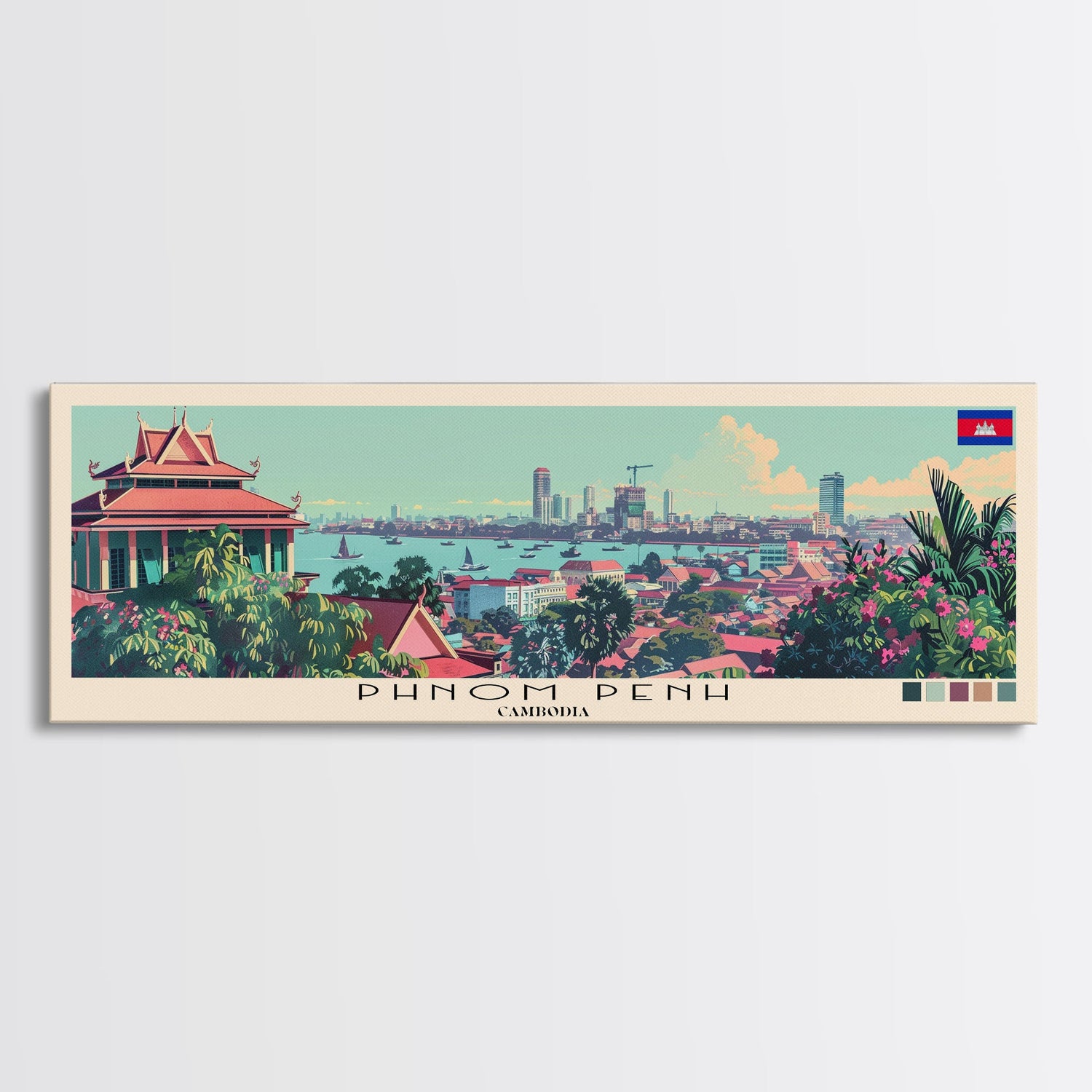 Phnom Penh, Cambodia Panoramic Canvas Print, Phnom Penh, Cambodia Painting, Cambodia Art, Phnom Penh Travel Poster, Travel Art, Guest Room Painting