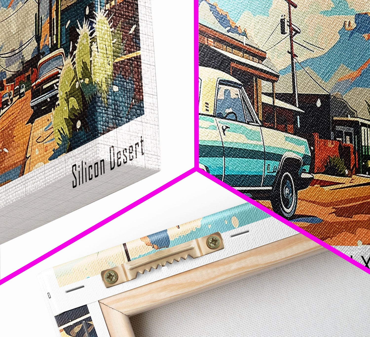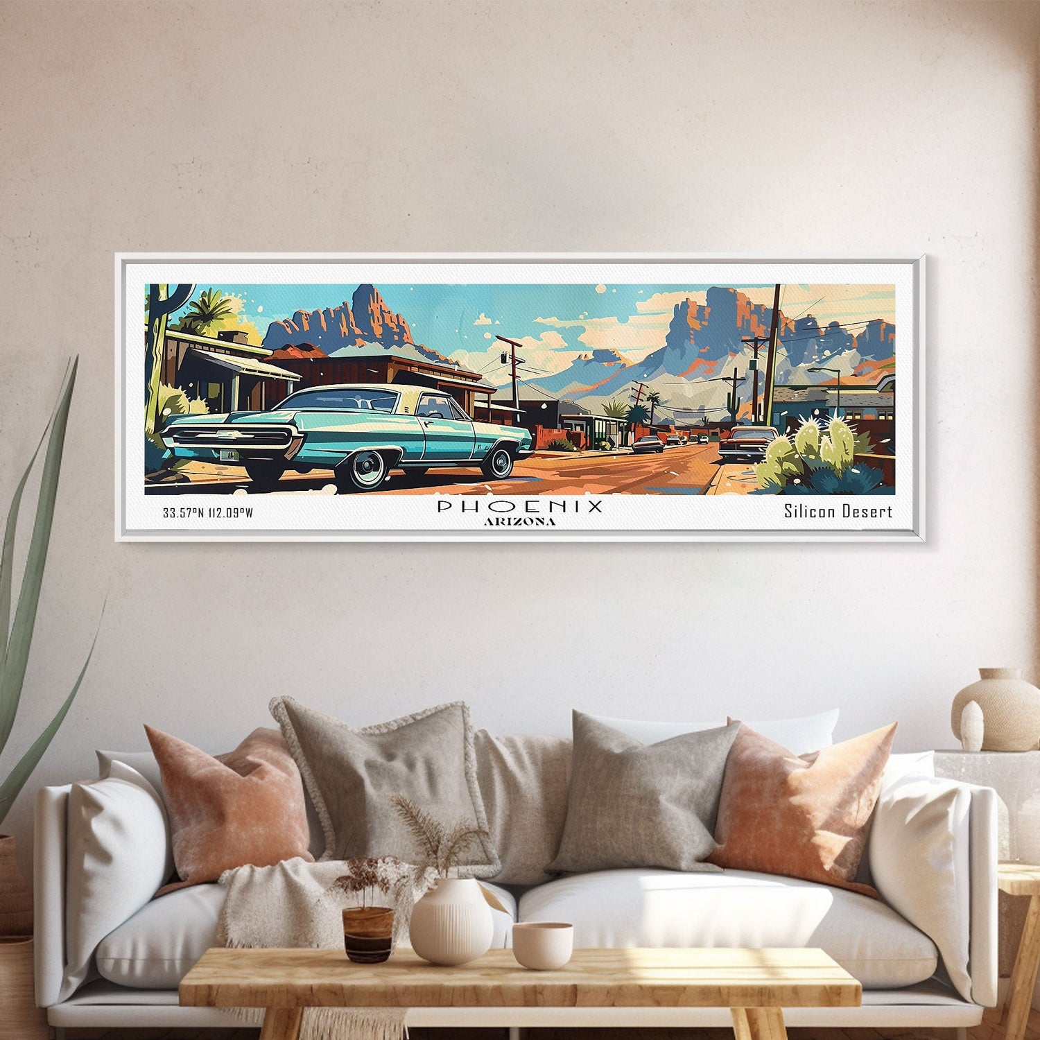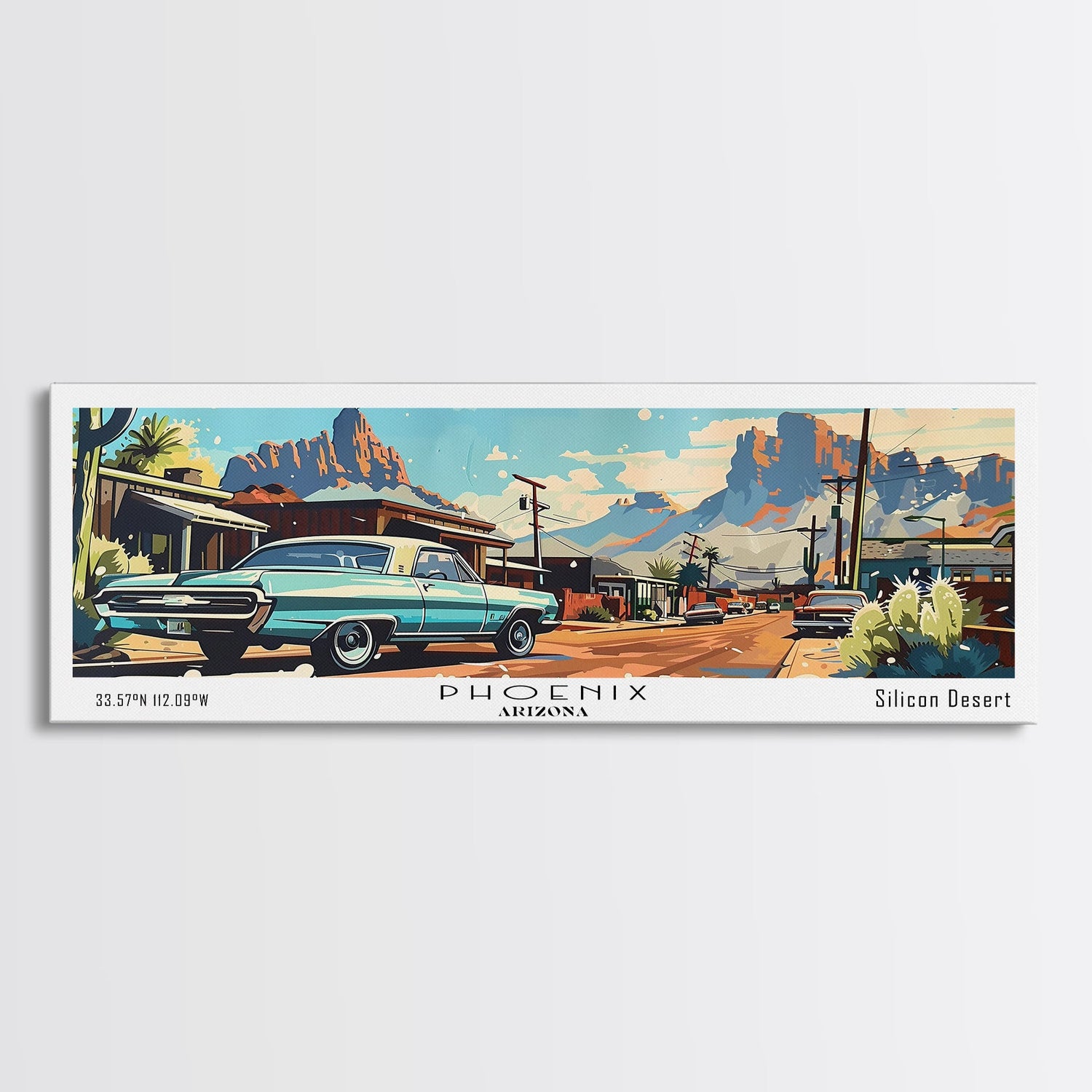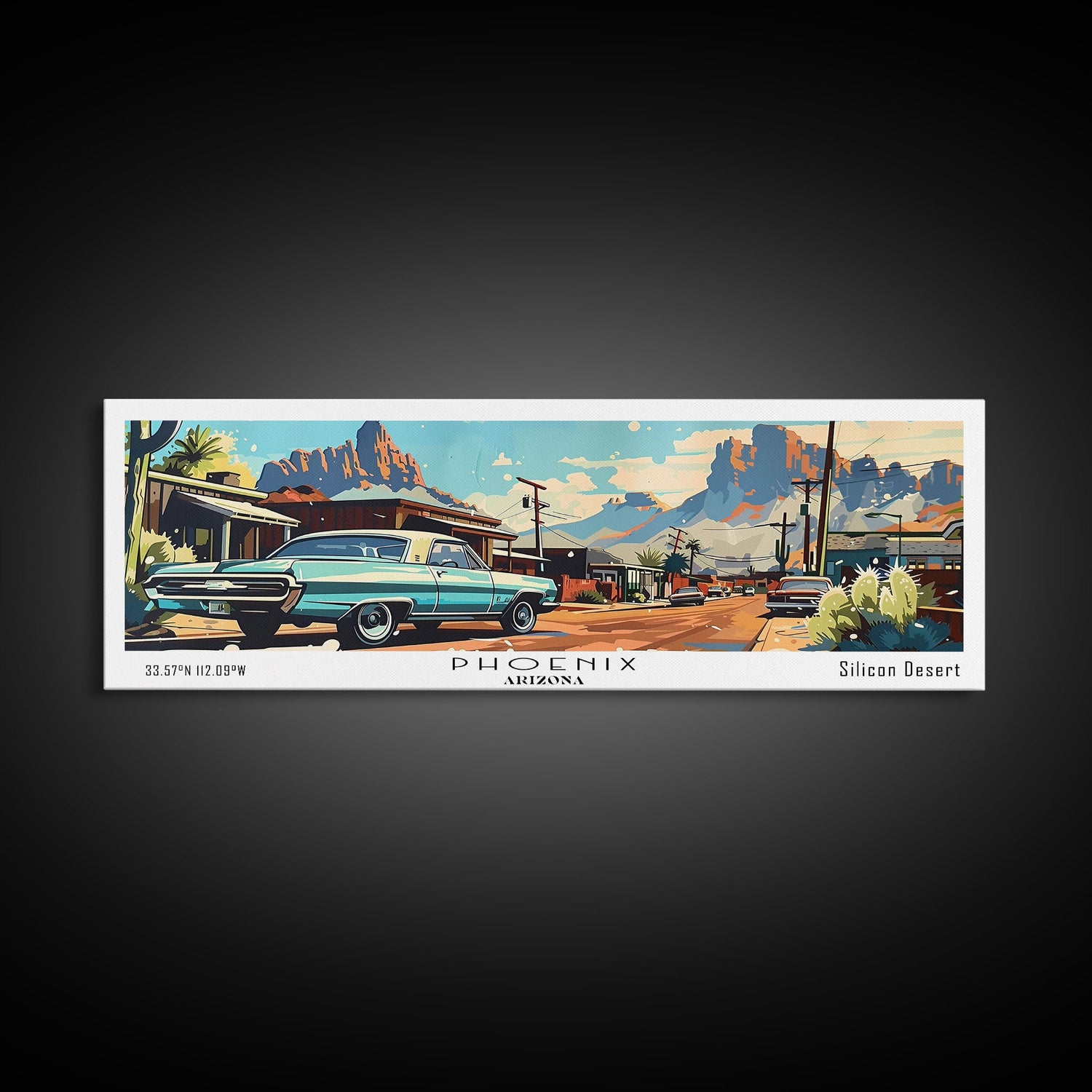 Phoenix Arizona Panoramic Painting, Retro Style Framed Canvas Print, Mid Century Modern Art, Pop Art Travel Poster, Home Office Decor