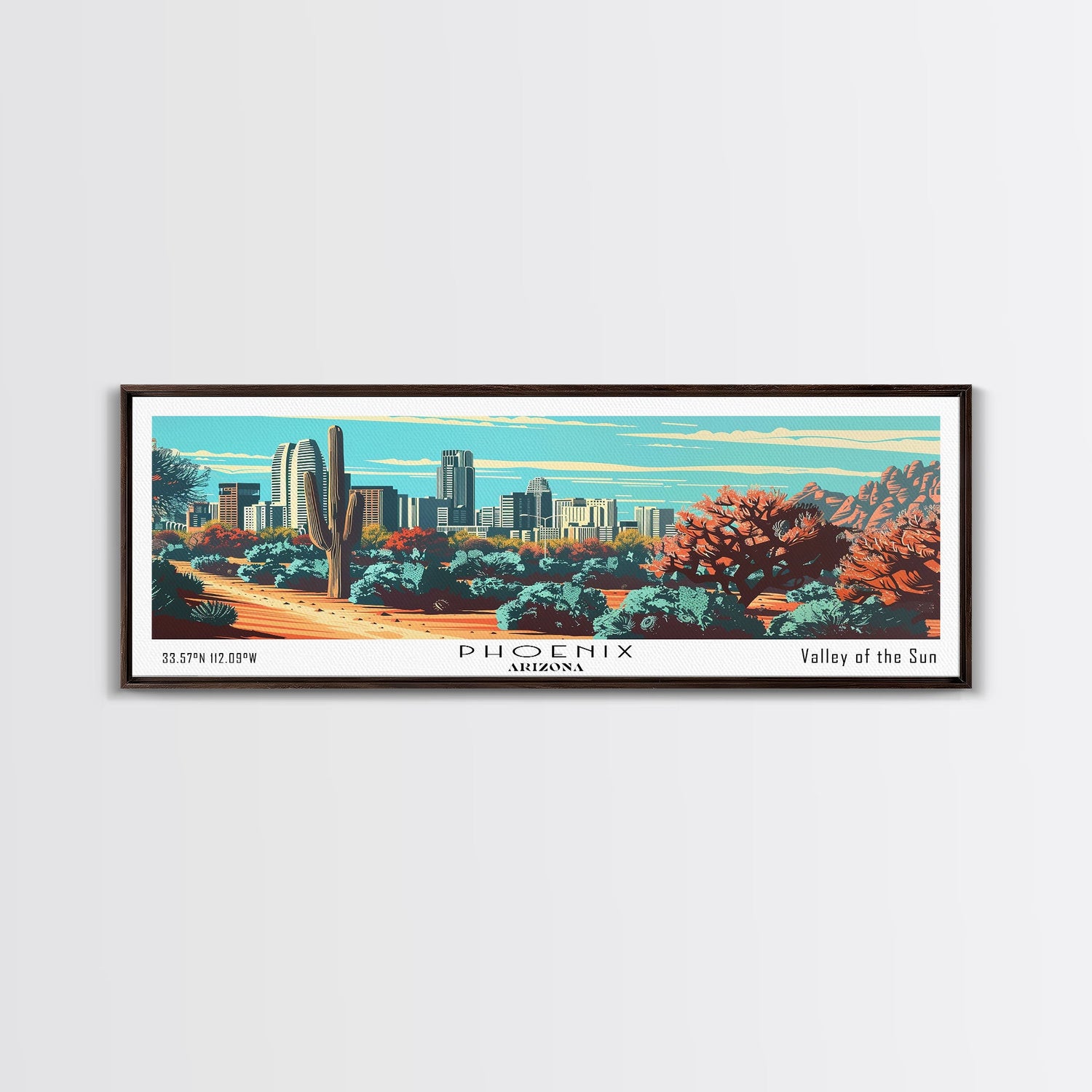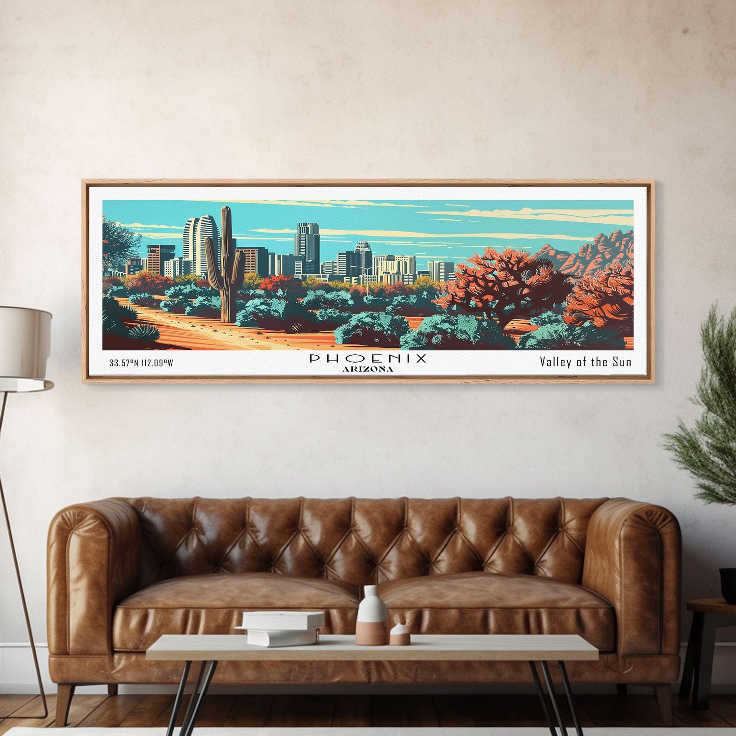 Phoenix Arizona Panoramic View, Mid Century Modern Framed Canvas Print, Retro Pop Art Travel Poster, Living Room Wall Decor