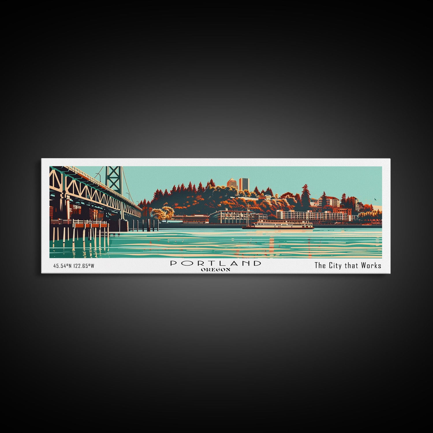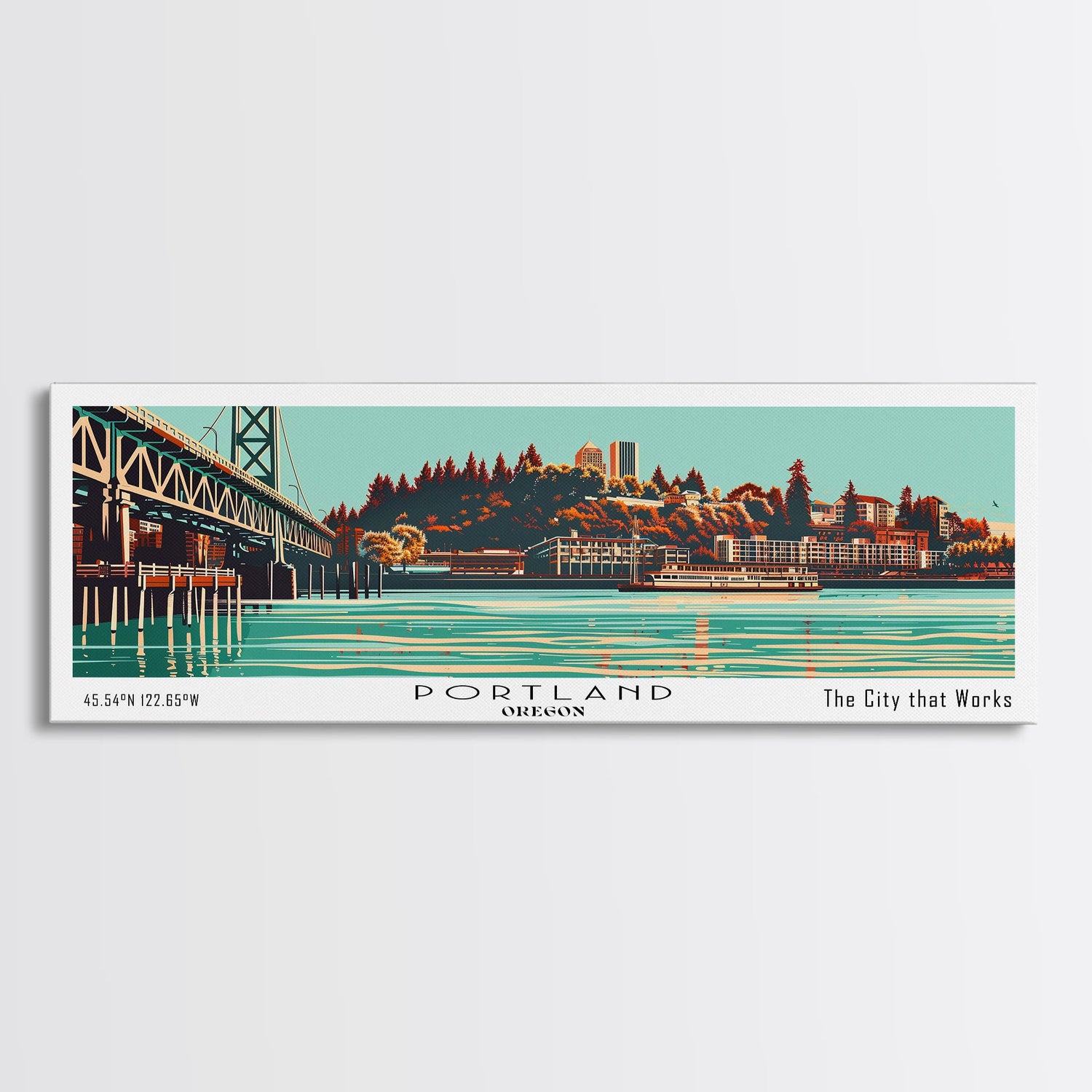 Portland Oregon Panoramic Wall Art, Mid Century Modern Framed Canvas Print, Retro Pop Art Travel Poster, Office Decor, Living Room Art