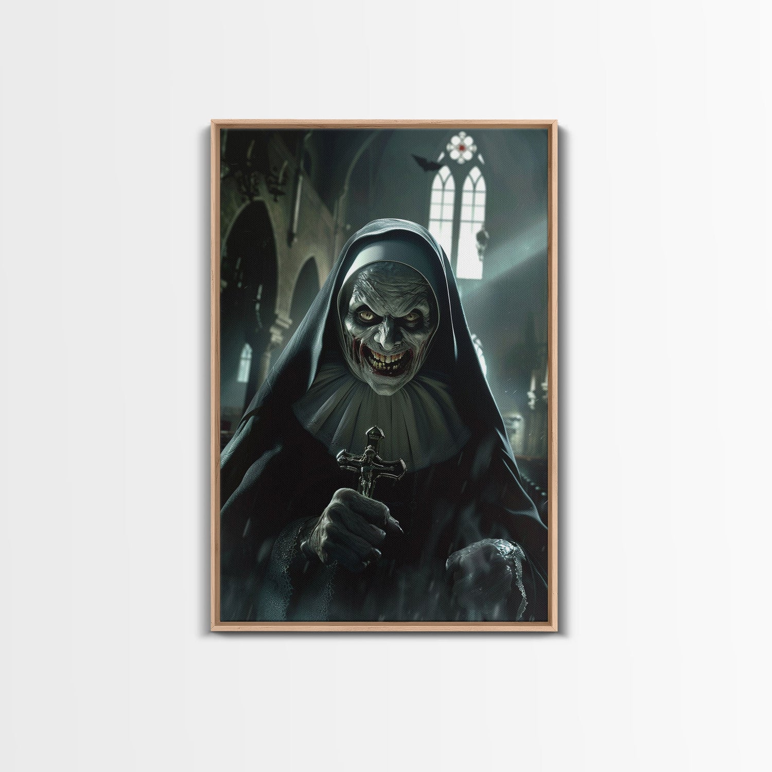 Sinister Nun with Crucifix in Haunted Church - Scary Halloween Themed Framed Canvas Print, Creepy Gothic Home Wall Decor