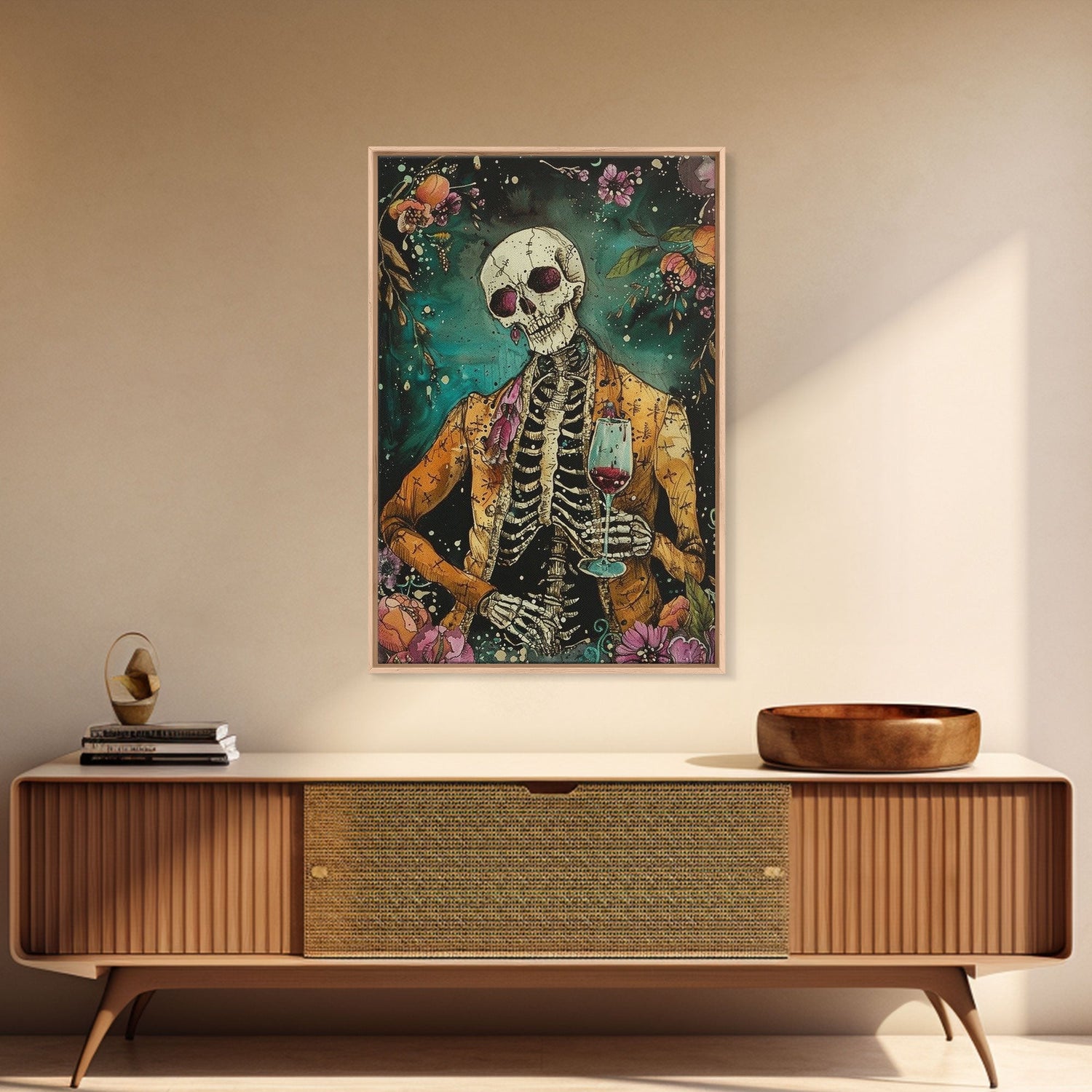 Skeleton Gentleman with Wine Glass Framed Canvas Print, Halloween Art, Creepy Wall Art, Spooky Home Decor, Scary Art, Unique Wall Decor