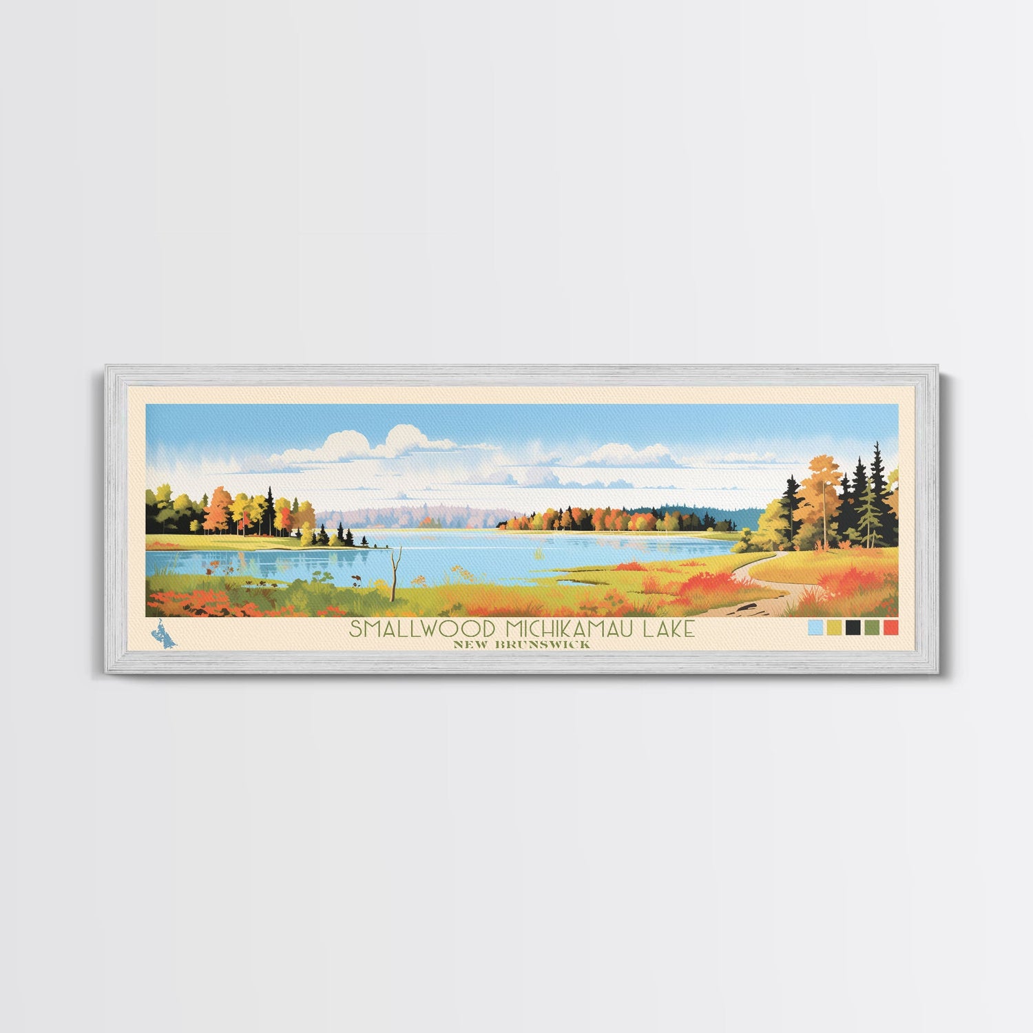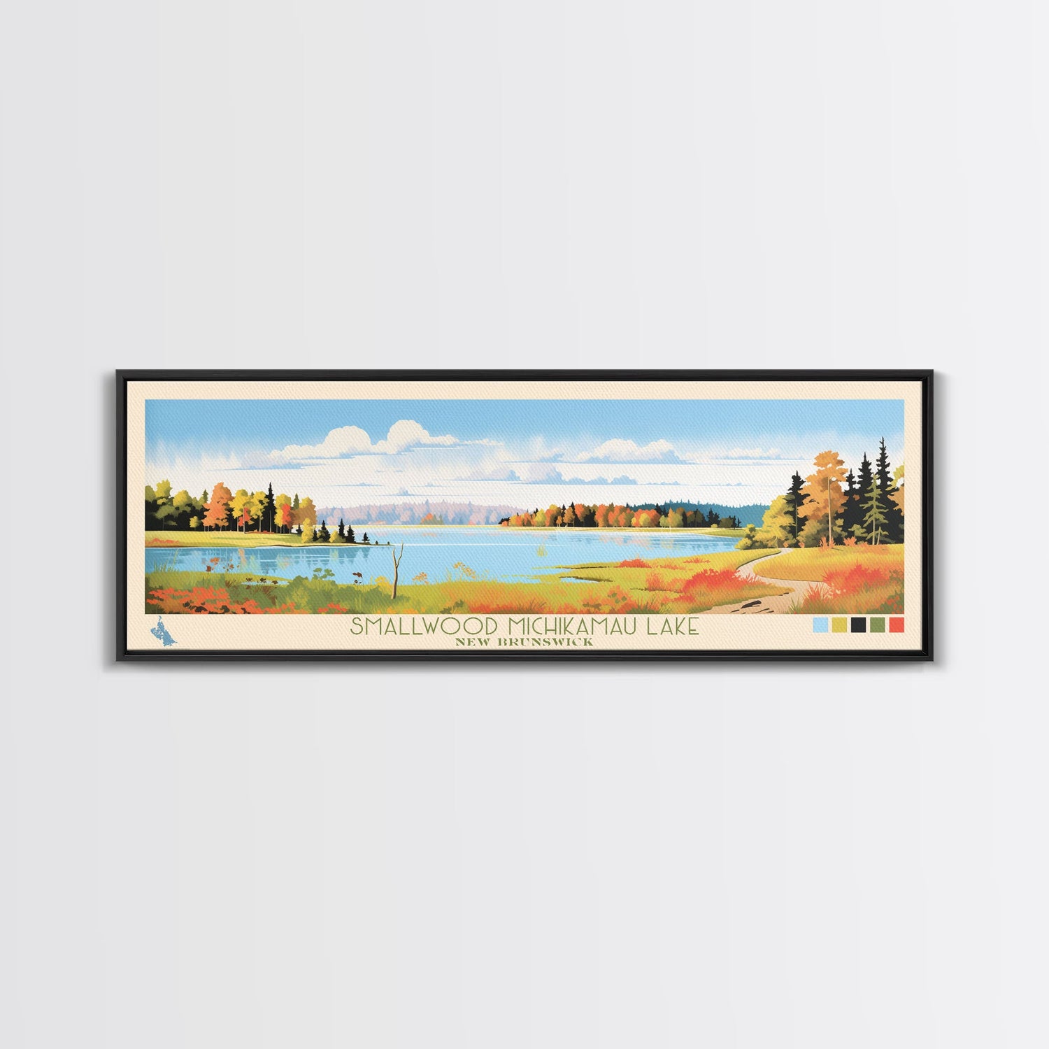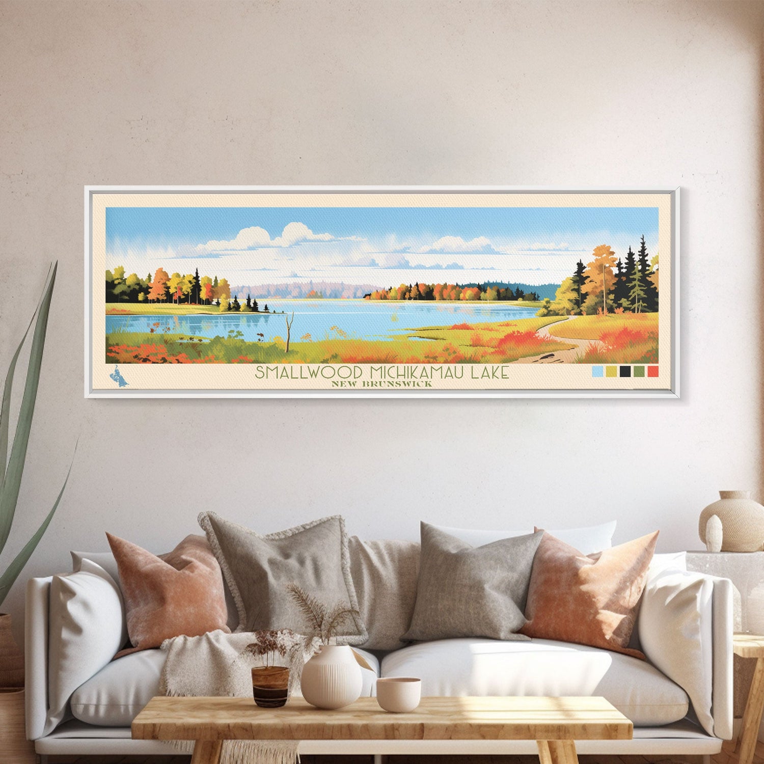 Smallwood Michikamau Lake, New Brunswick Framed Canvas Print, Lake House Art, Midcentury Modern Decor, Pop Art, Travel Poster, Living Room Wall Art
