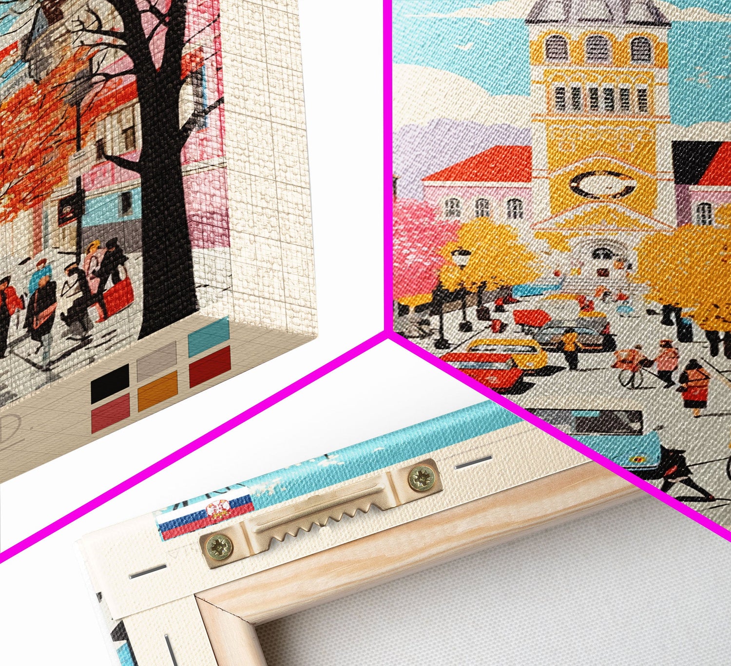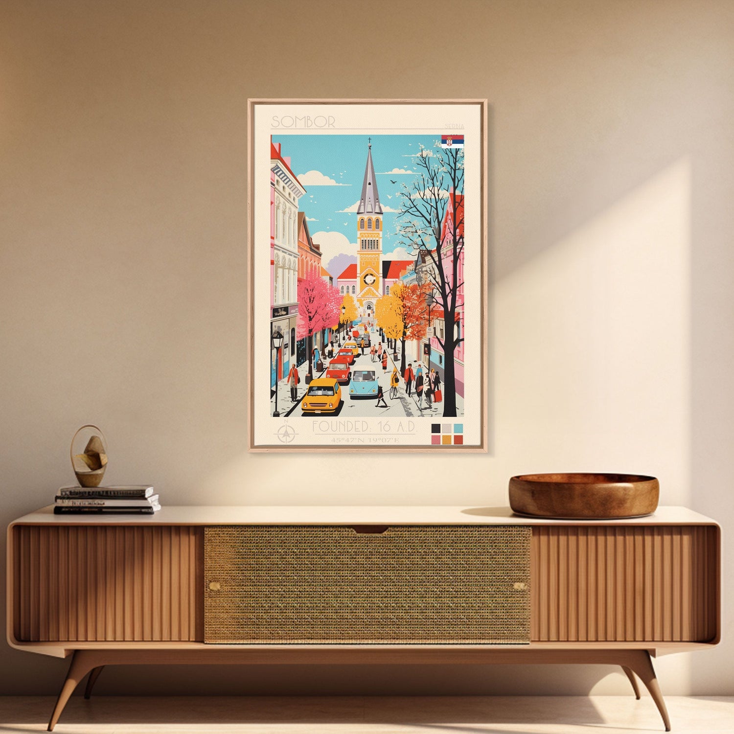 Sombor Serbia Travel Poster Framed Canvas Print, Midcentury Modern Art, Pop Art Wall Decor, Scenic Wall Art, Office Decoration