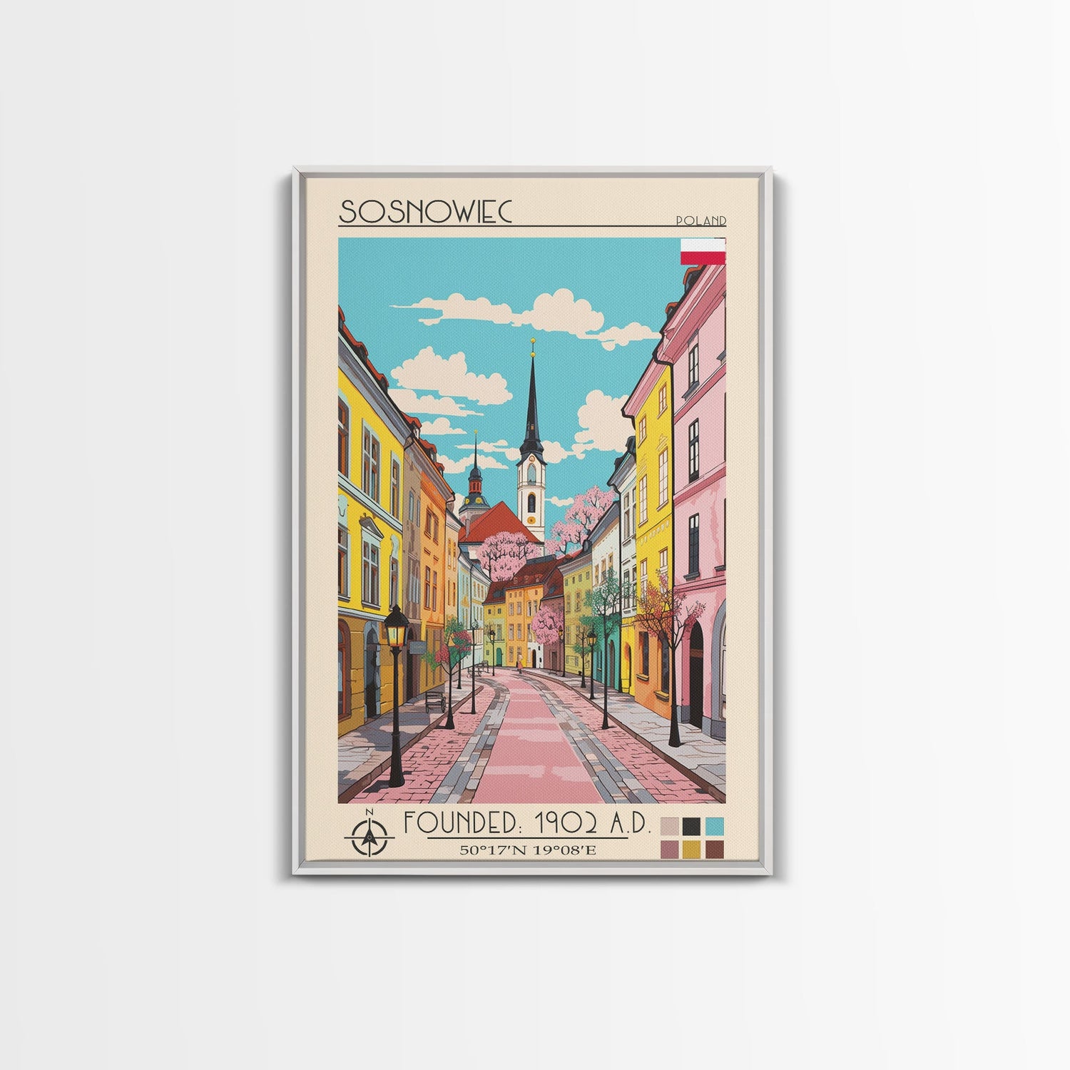 Sosnowiec Poland Travel Poster Framed Canvas Print, Midcentury Modern Art, Pop Art Wall Decor, Home Decor, Living Room Art