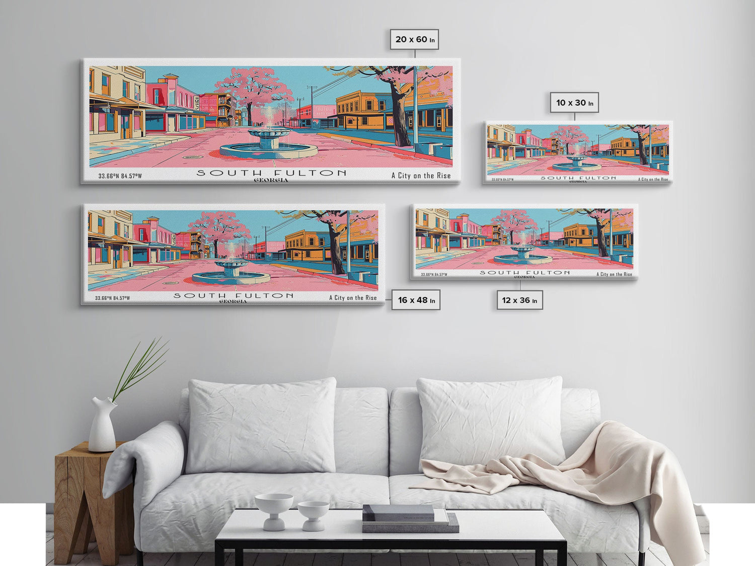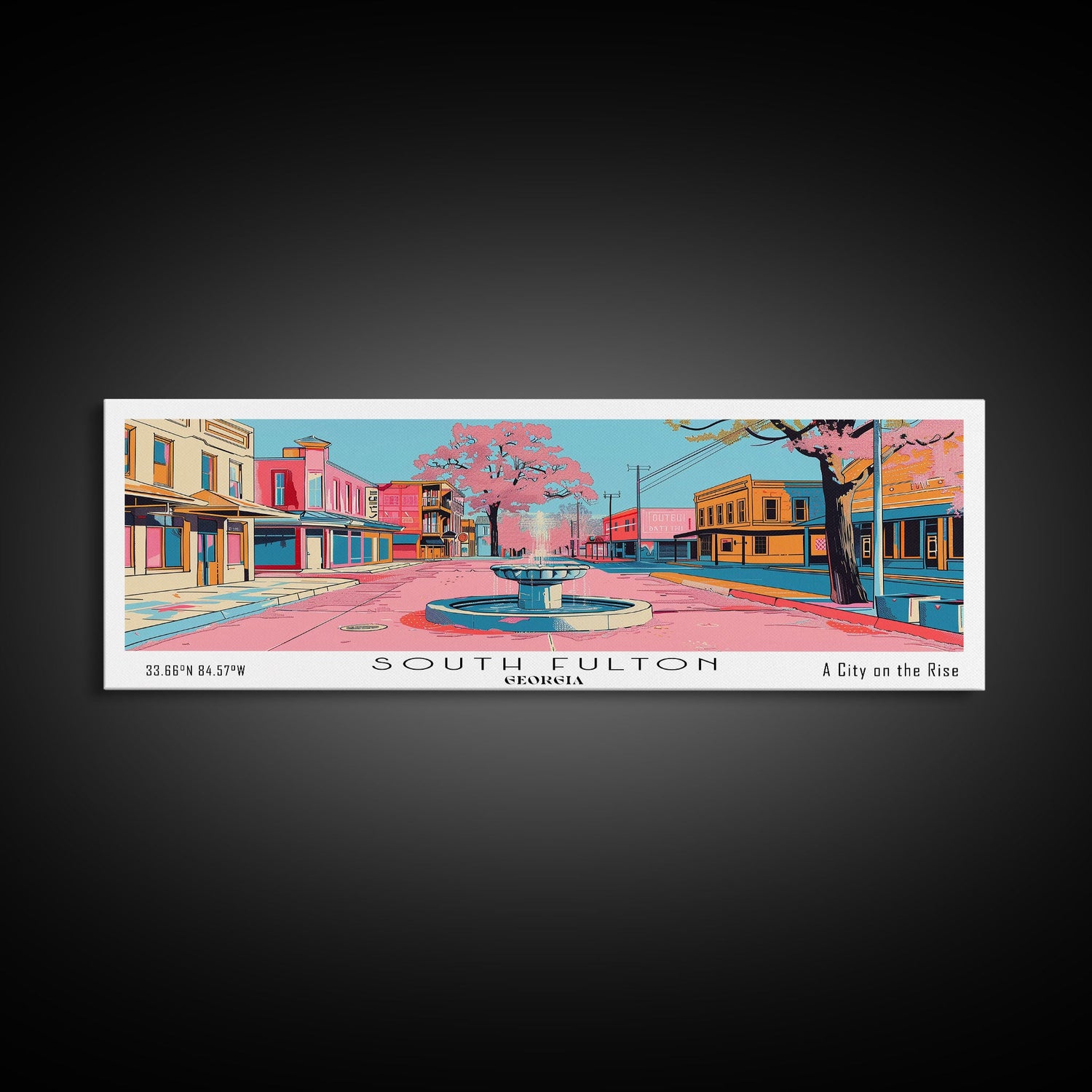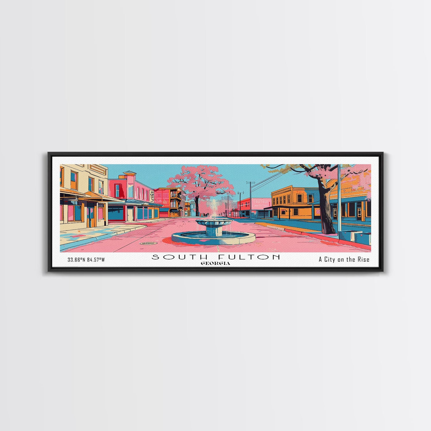 South Fulton Georgia Panoramic Painting, Mid Century Modern Framed Canvas Print, Retro Pop Art Travel Poster, Home and Office Wall Art Decor
