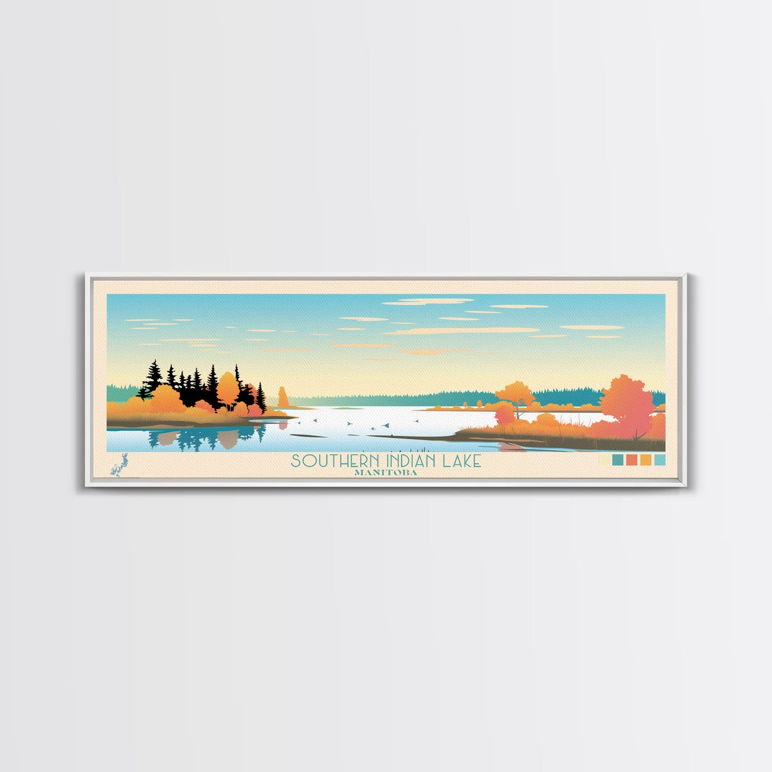 Southern Indian Lake, Manitoba Framed Canvas Print, Lake House Art, Midcentury Modern Decor, Pop Art, Travel Poster, Living Room Wall Art - 10x30 Inches / No Frame - Stretched Canvas Only está agotado y se enviará tan pronto como vuelva a estar disponible.