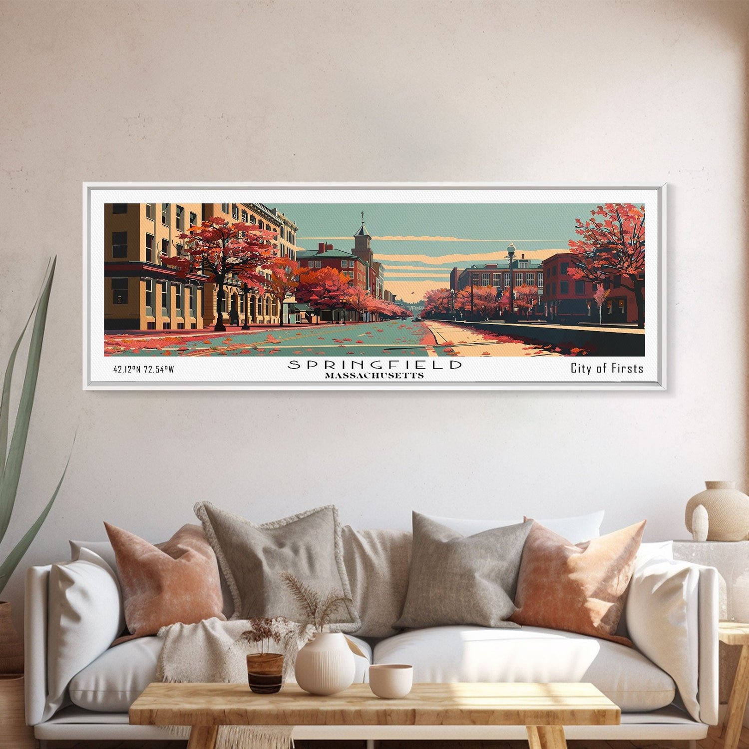 Springfield Massachusetts Panoramic Wall Art, Mid Century Modern Framed Canvas Print, Retro Pop Art Cityscape, Travel Poster, Living Room Decor