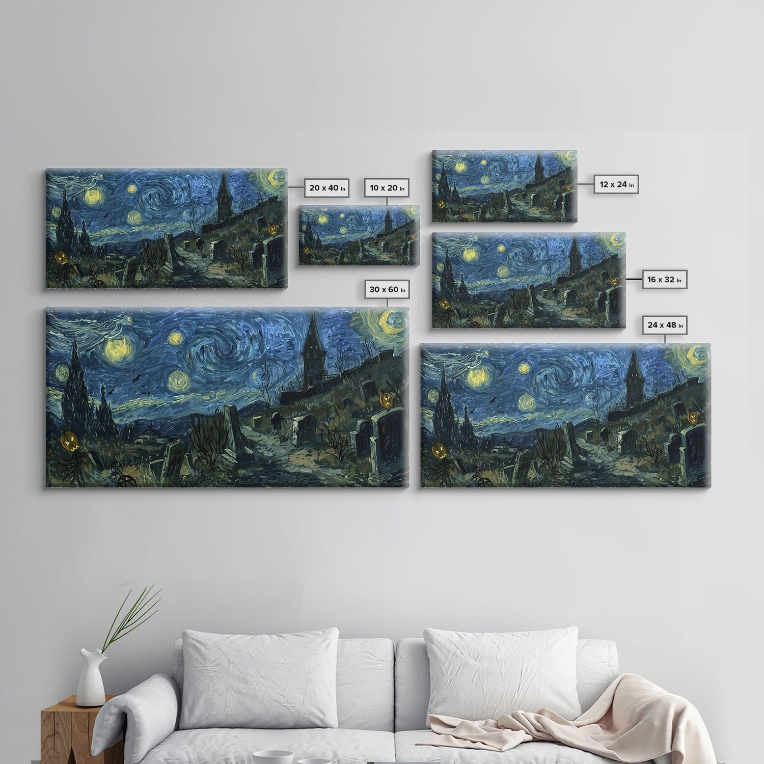Starry Night Inspired Haunted Cemetery Framed Canvas Print, Halloween Wall Decor, Art Prints, Creepy Art, Spooky Vibes - 10x20 Inches / No Frame - Stretched Canvas Only está agotado y se enviará tan pronto como vuelva a estar disponible.