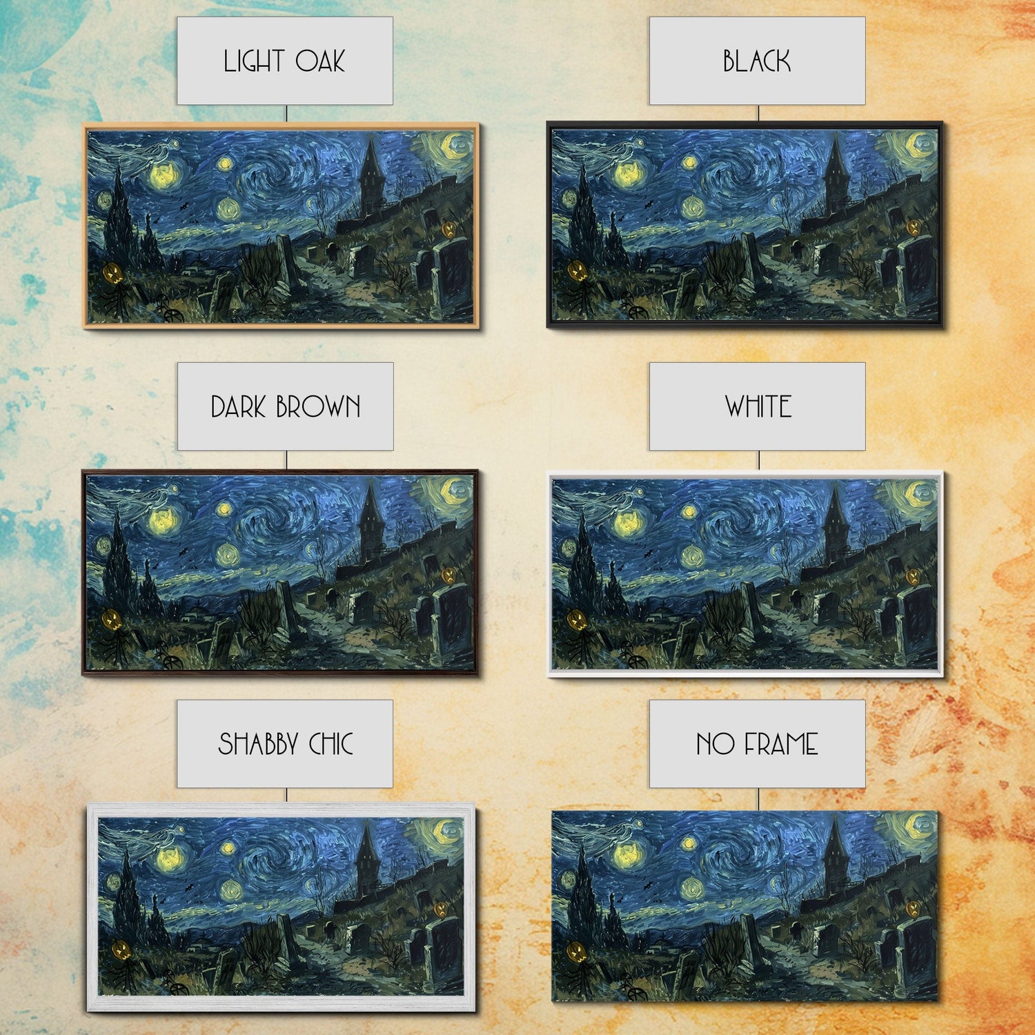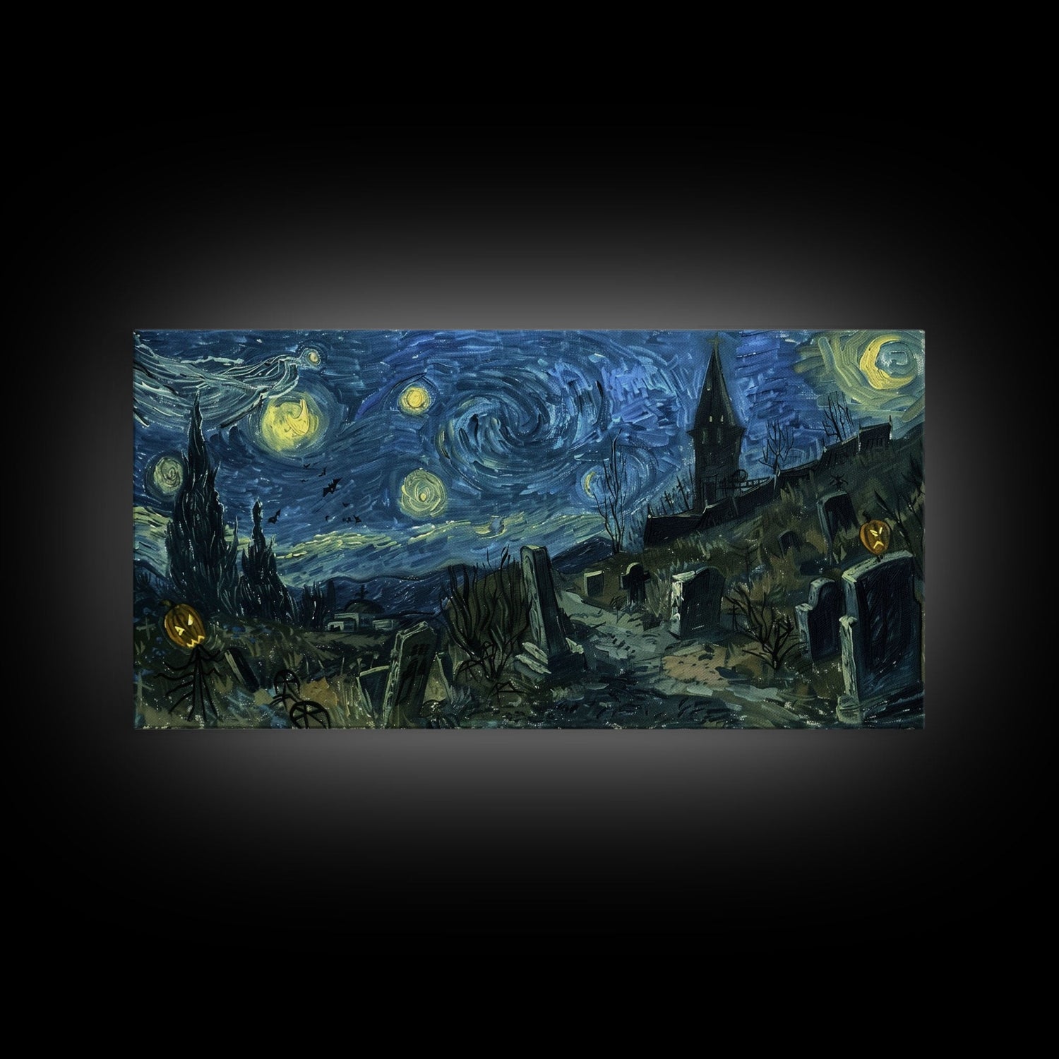 Starry Night Inspired Haunted Cemetery Framed Canvas Print, Halloween Wall Decor, Art Prints, Creepy Art, Spooky Vibes