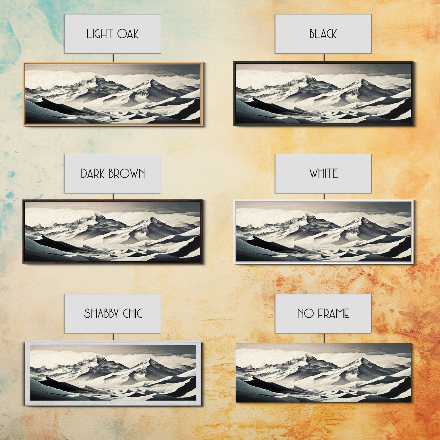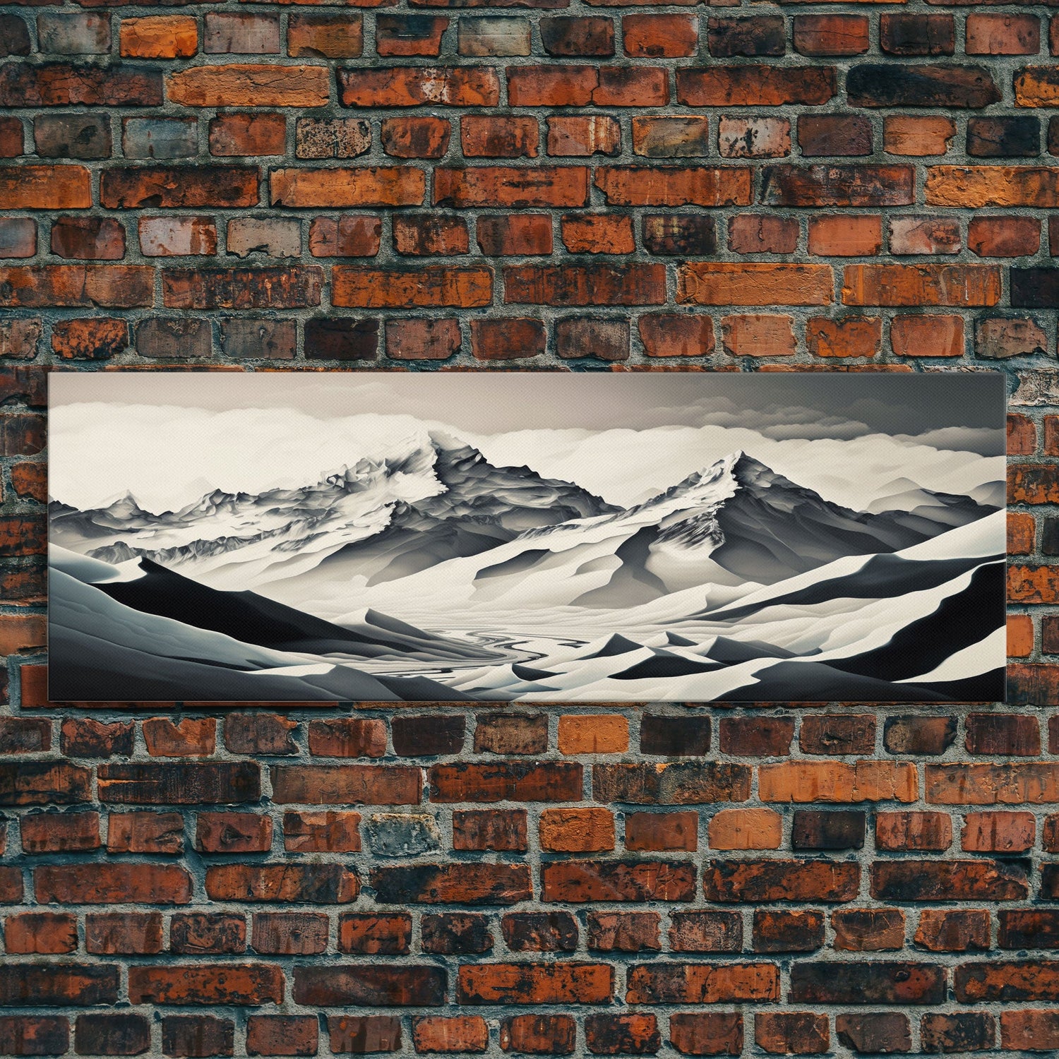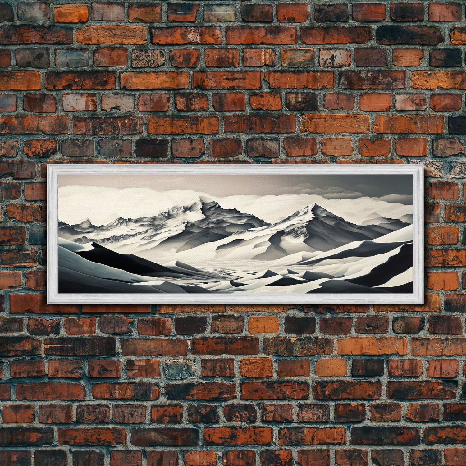 Stunning Panoramic Framed Canvas Print - Black and White Watercolor Landscape Painting - Snow Covered Mountain Art