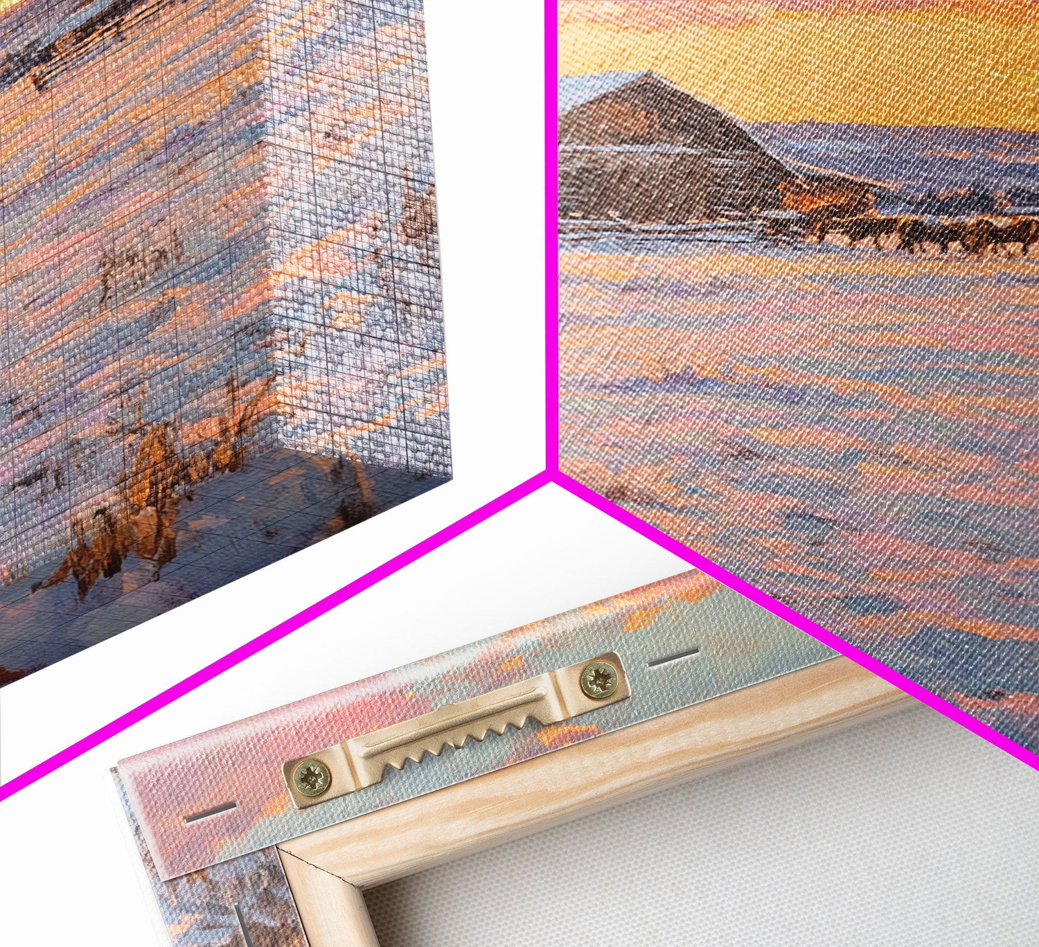 Sunset Over Snowy Ranch Framed Canvas Print Winter Wonderland Scene With Cabin In Snow Christmas Home Decor And Winter Landscape Art