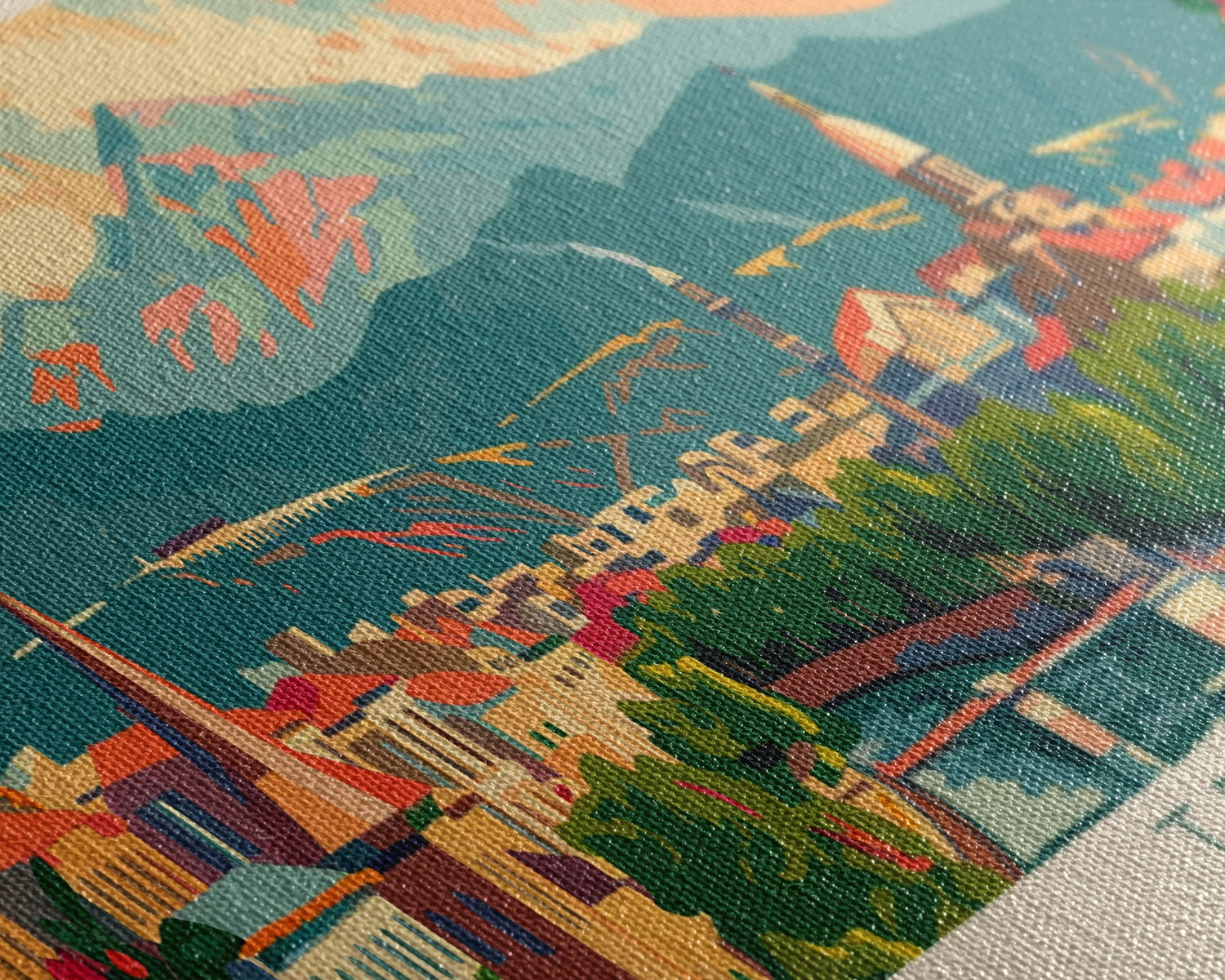 Most of our canvases are made in the USA, with the exception of canvases ordered with the light oak unstained frames, and any large canvases (24x48, 30x60, 16x48 and 20x60) ordered WITH a frame. These are temporarily made in and shipped from Europe, while we try to find a more consistent supplier in the USA.