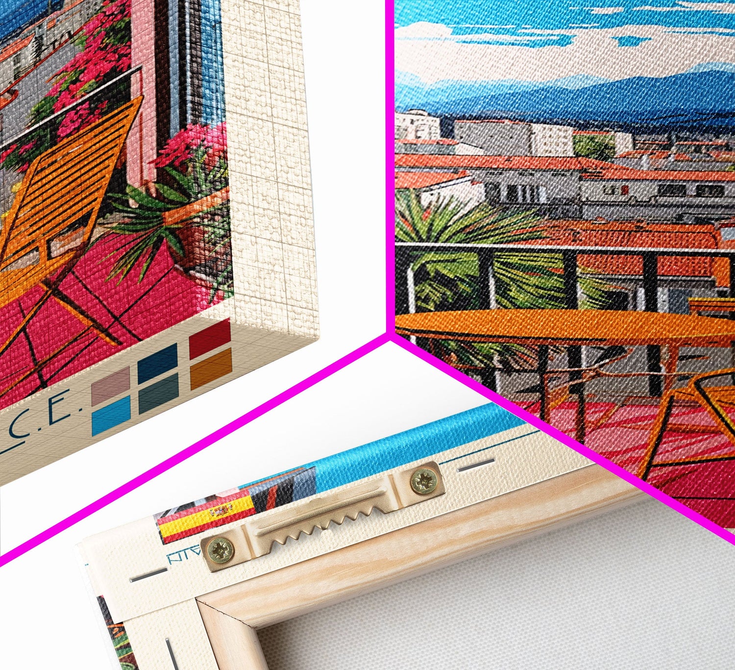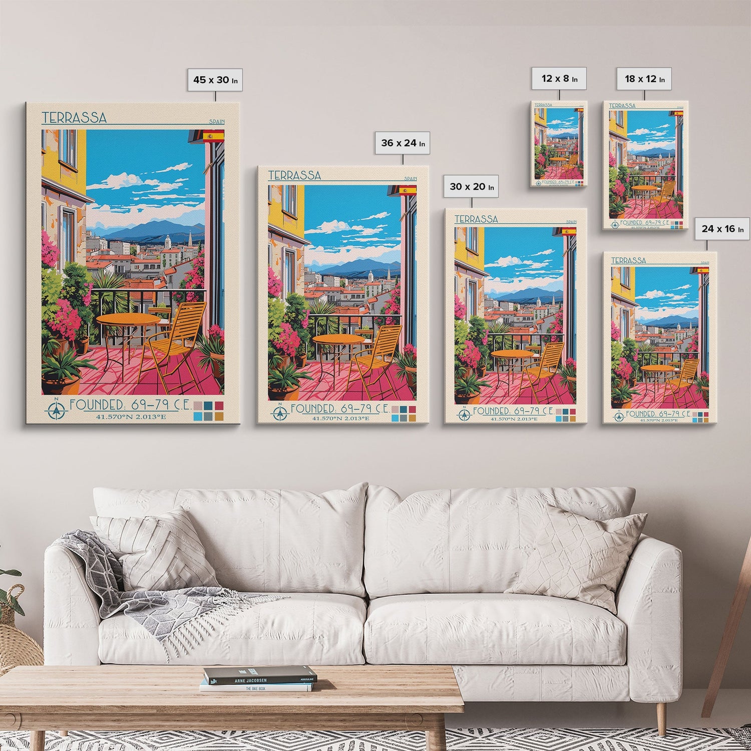 Terrassa Spain Travel Poster Framed Canvas Print, Midcentury Modern Art, Pop Art Wall Decor, Living Room Art, Home Decoration