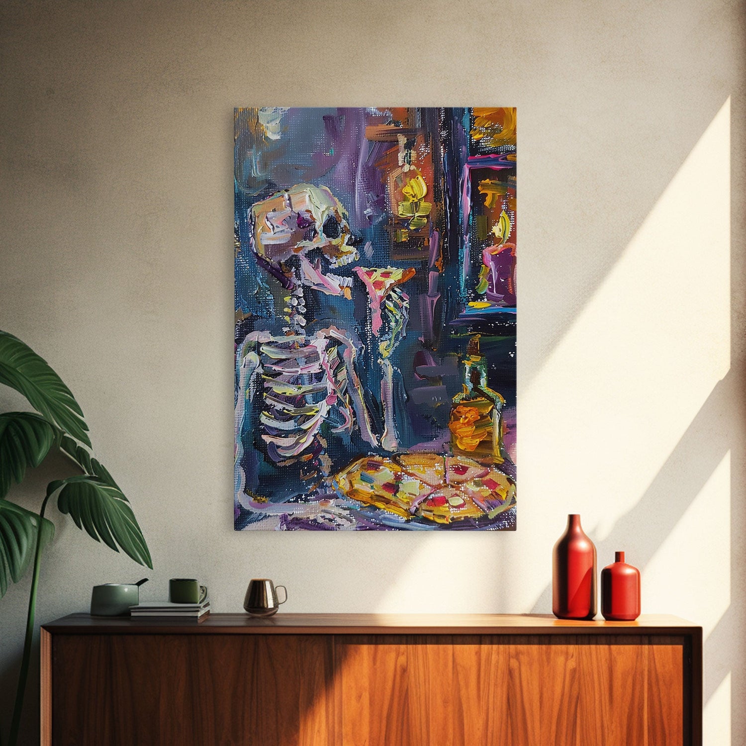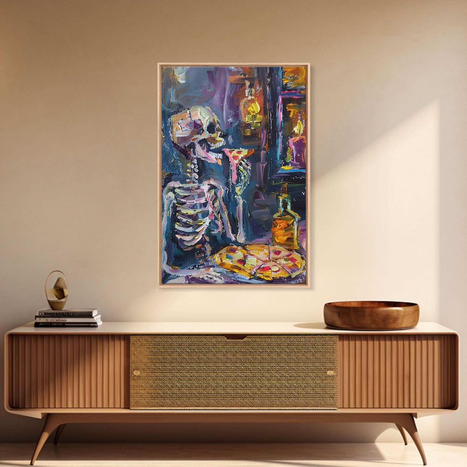 The Hungry Skeleton Chomps a Pizza, Funny Halloween Art, Framed Canvas, Halloween Poster