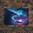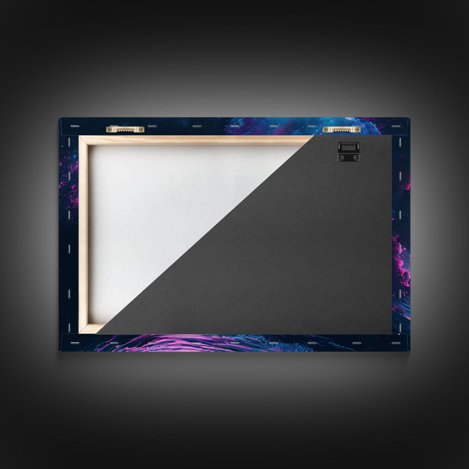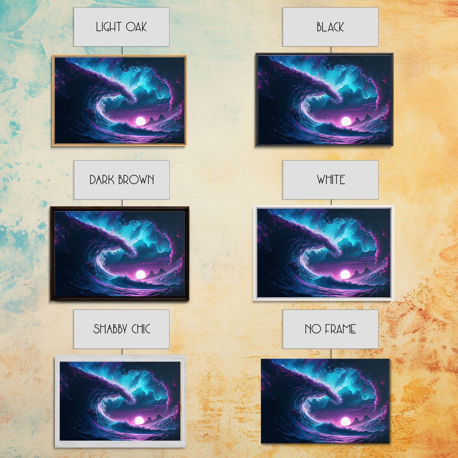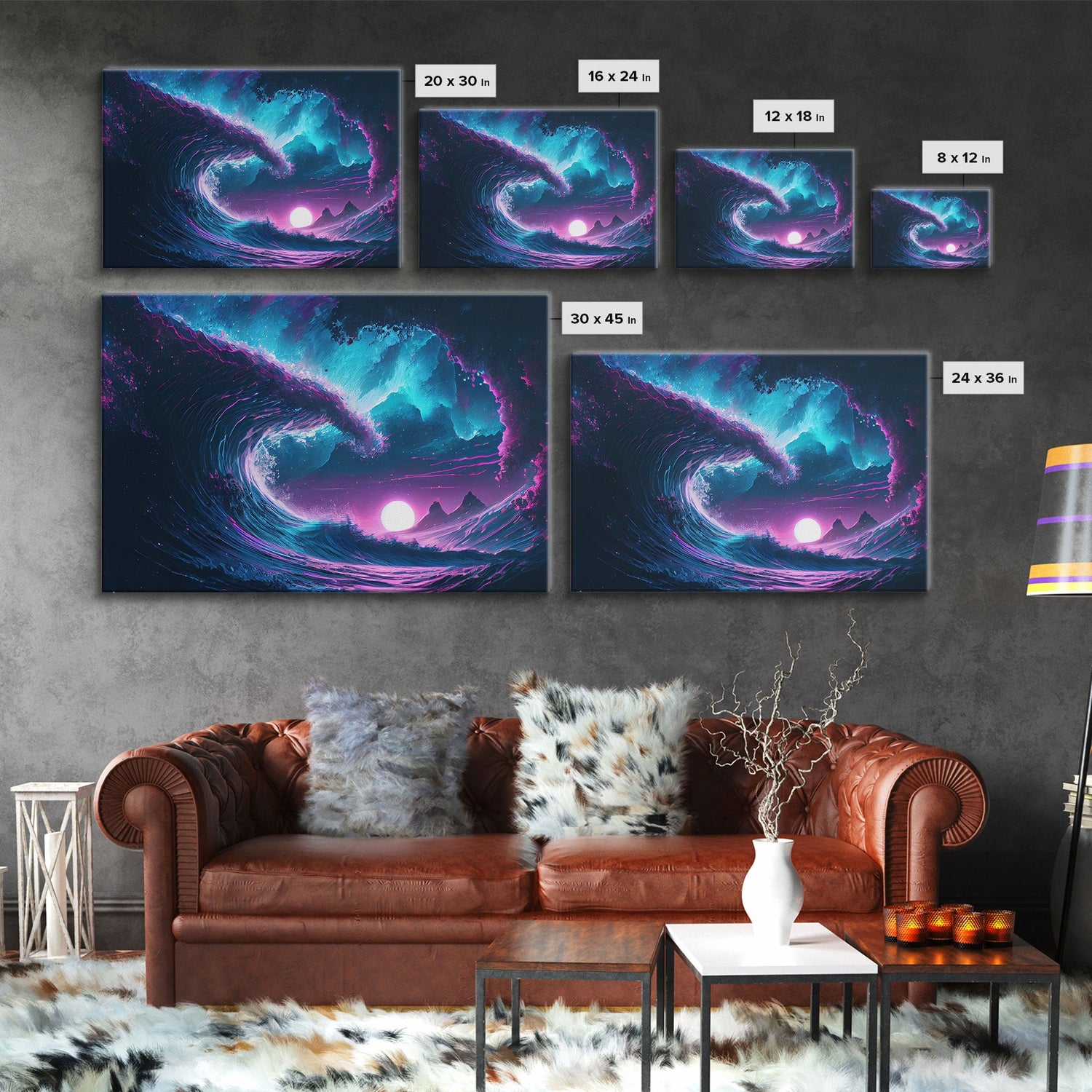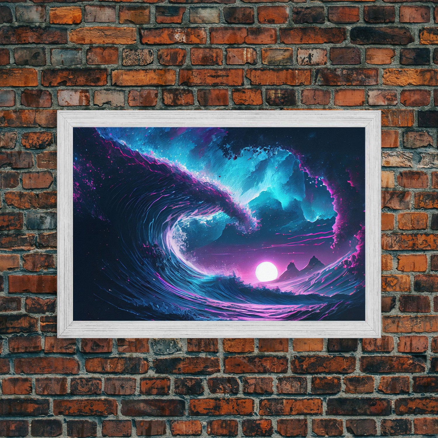 The Wave, Synthwave style ocean art, sunset in a wave, framed canvas print