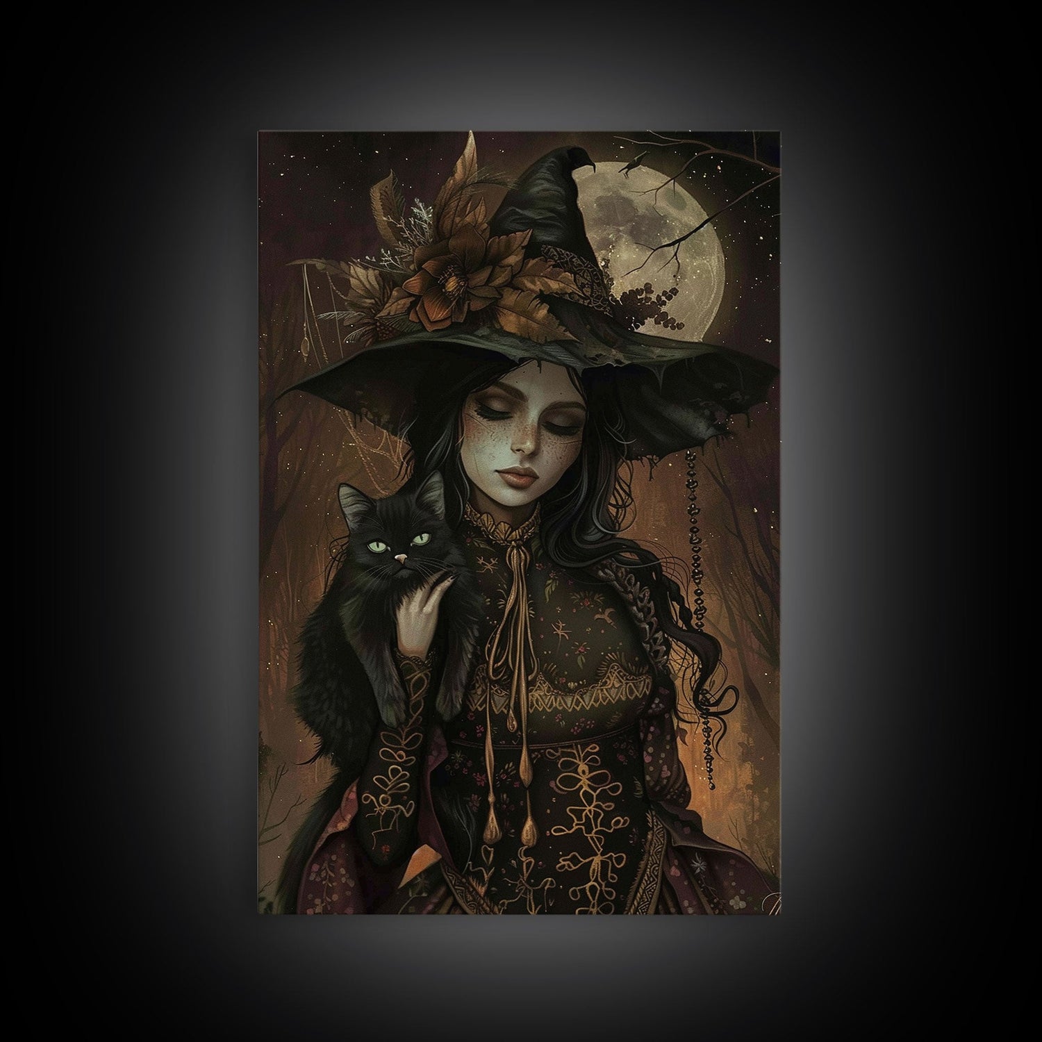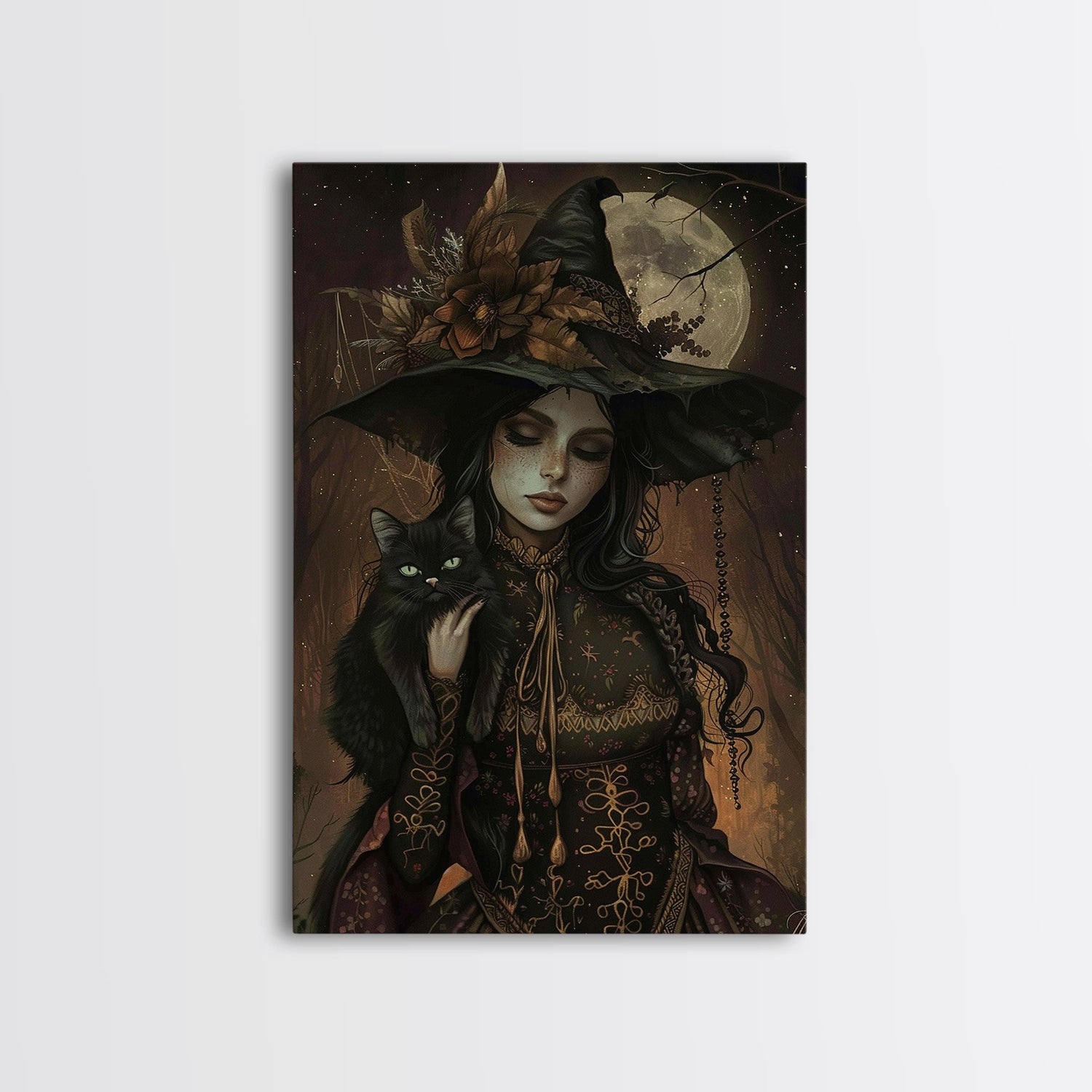 The Witch and The Black Cat Framed Canvas Art, Spooky Victorian Witch Art, Spooky Season, Halloween Props, Halloween Accessories Art