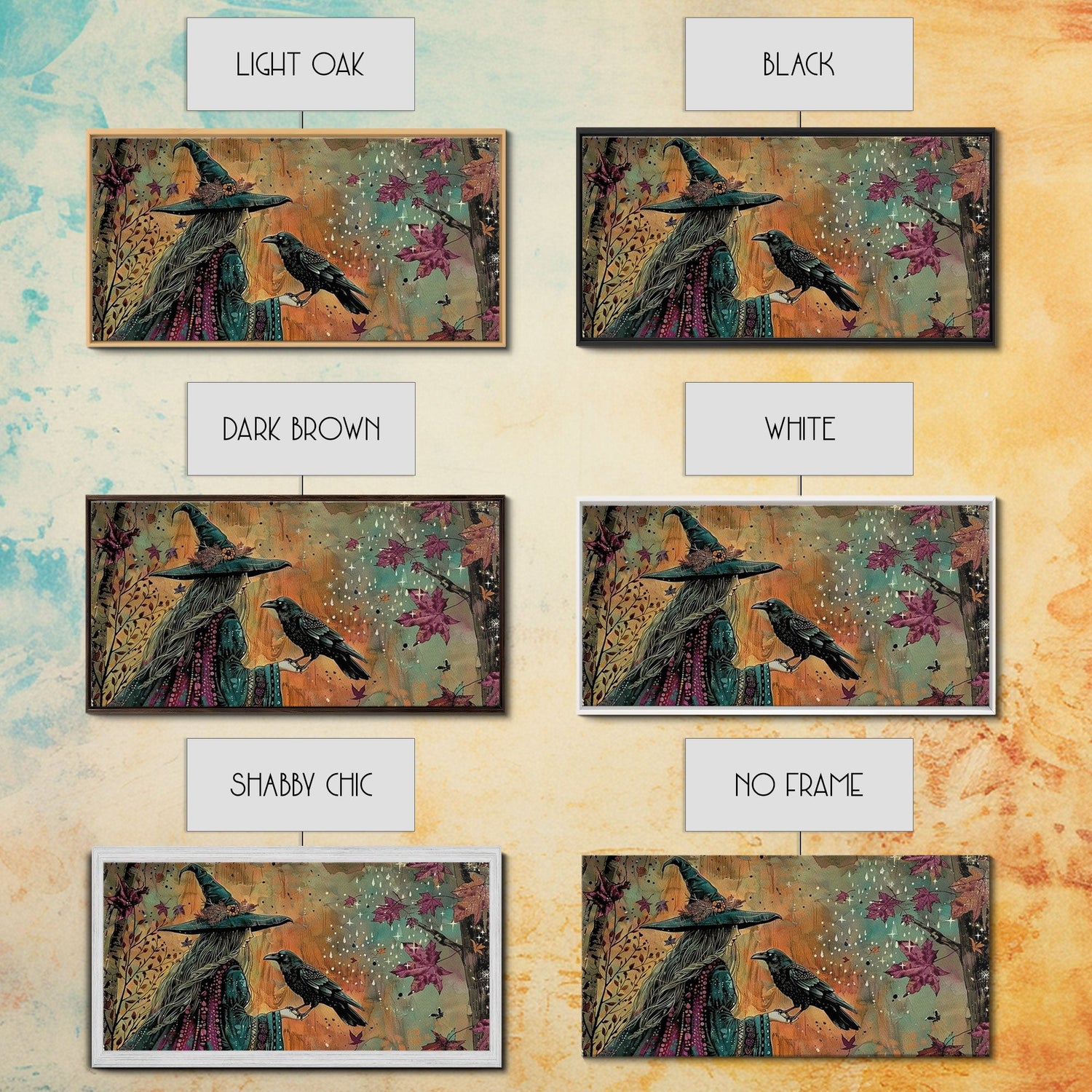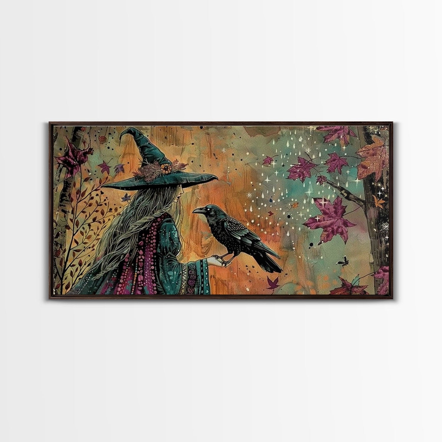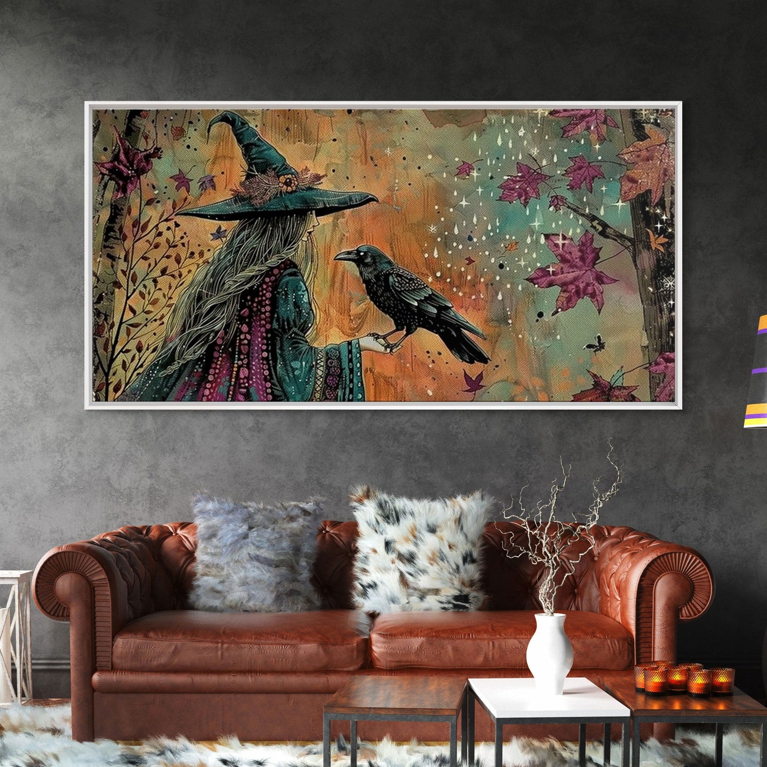 The Witch and The Raven Familiar, Framed Canvas Print, Halloween Gift, Halloween Props, Halloween Wall Art
