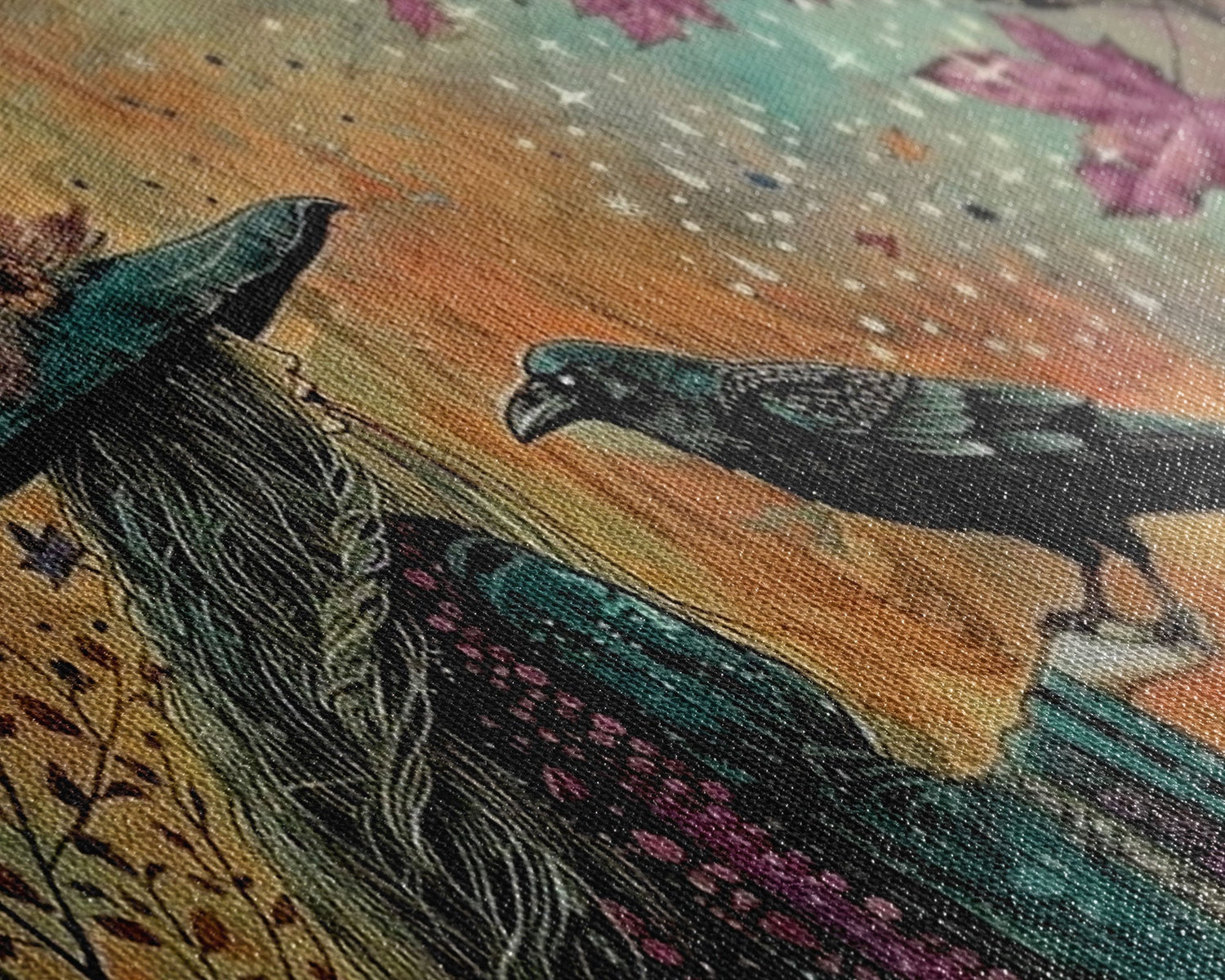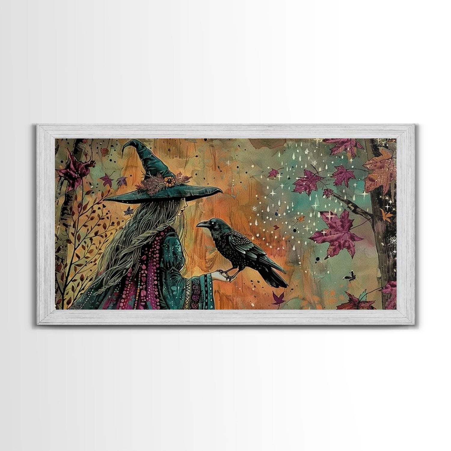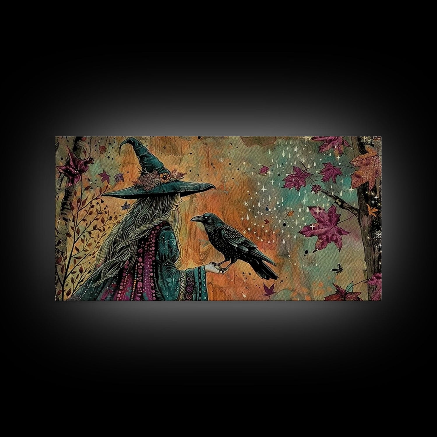 The Witch and The Raven Familiar, Framed Canvas Print, Halloween Gift, Halloween Props, Halloween Wall Art
