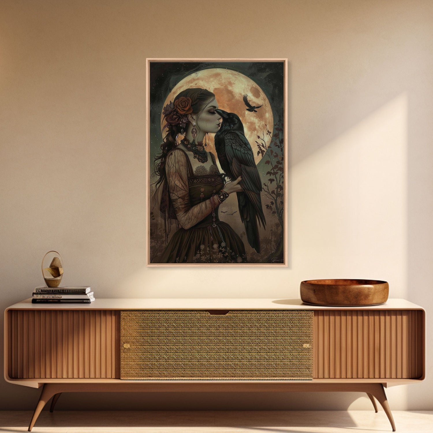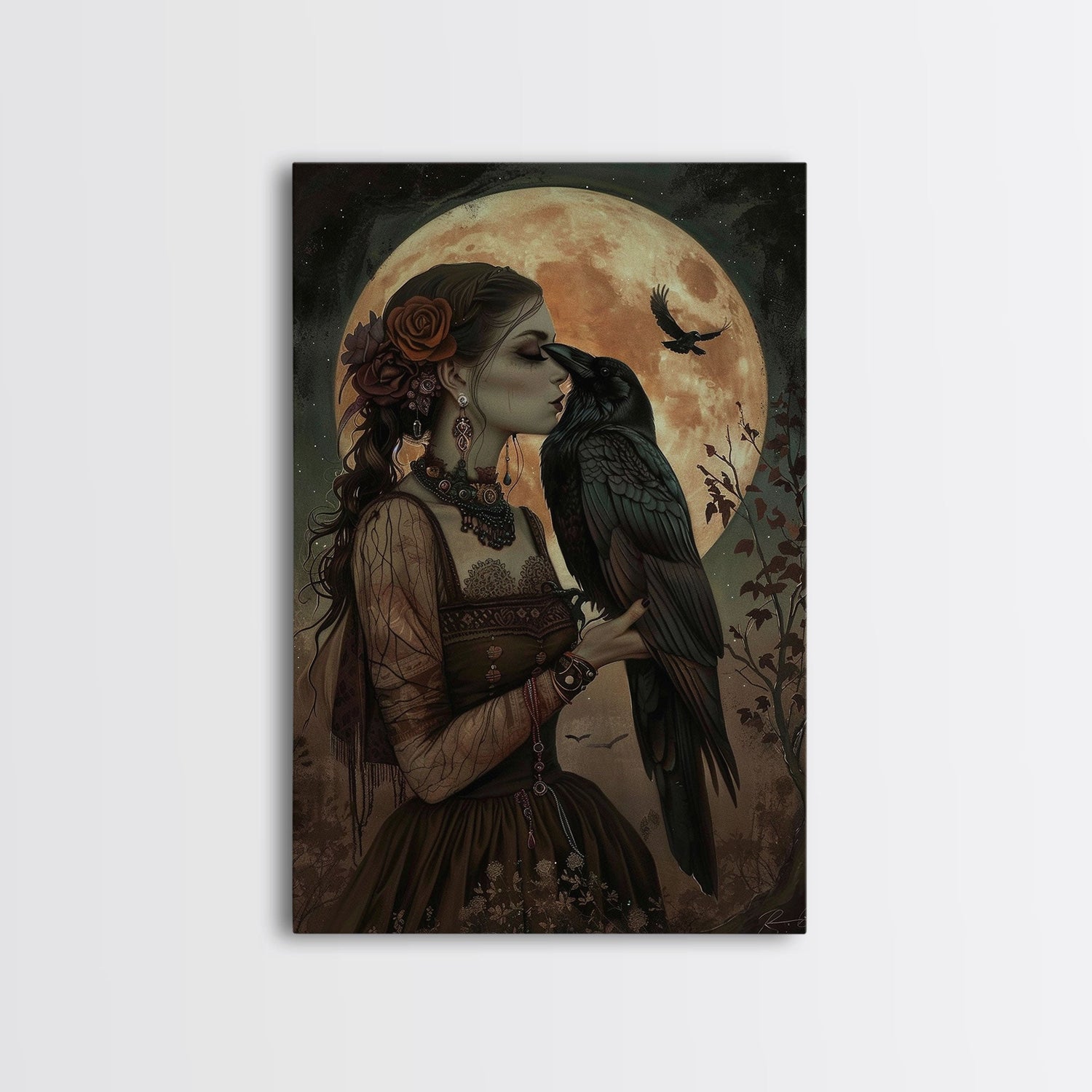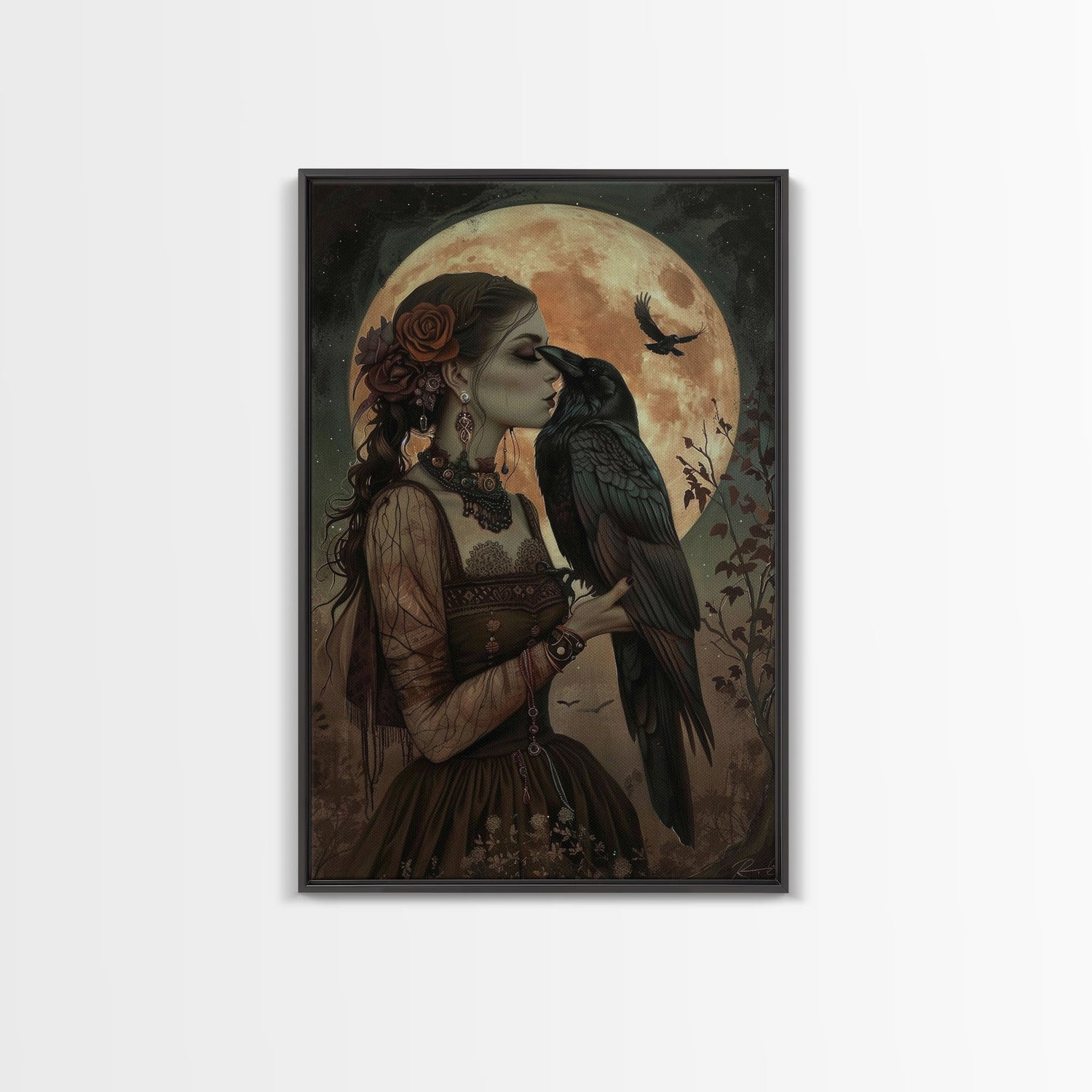 The Witch And The Raven, Framed Canvas Print, Raven Familiar, Victorian Witch Painting, Halloween Decor, Halloween Trinket, Spooky Wall Art