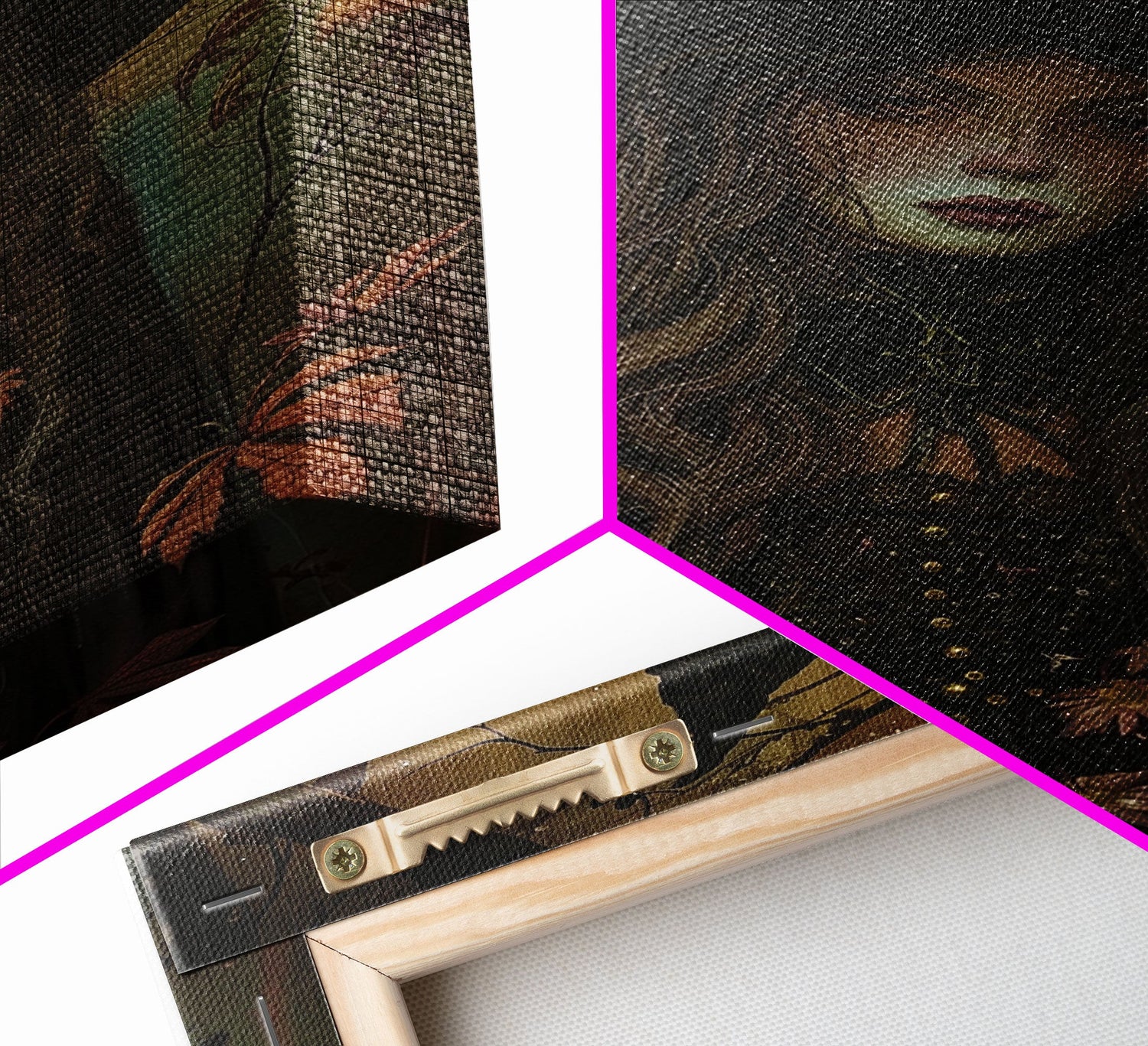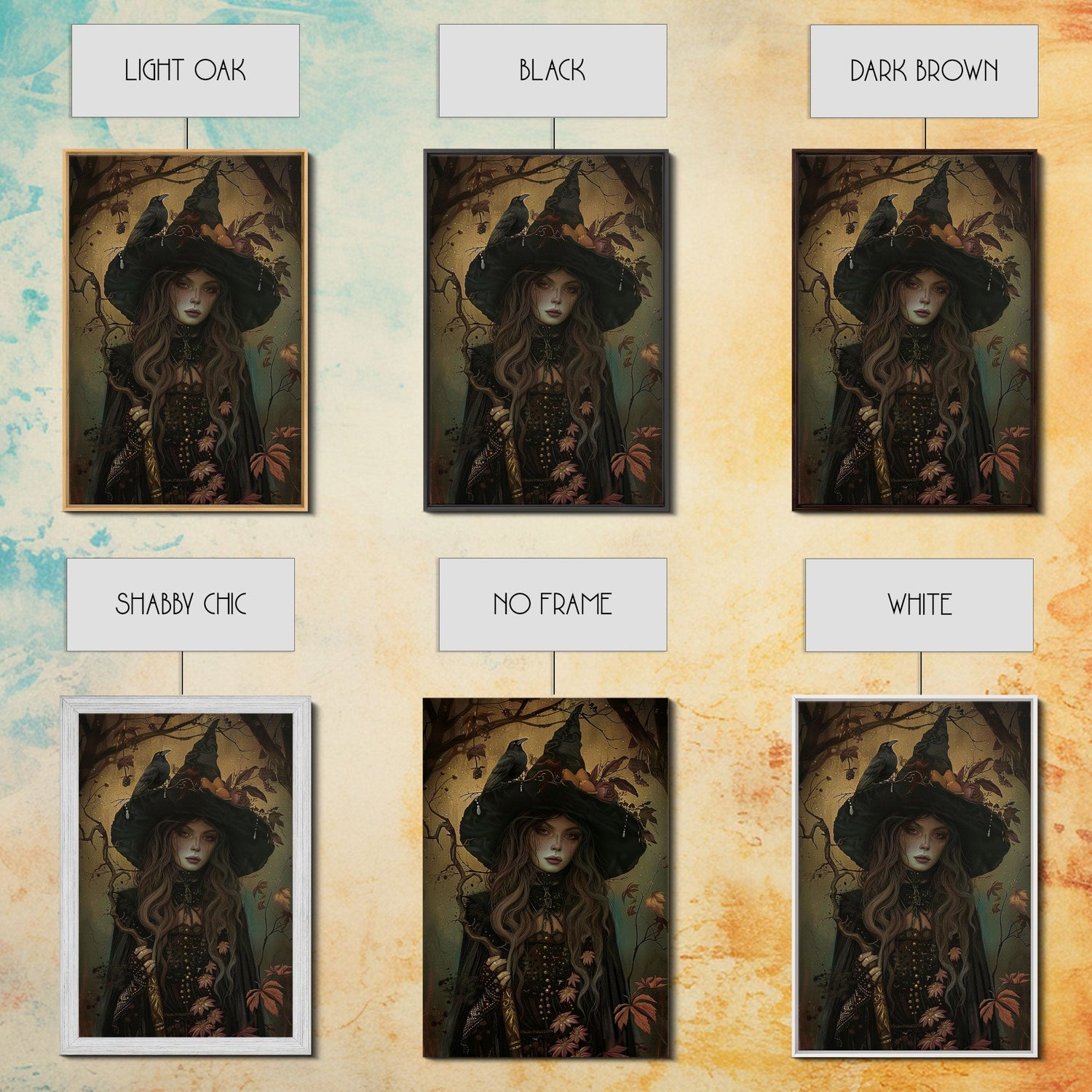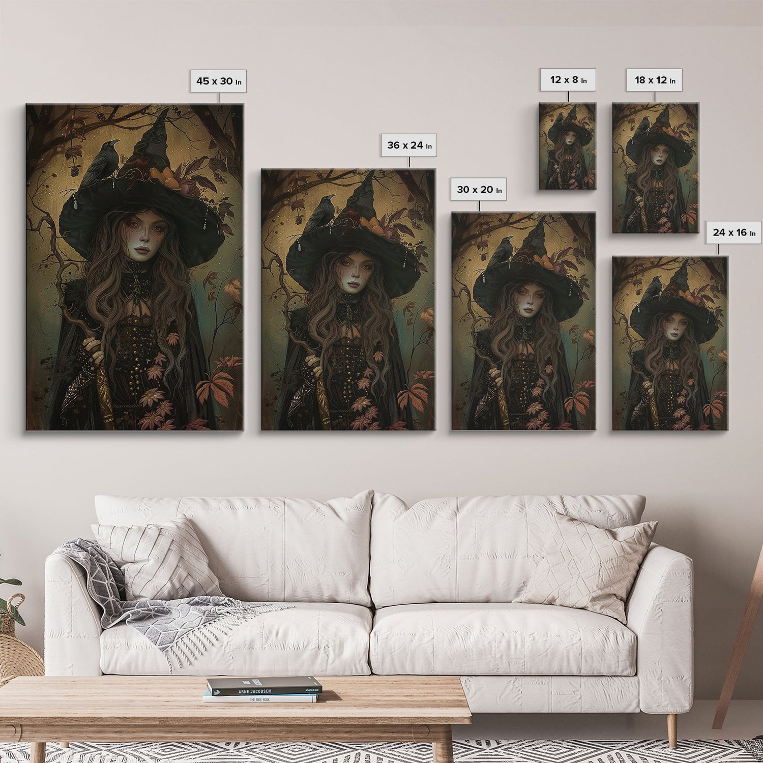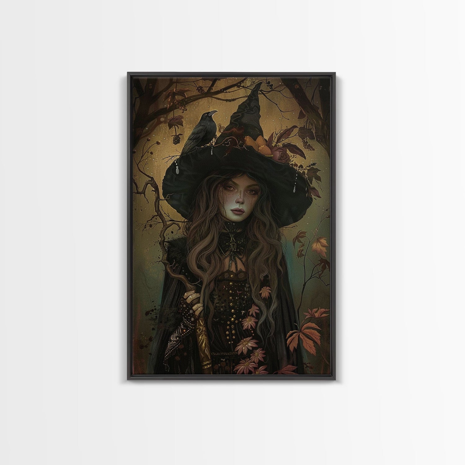 The Witch And The Raven, Framed Canvas Print, Raven Familiar, Victorian Witch Painting, Halloween Decor, Halloween Trinket, Spooky Wall Art