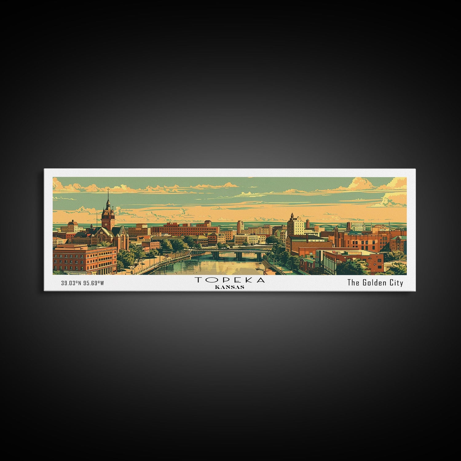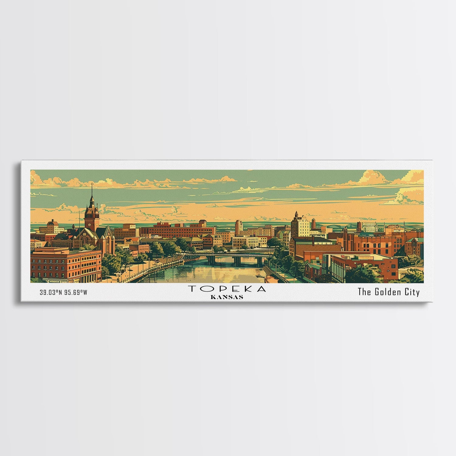 Topeka Kansas Panoramic Painting, Mid Century Modern Framed Canvas Print, Retro Pop Art Travel Poster, Home and Office Wall Art Decor