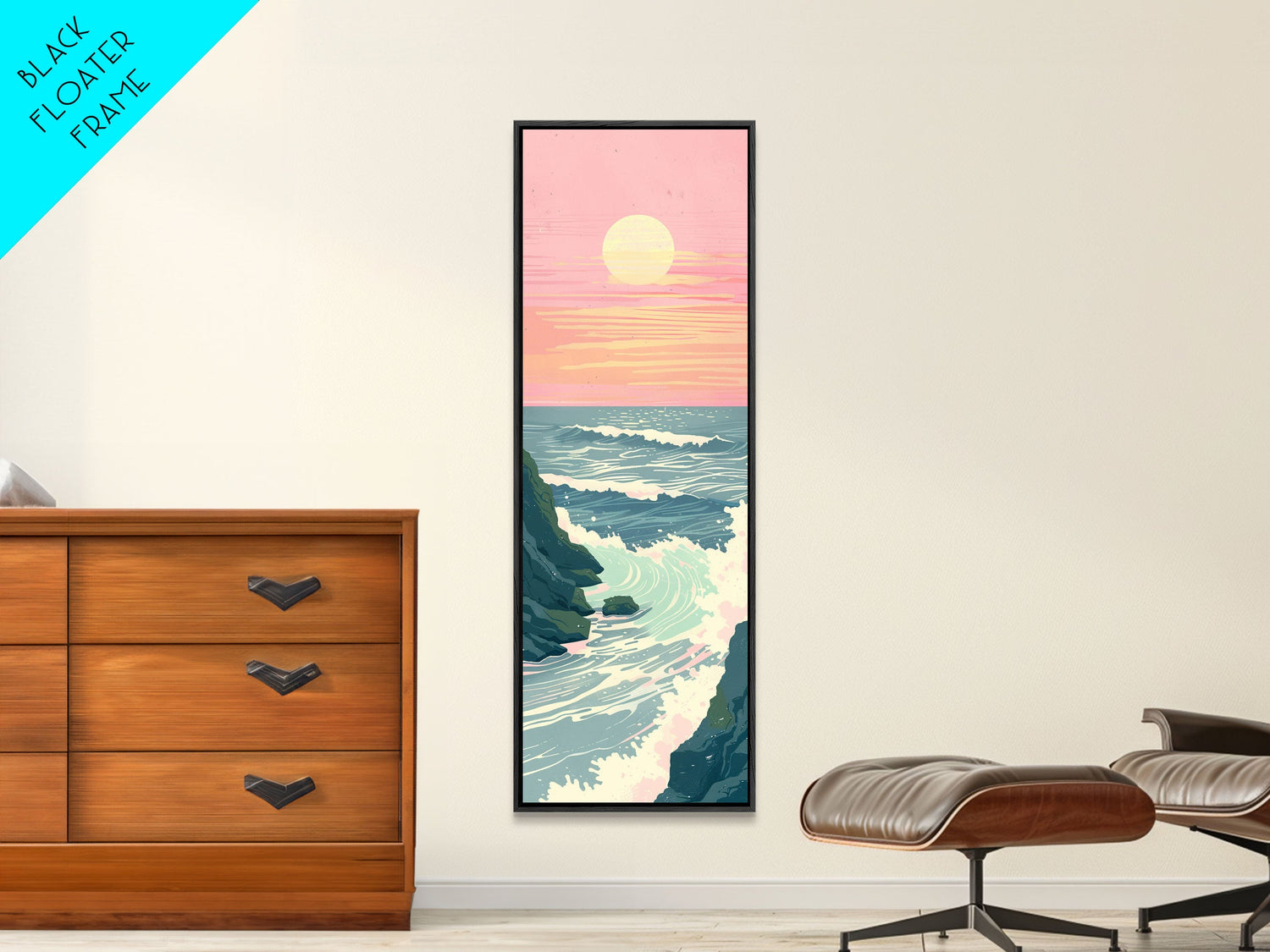 Tranquil Ocean Sunset with Soft Waves Crashing against Rocky Shoreline - Skinny Art, Japanese Wall Decor, Framed Canvas Print, Ukiyo-e Style