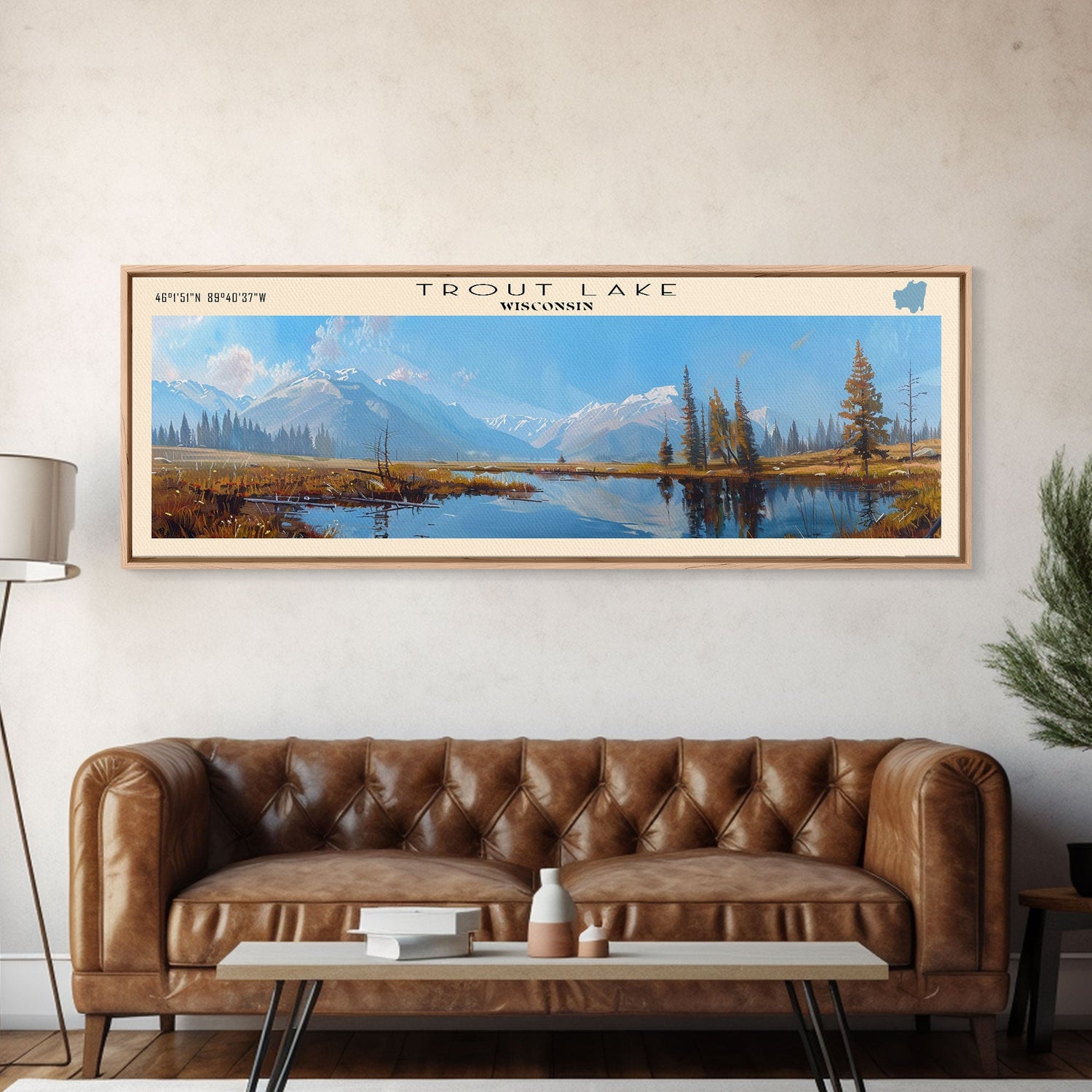 Trout Lake Panoramic Wall Art, Framed Canvas Print, Lake House Decor, Travel Poster, Scenic Landscape, Living Room Art