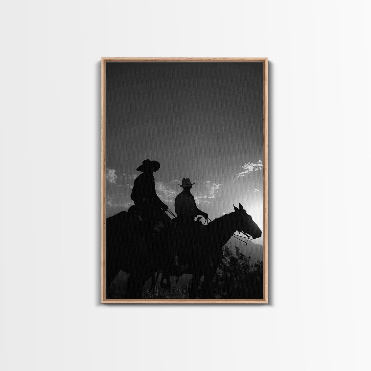 Two Cowboys Riding at Sunset in a Serene Black and White Western Landscape for Wall Art, Canvas Prints, Home Decor, Living Room Art