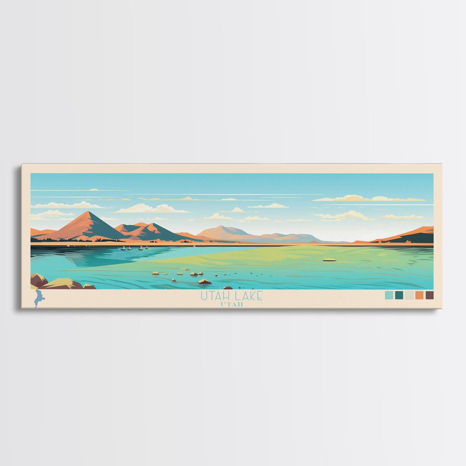 Utah Lake, Utah Framed Canvas Print, Panoramic Lake House Decor, Midcentury Modern Art, Pop Art, Travel Poster, Bedroom Wall Art