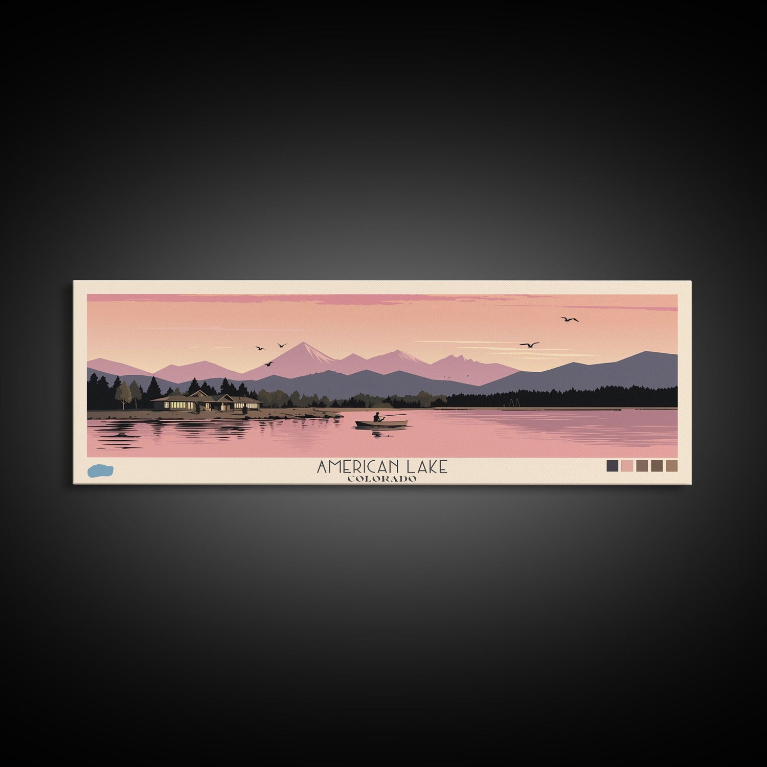 American Lake Colorado Framed Canvas Print, Panoramic Travel Poster, Pop Art, Midcentury Modern Wall Art, Scenic Bedroom Art