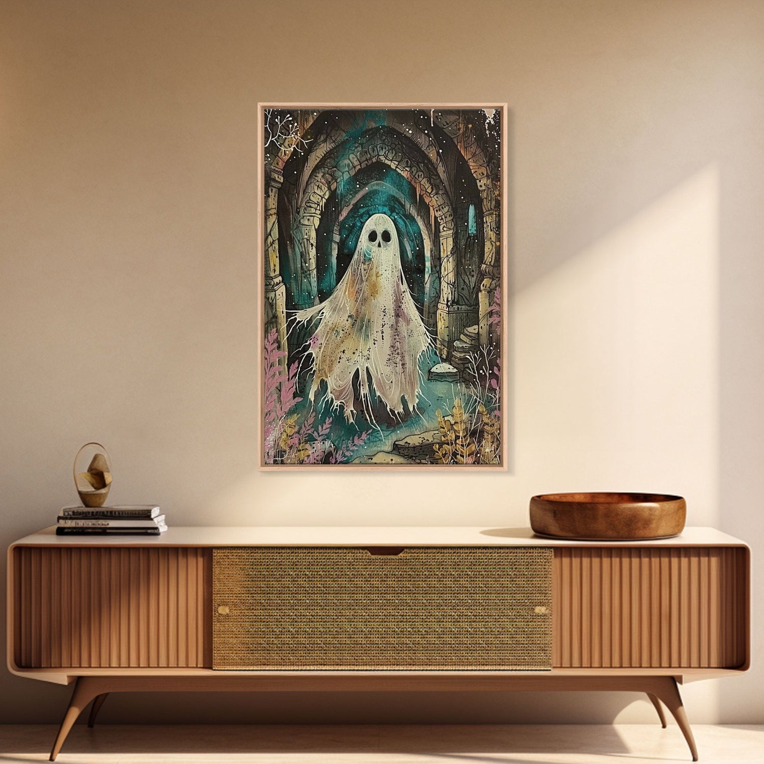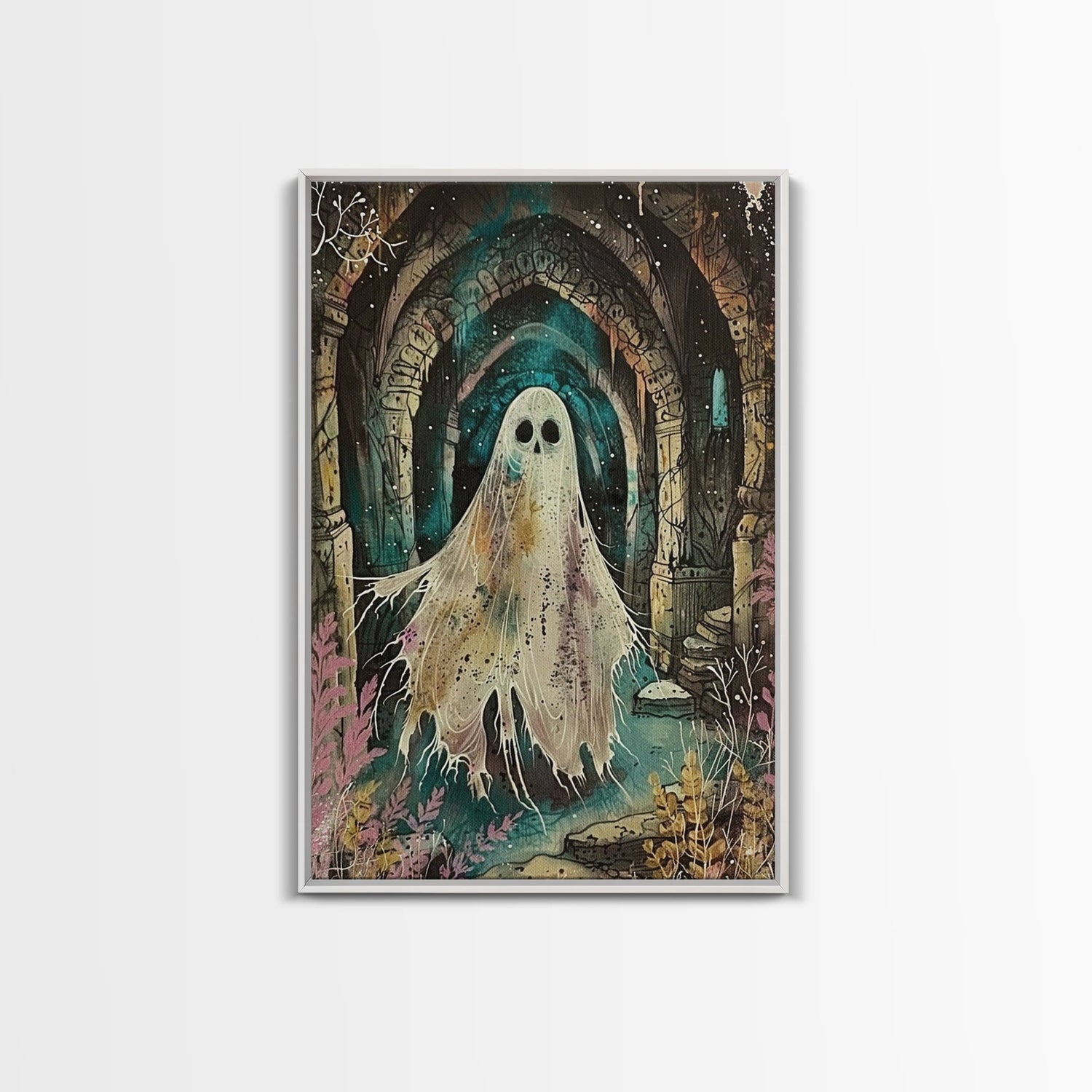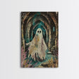Ghostly Figure in Ancient Ruins Framed Canvas Print, Haunted Ruins Decor, Halloween Ghost Art, Eerie Ghostly Wall Art, Spooky Ghost Print