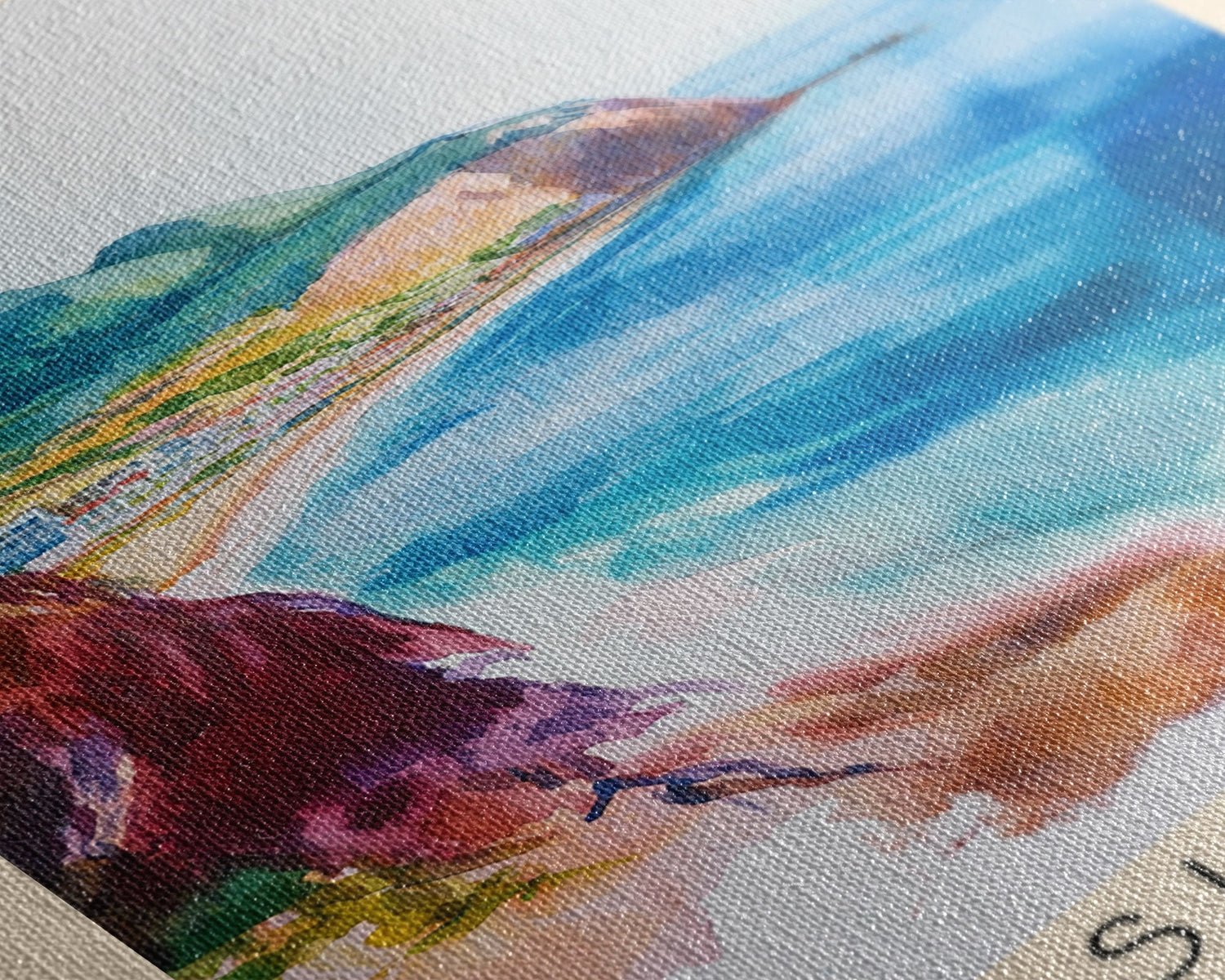 Most of our canvases are made in the USA, with the exception of canvases ordered with the light oak unstained frames, and any large canvases (24x48, 30x60, 16x48 and 20x60) ordered WITH a frame. These are temporarily made in and shipped from Europe, while we try to find a more consistent supplier in the USA.