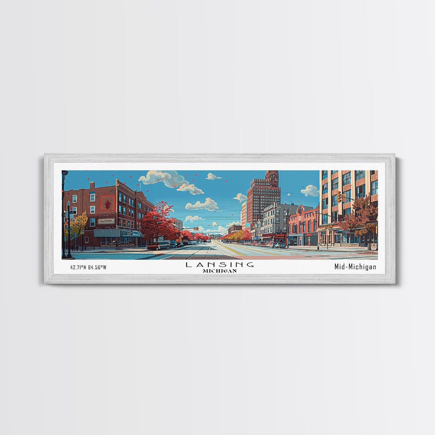 Lansing Michigan Panoramic Wall Art, Mid Century Modern Framed Canvas Print, Retro Pop Art Travel Poster, Living Room Decor