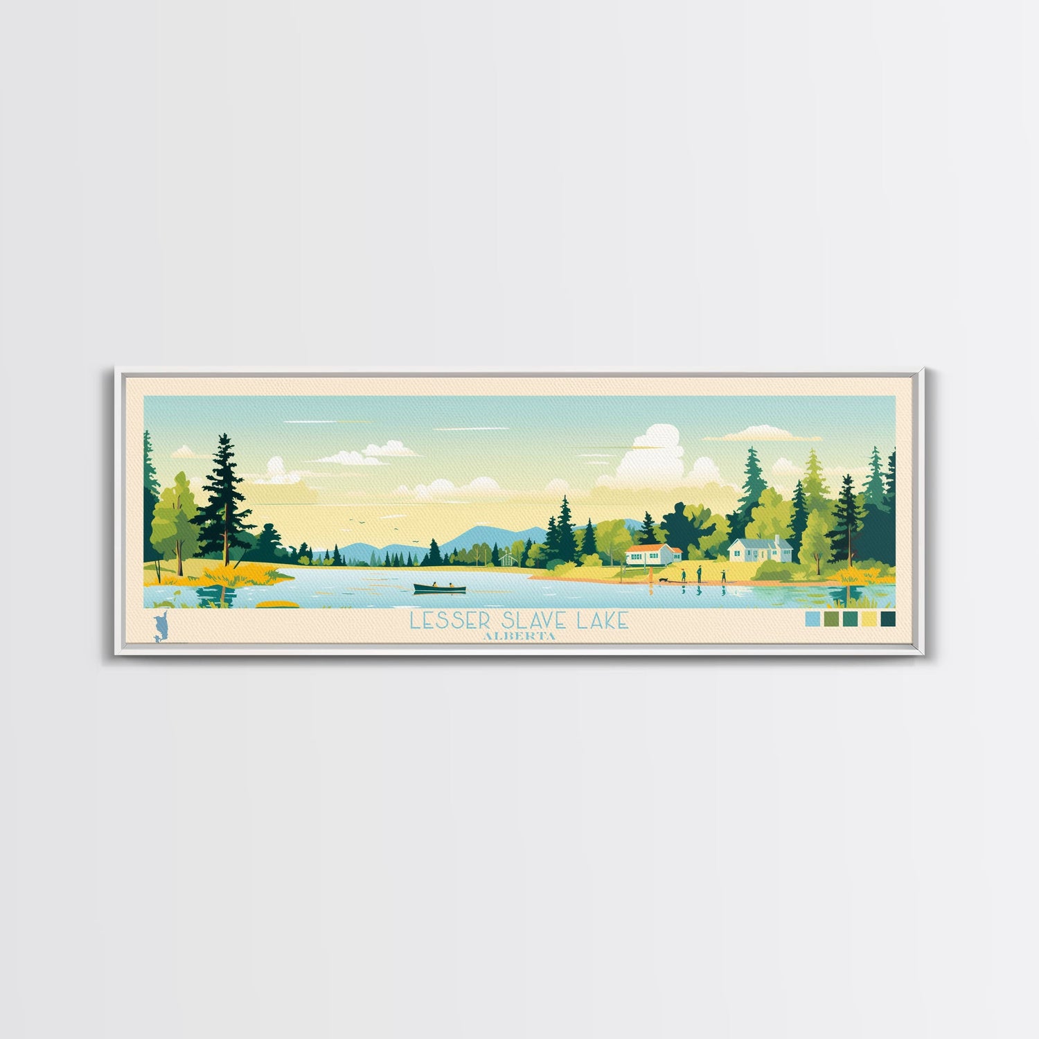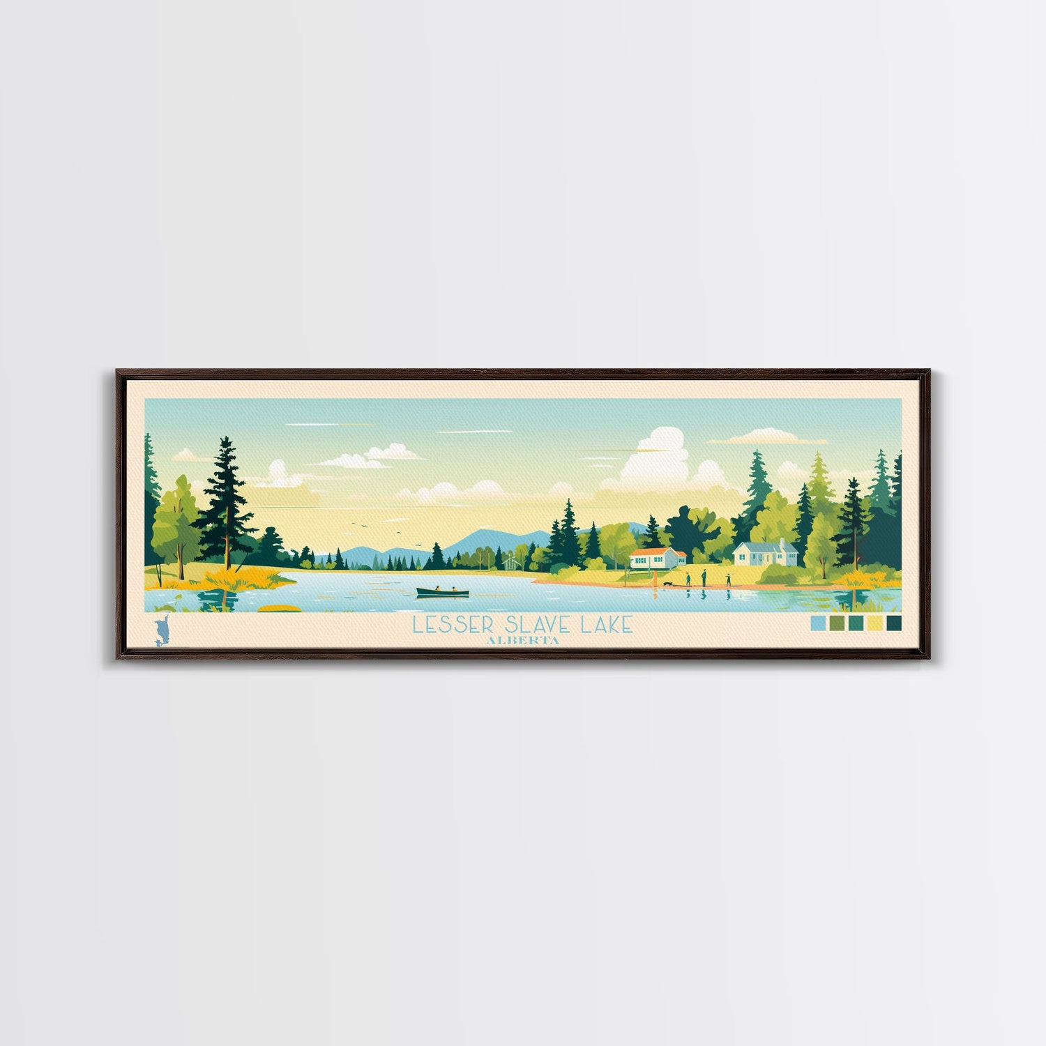 Lenore Lake, Saskatchewan Panoramic Wall Art Framed Canvas Print, Midcentury Modern, Pop Art, Home Decor, Travel Poster, Living Room Art